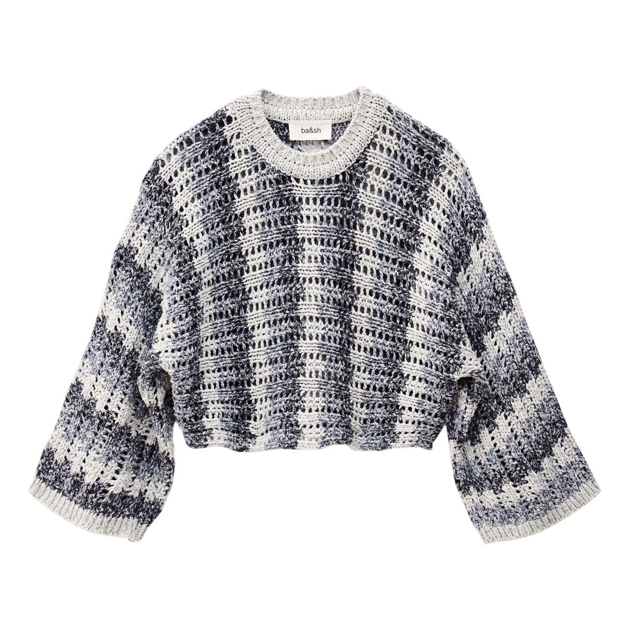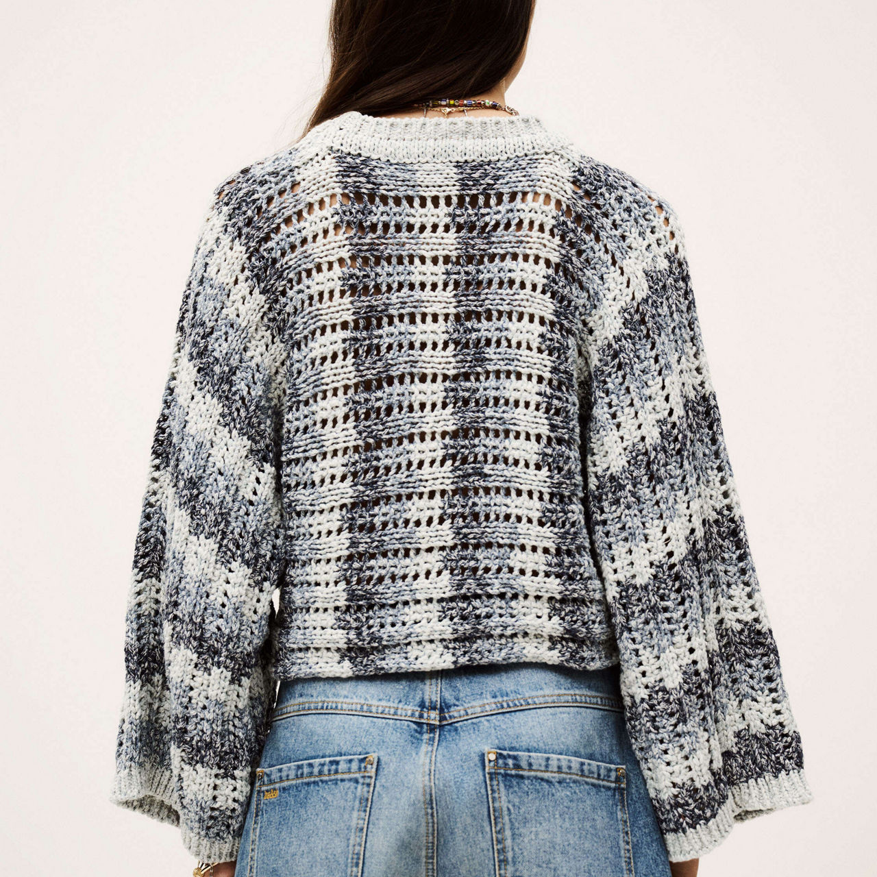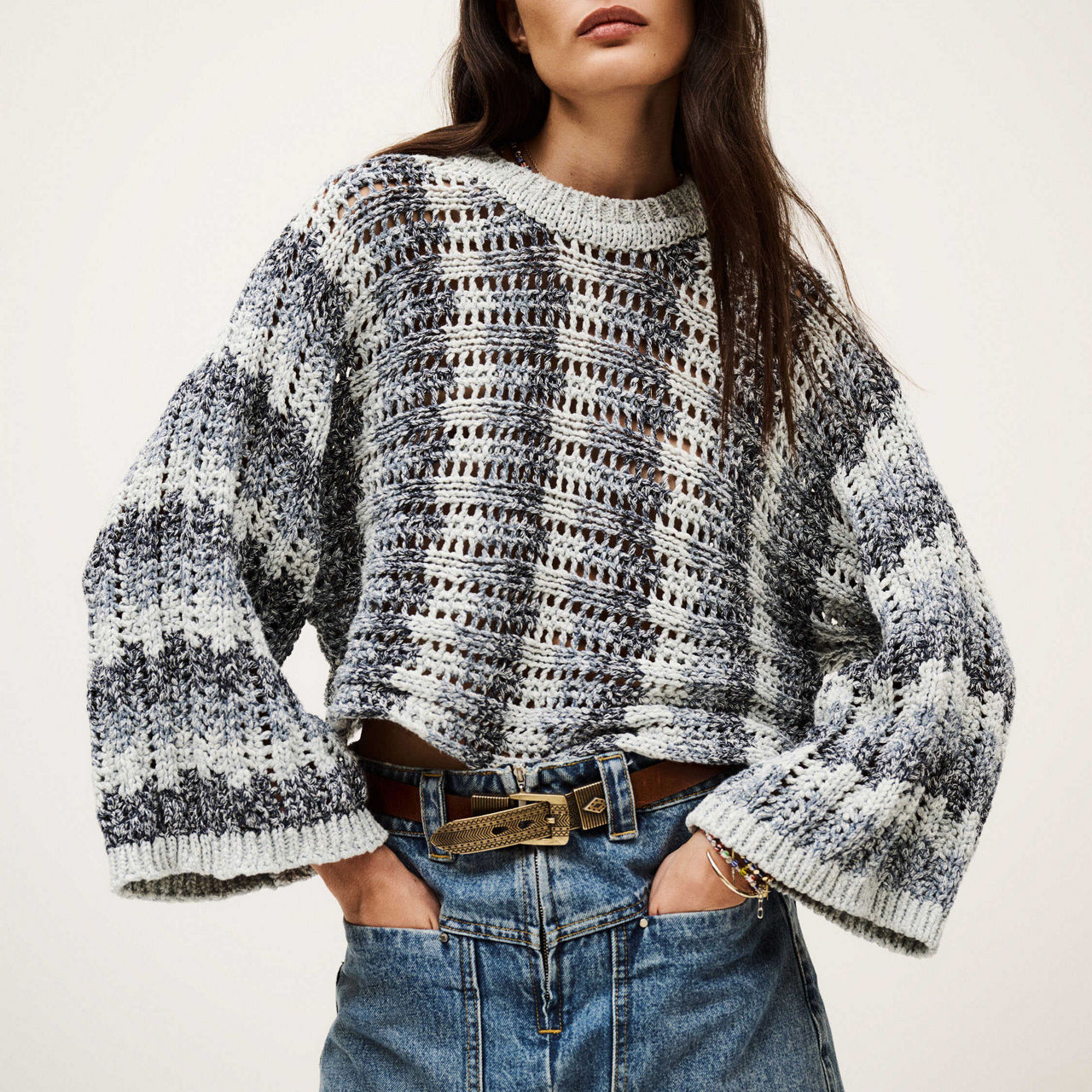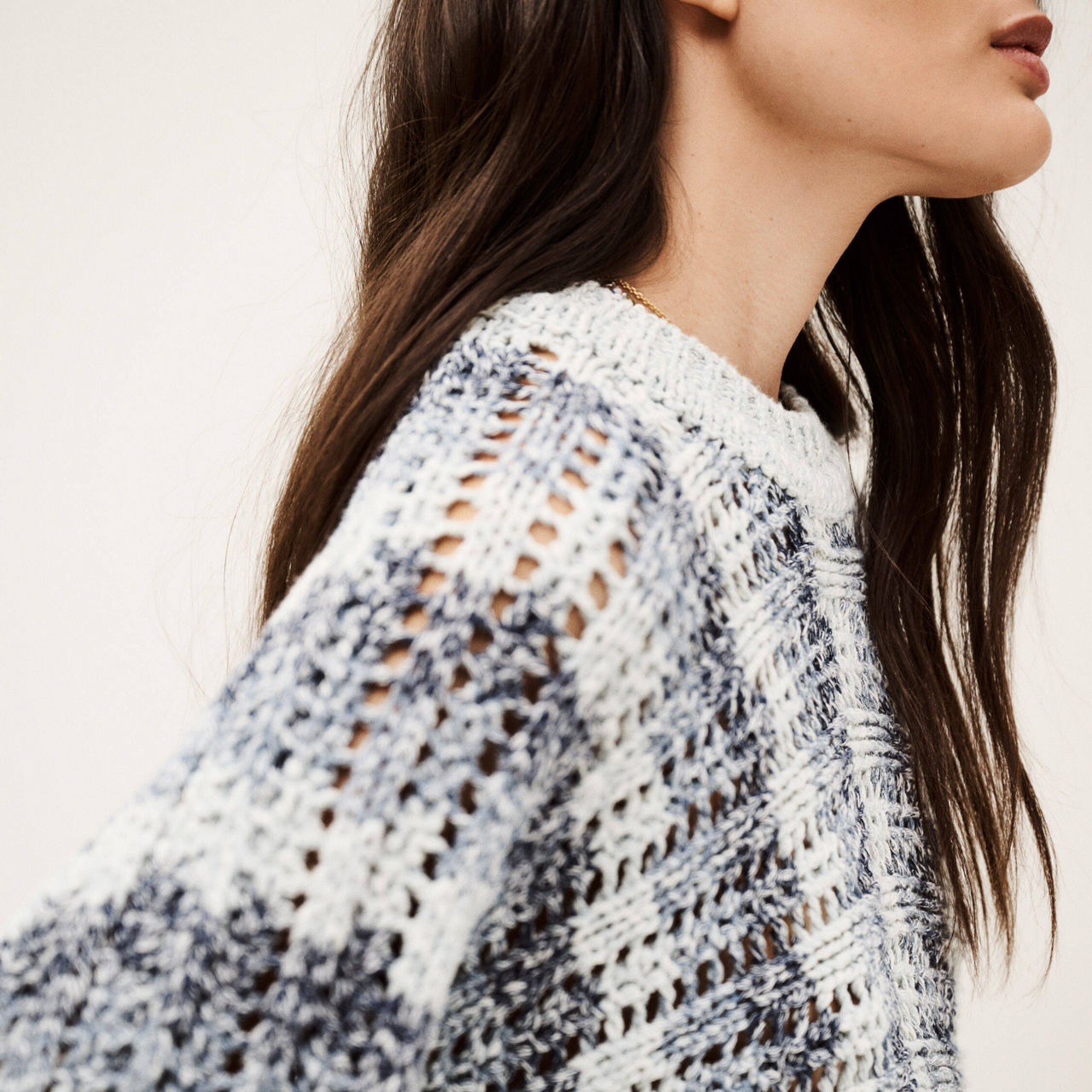 - Round neck, wide sleeves, ribbed trim, openwork texture