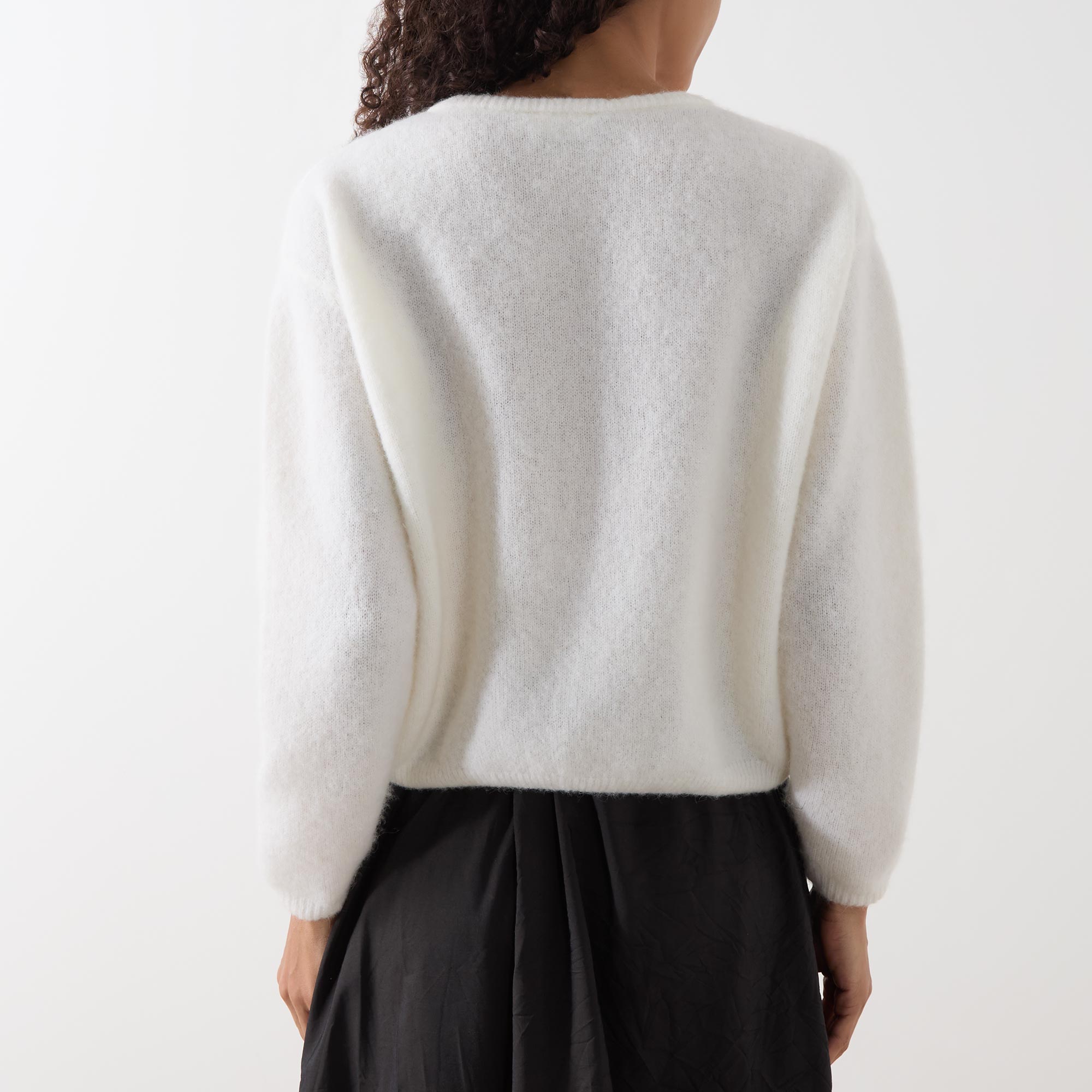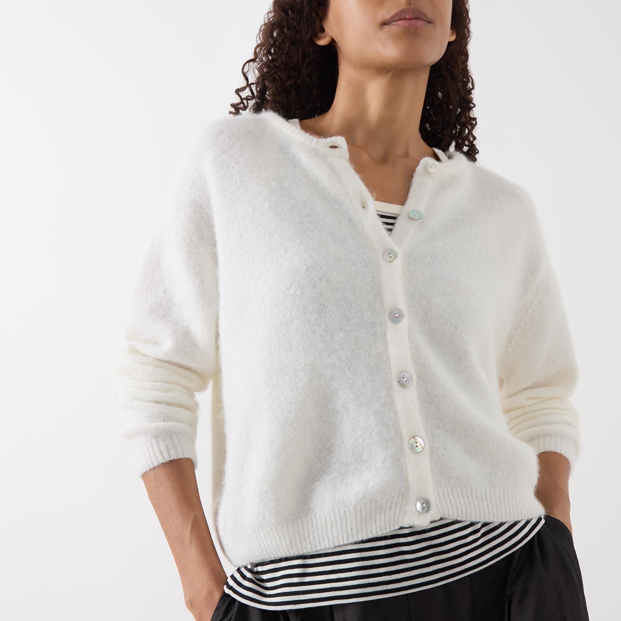 - Round neckline, long sleeves, ribbed trims, button fastening, compact knit structure, fluffy finish