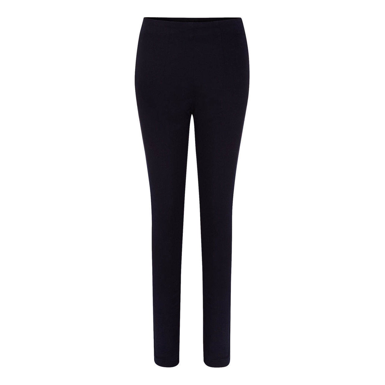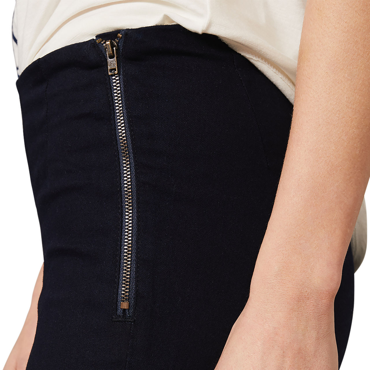 - Stretch-fused fabric, side zip fastening, full length, fitted silhouette, dark denim-style finish