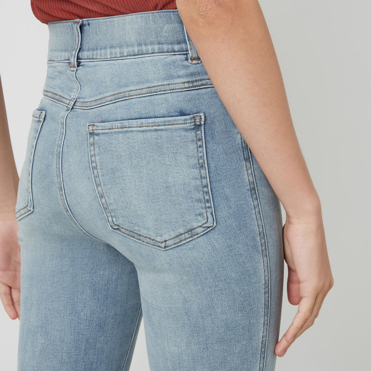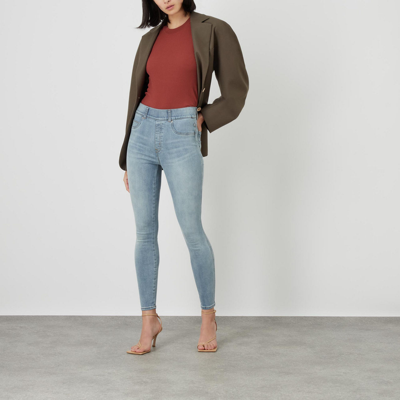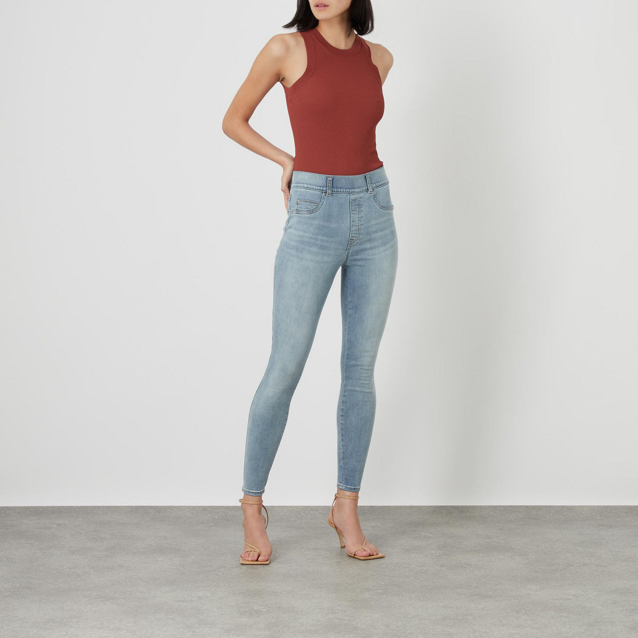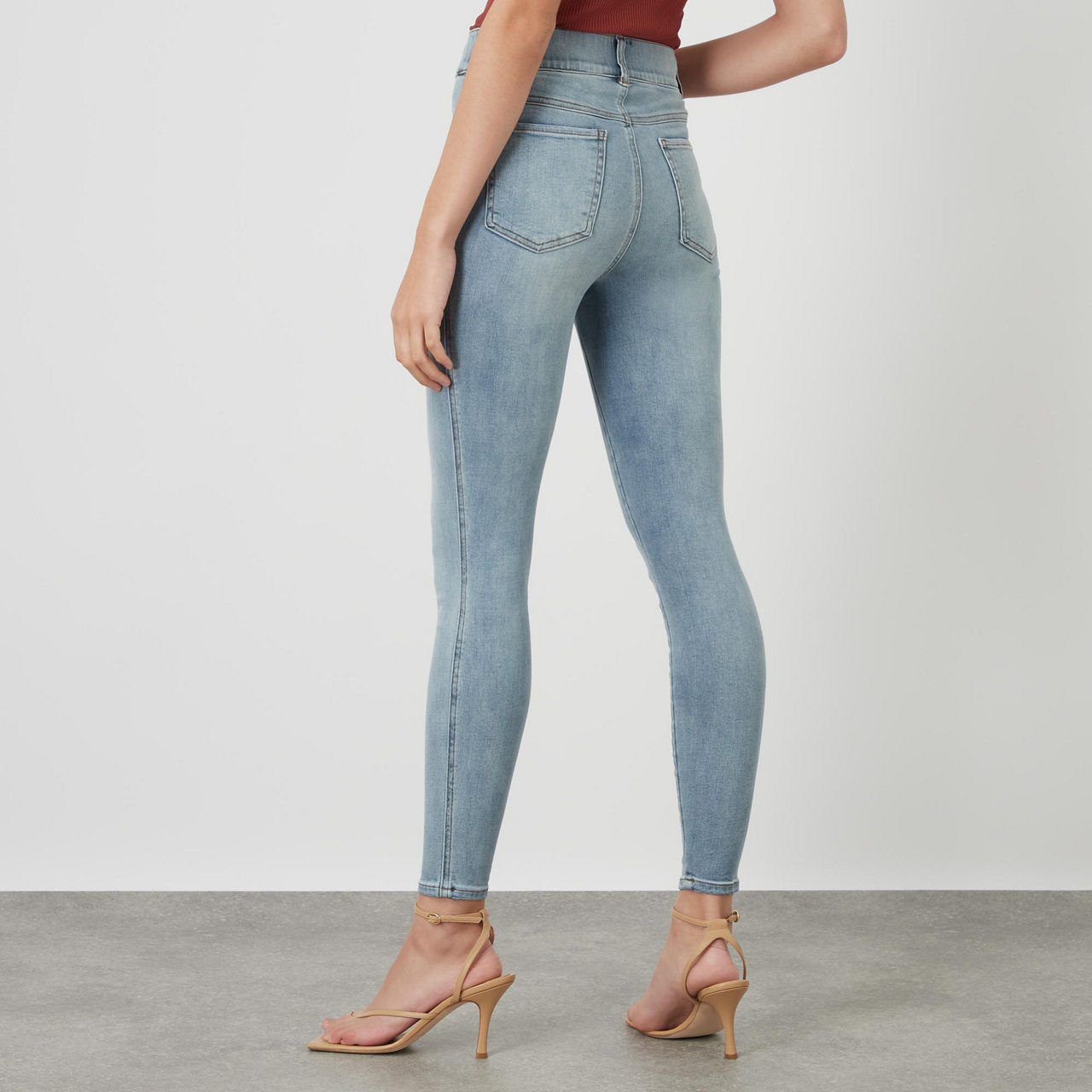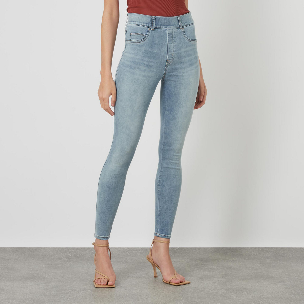 - High rise, skinny fit, ankle length, shaping waistband.
