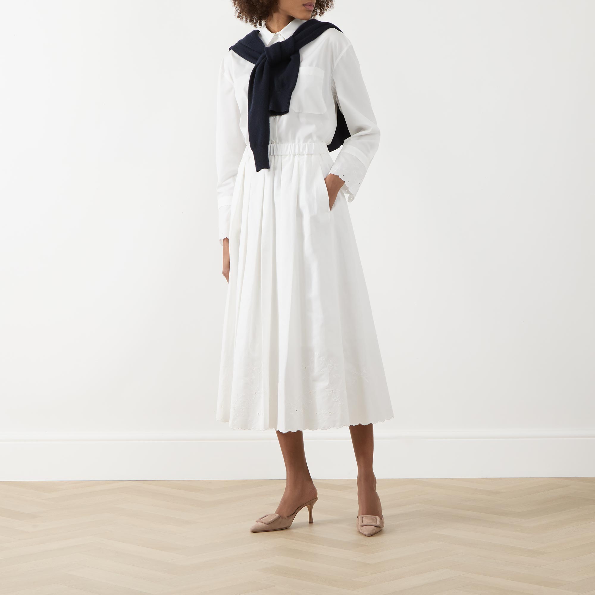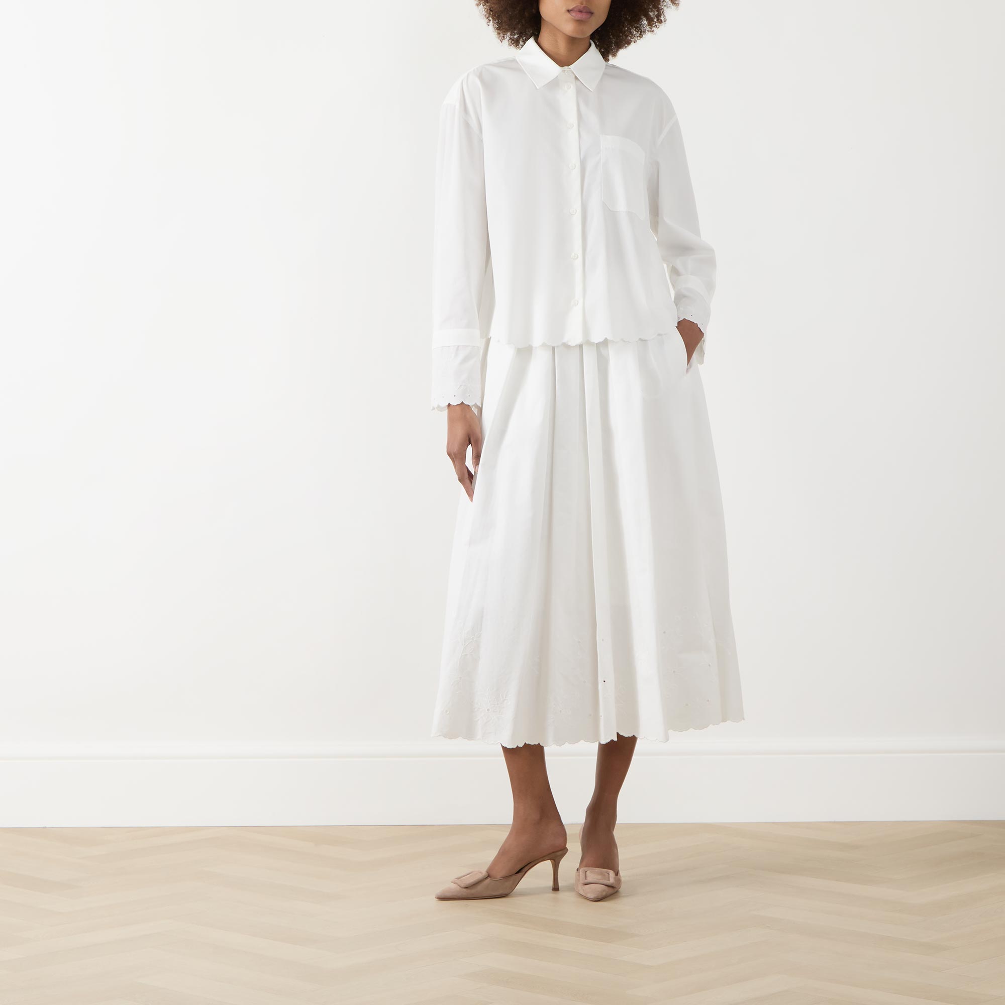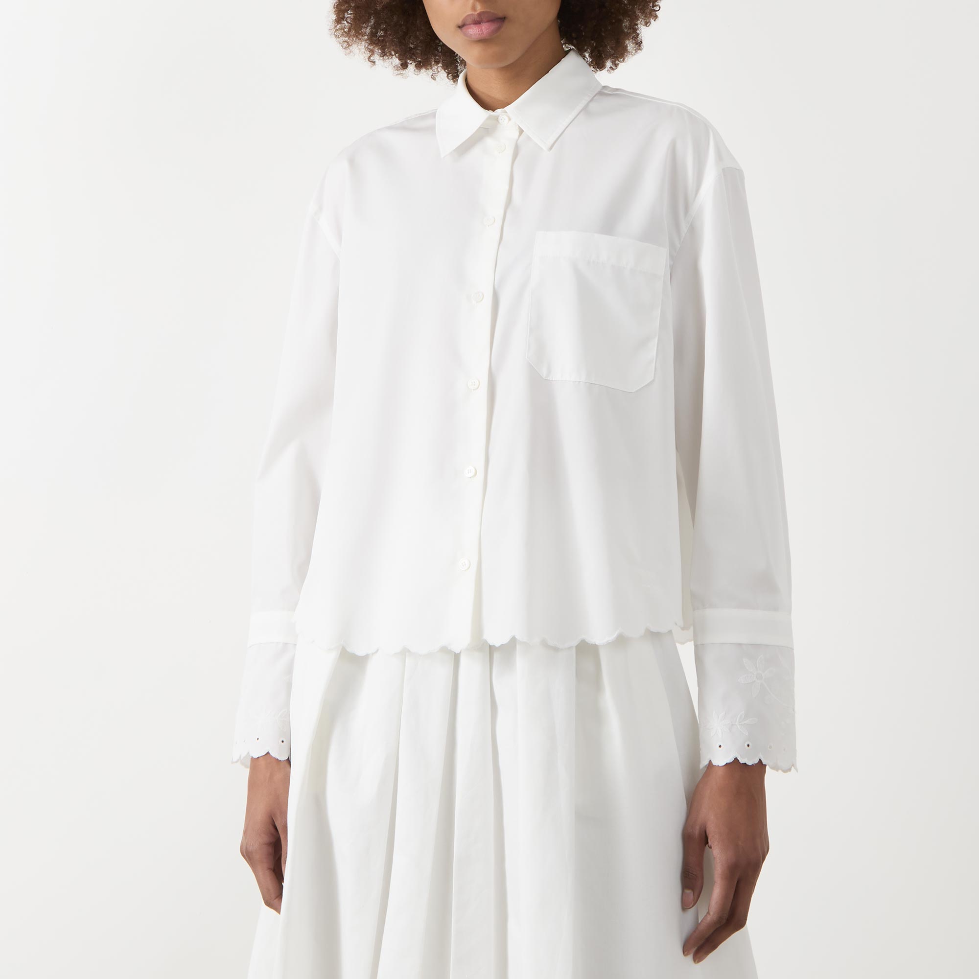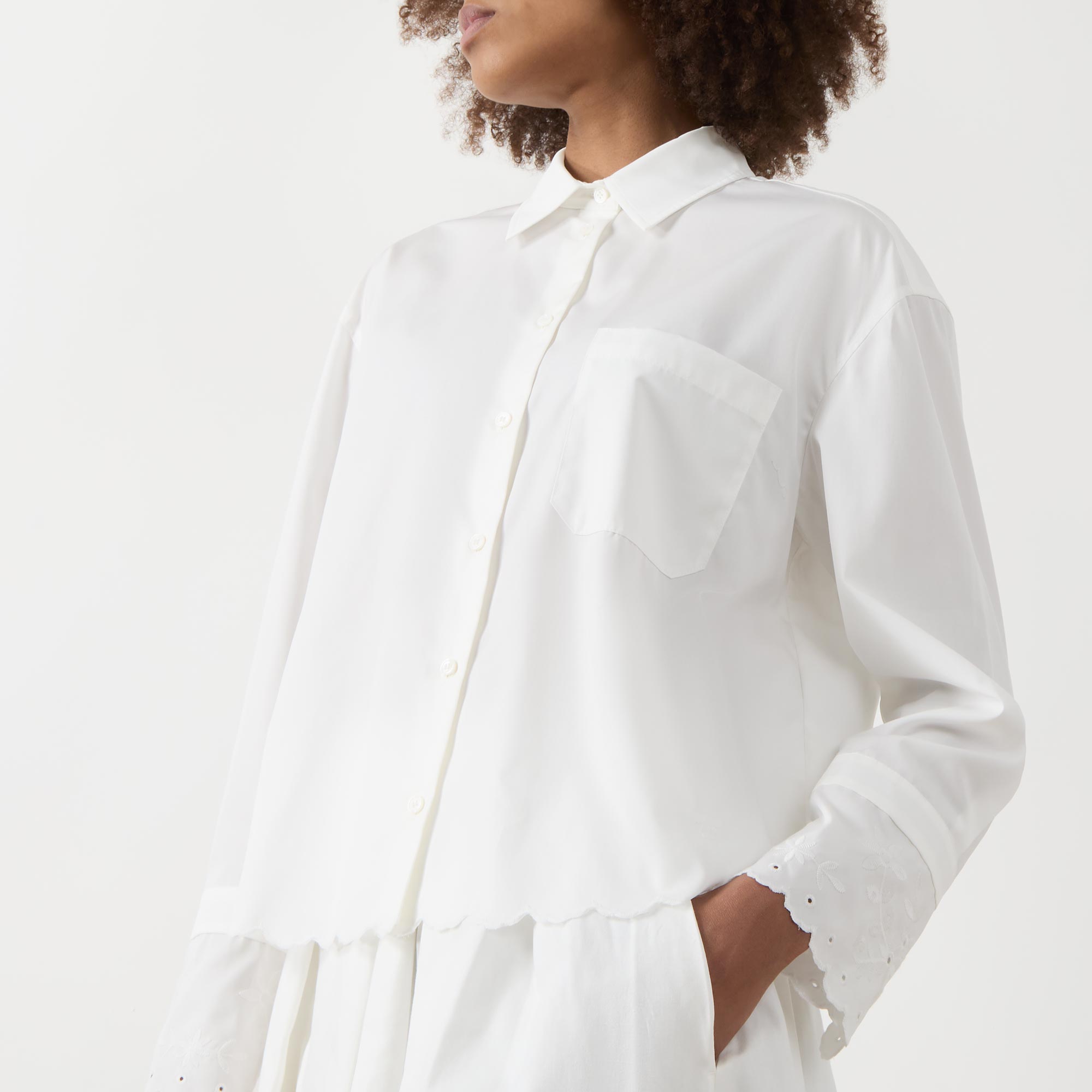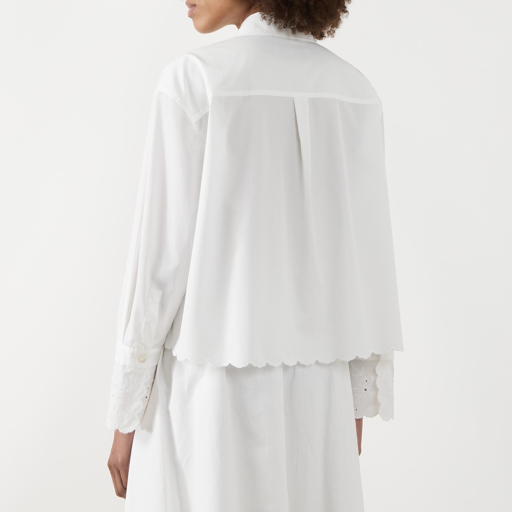 - Classic collar, button fastening, long sleeves, dropped shoulders, extended cuffs, scalloped and embroidered details, chest pocket, box pleat to the back