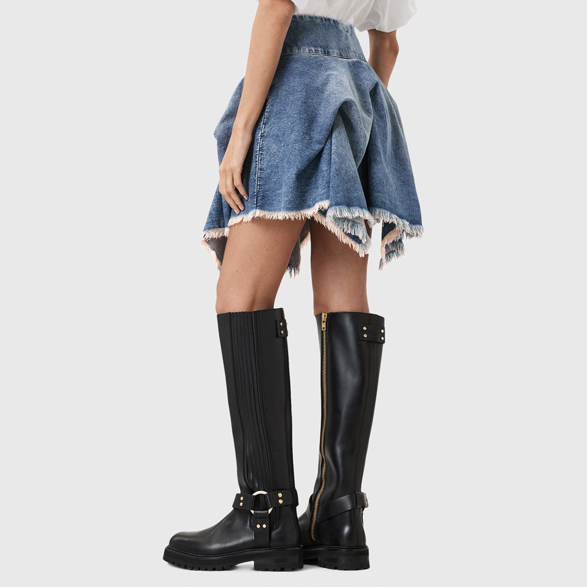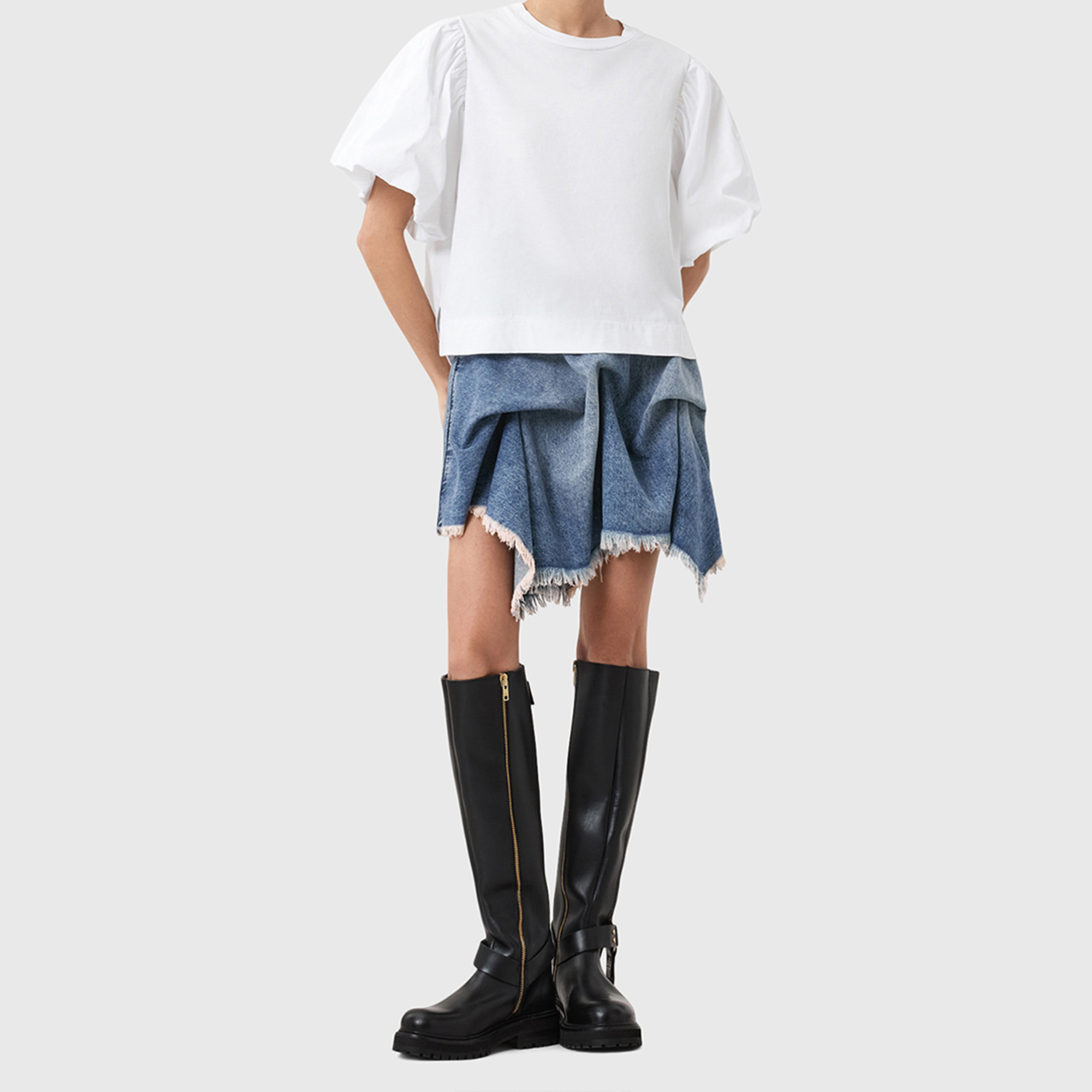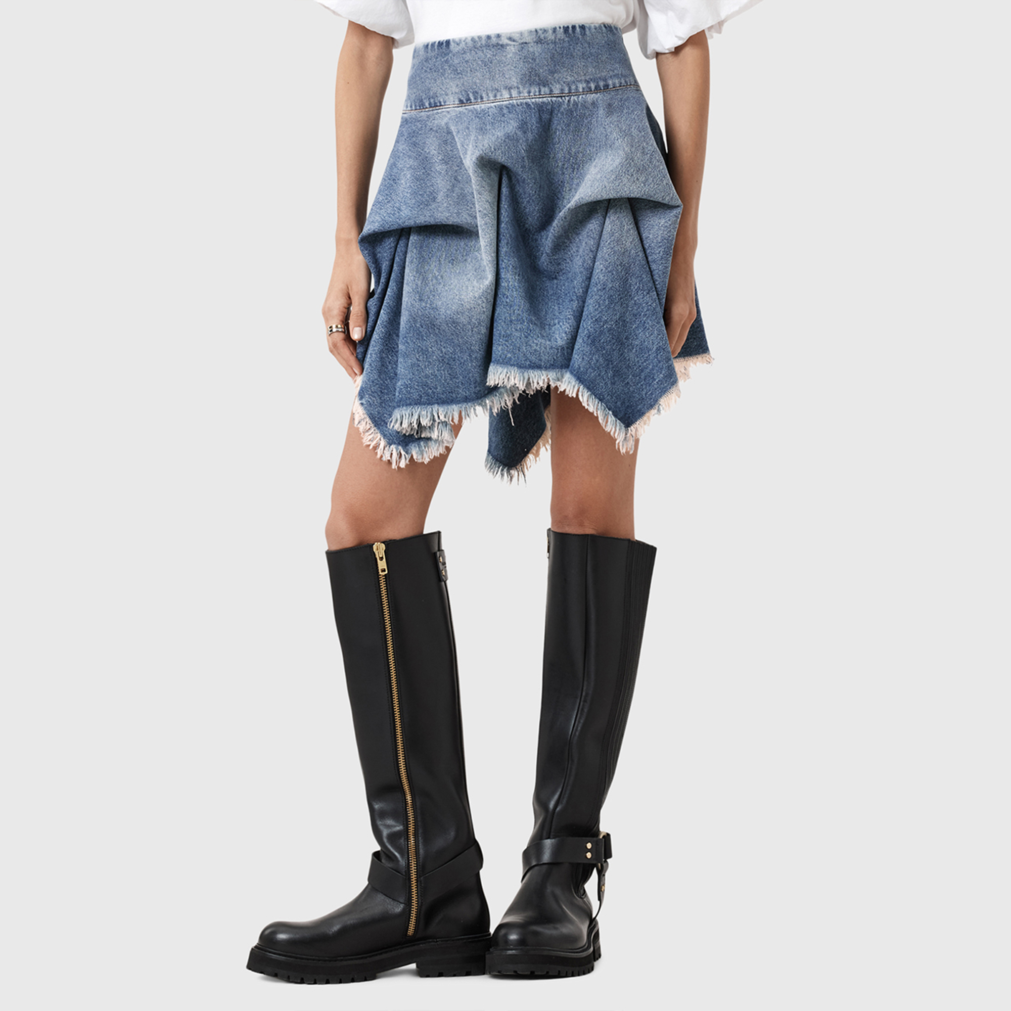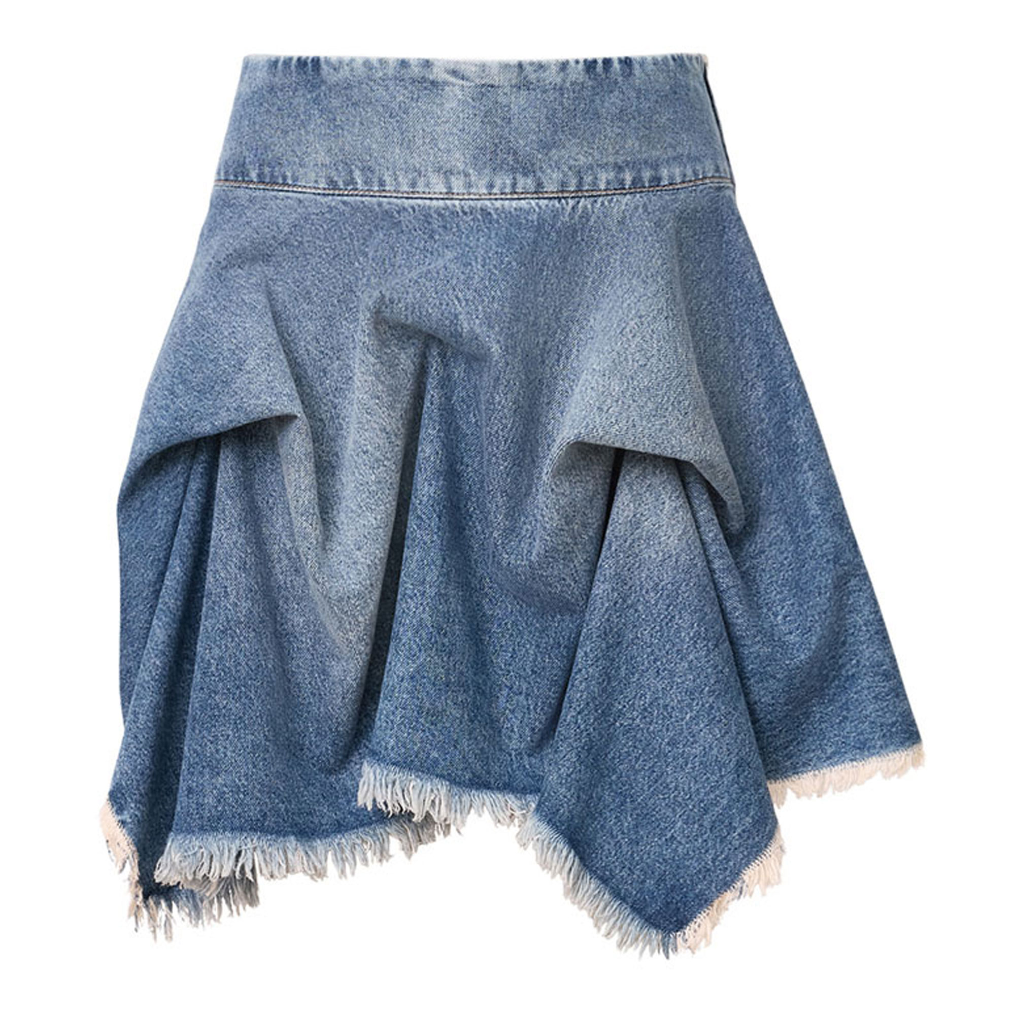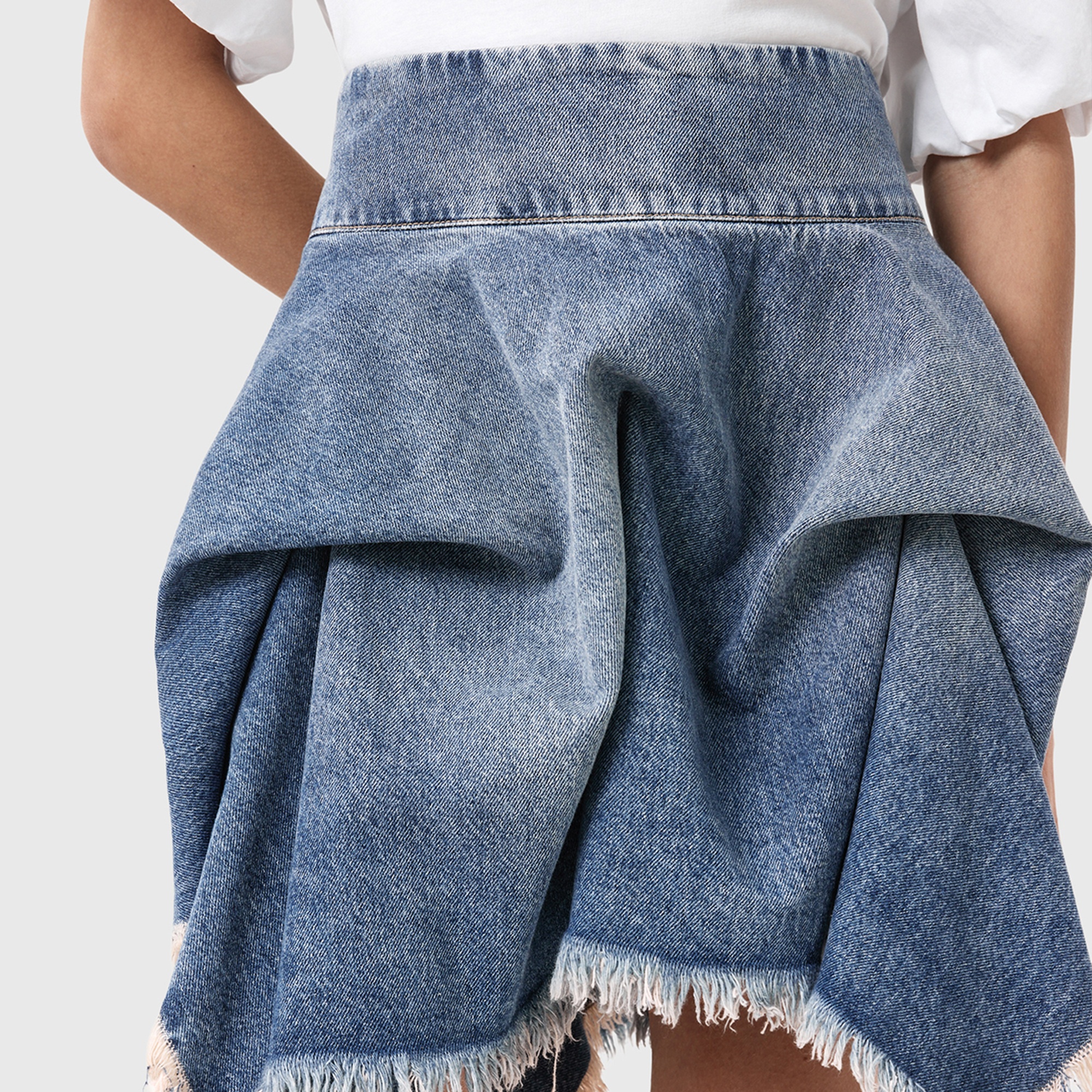 - Fitted waistband, zip at side seam, mini length, hitch details that create volume, asymmetric, heavily frayed hem