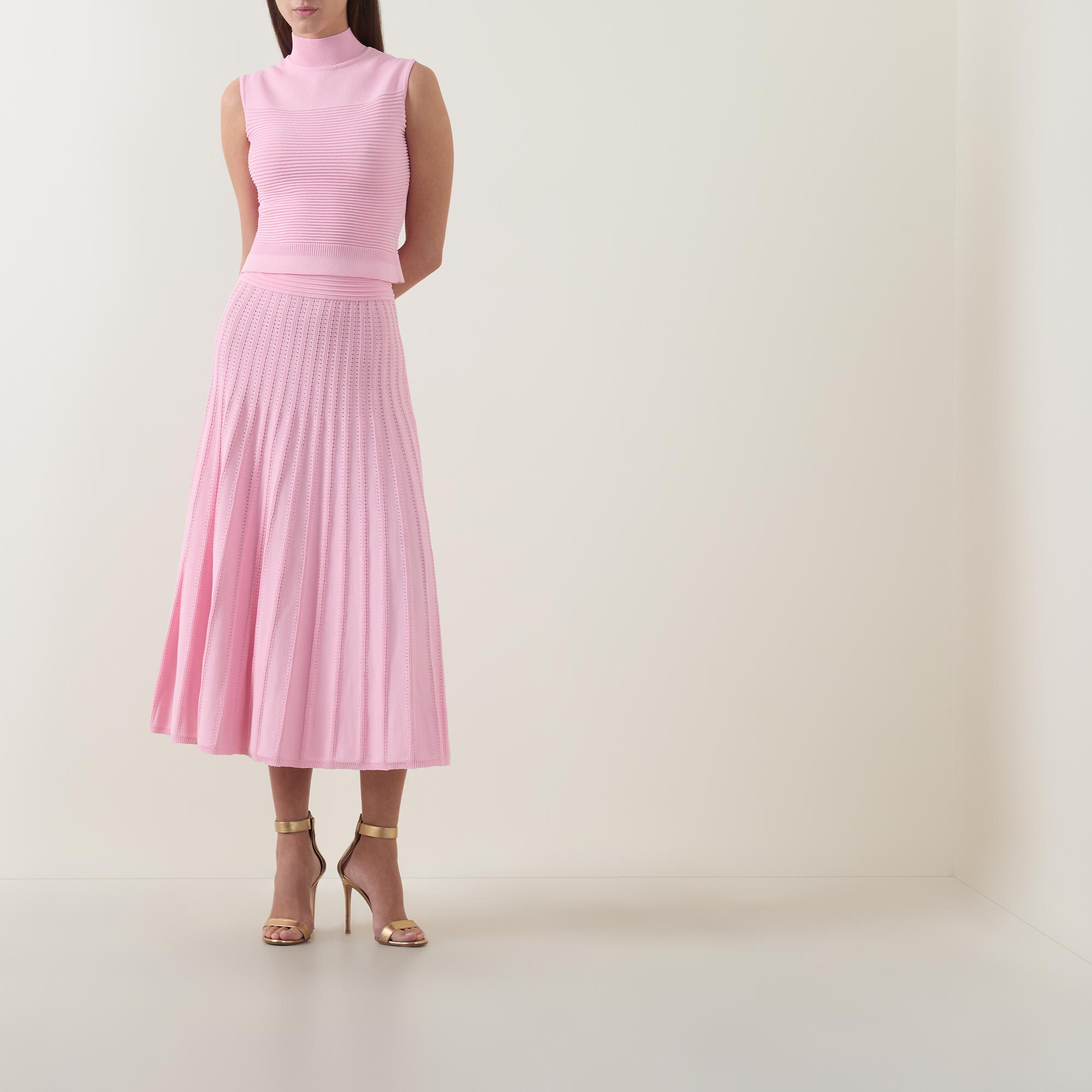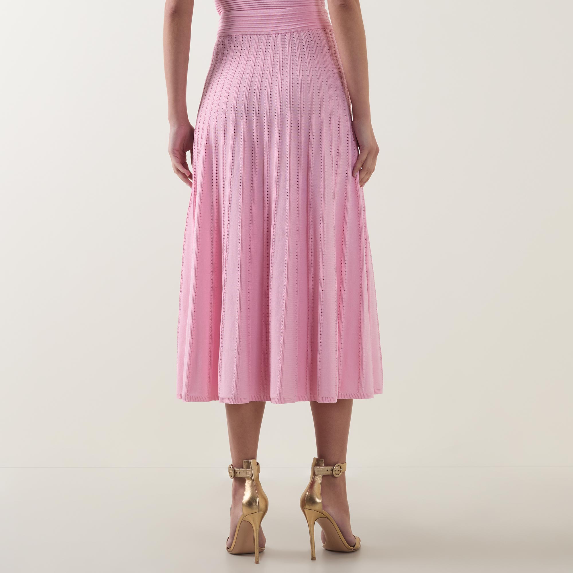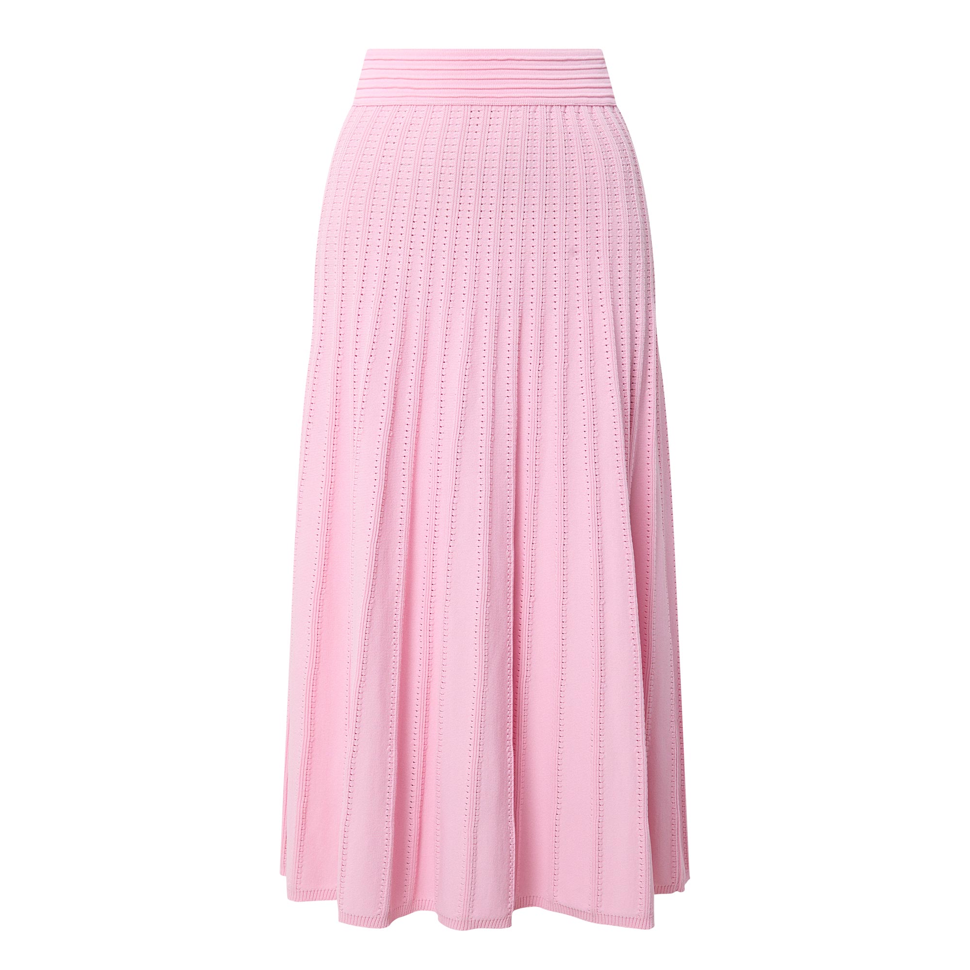 - Wide waistband, knit structure, pleated details, midi length