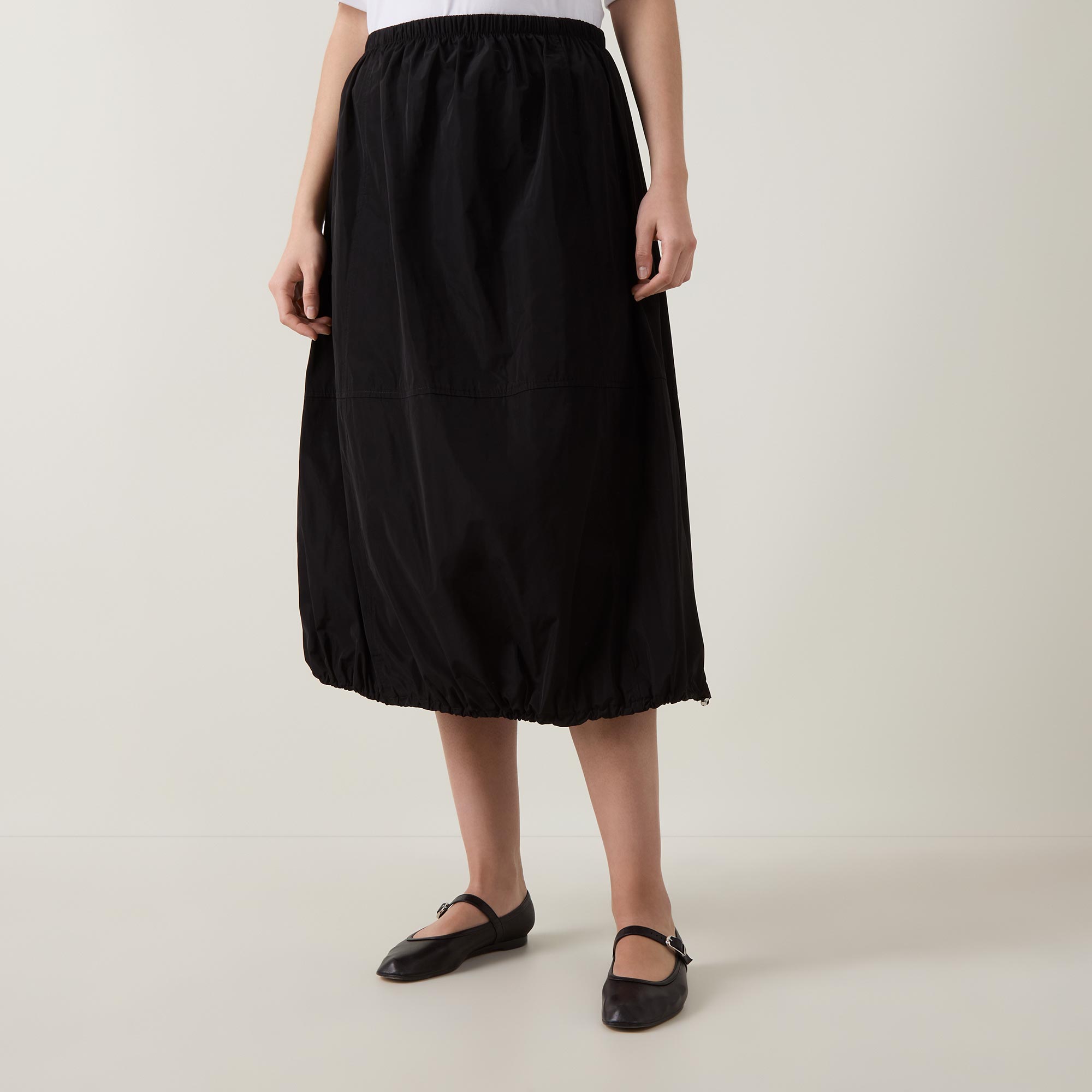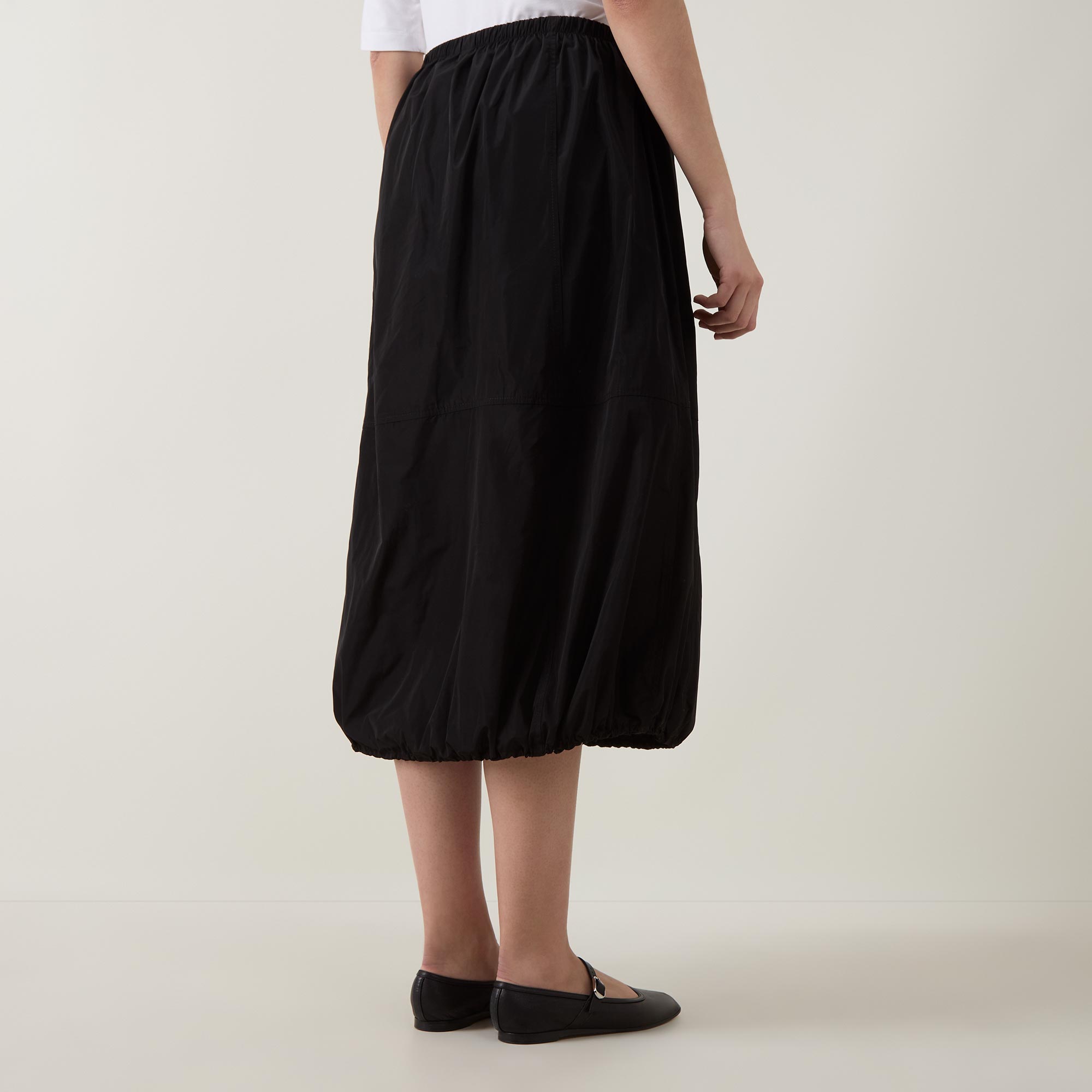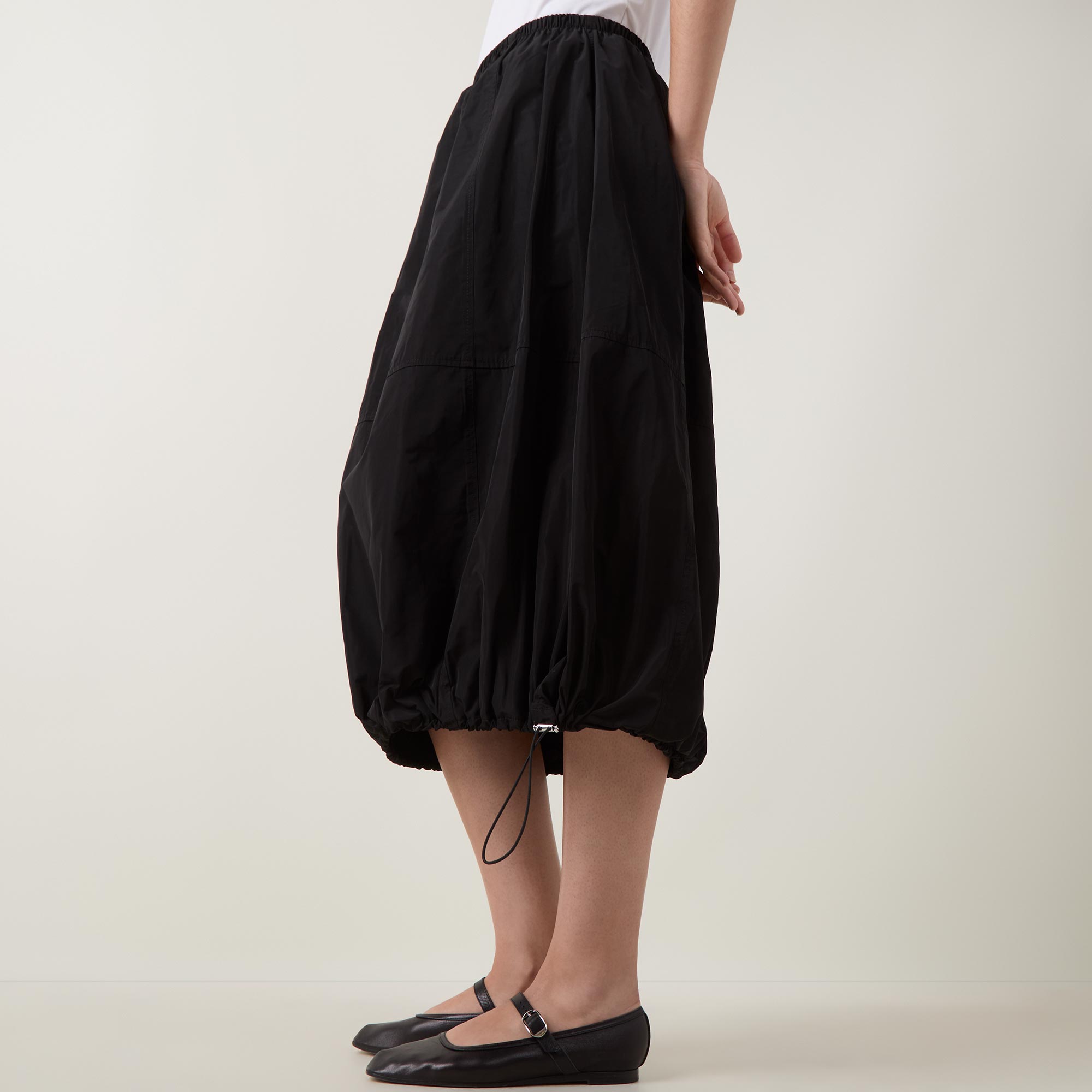 - Mid rise, elasticated waistband, straight hem with adjustable drawcord, bubble silhouette, sateen finish, midi length