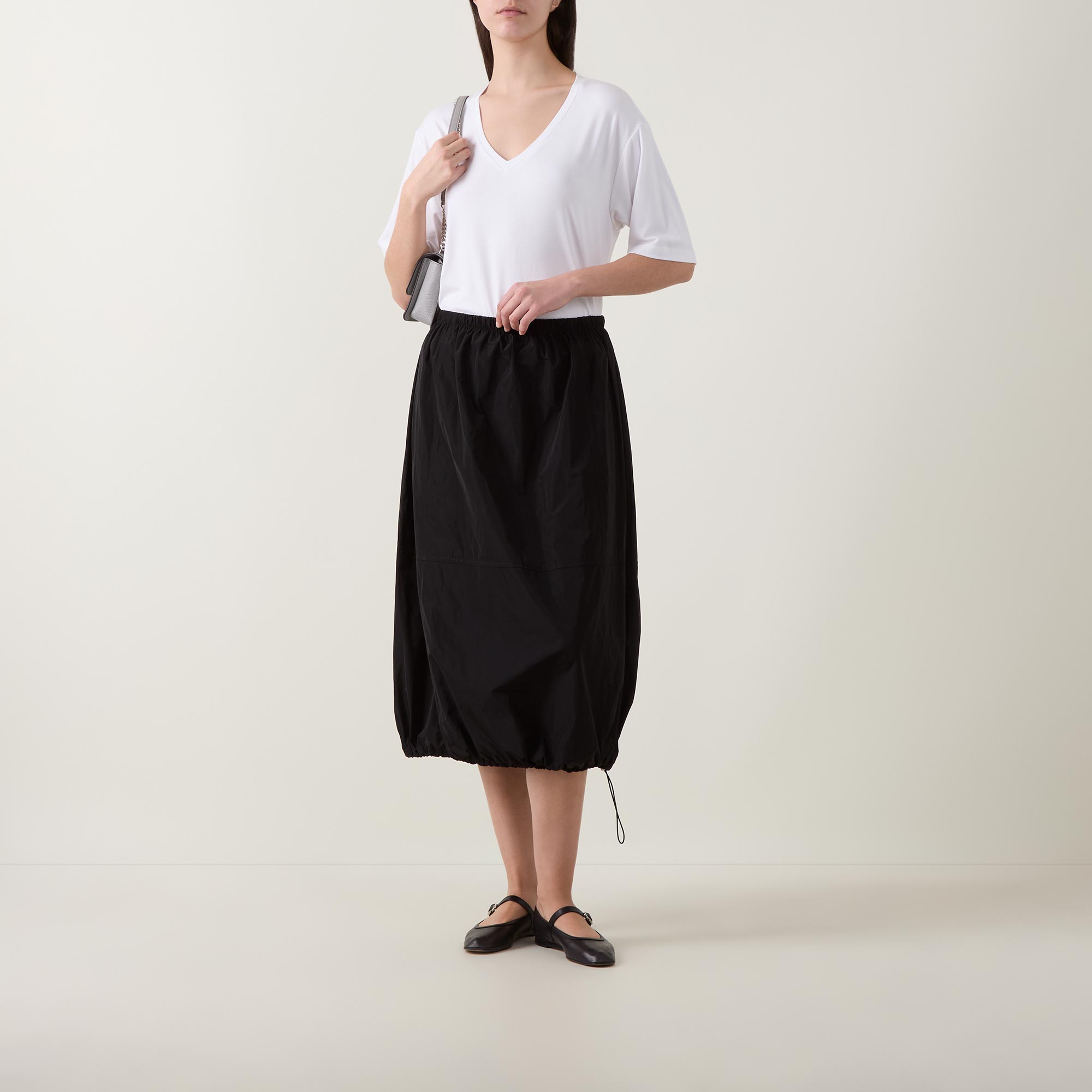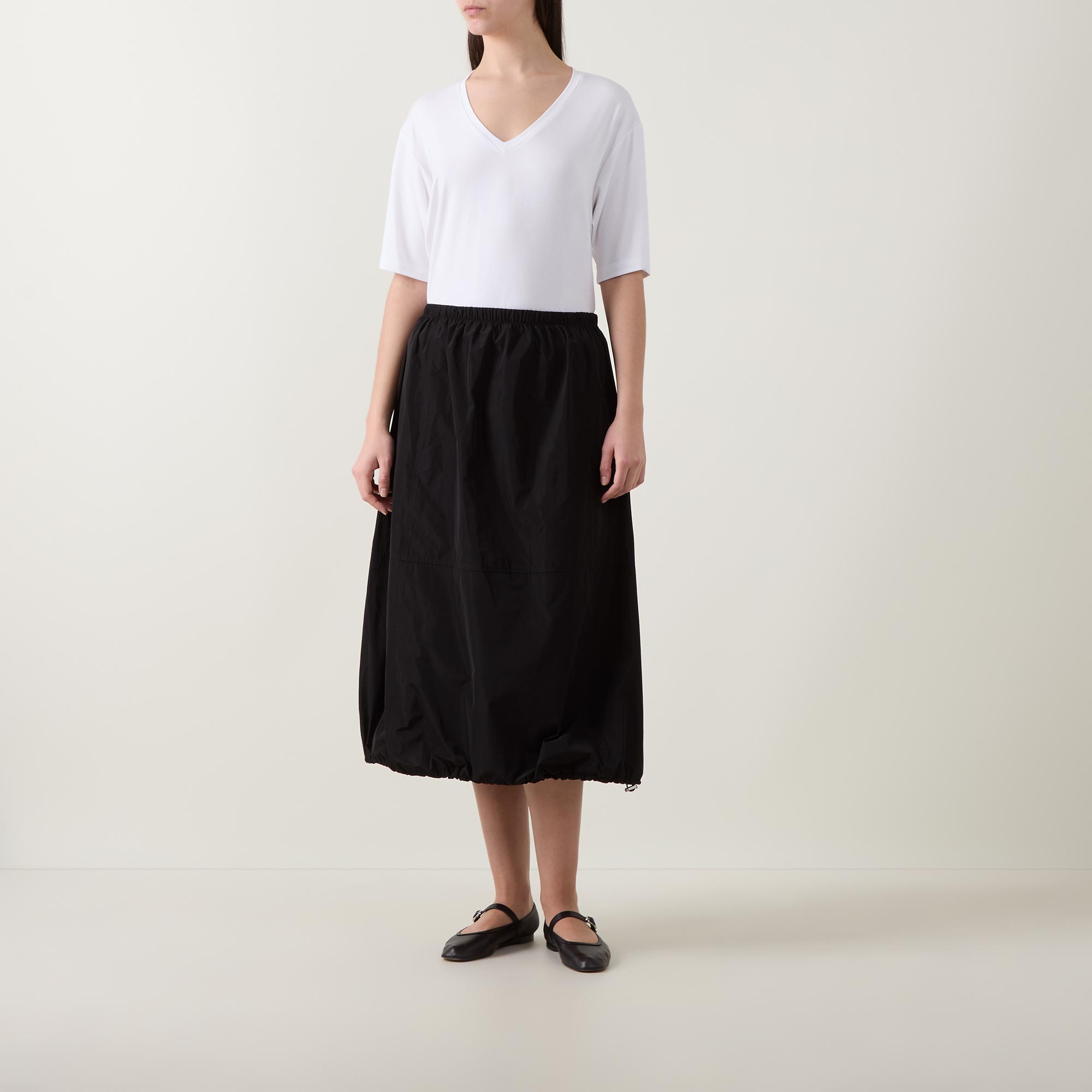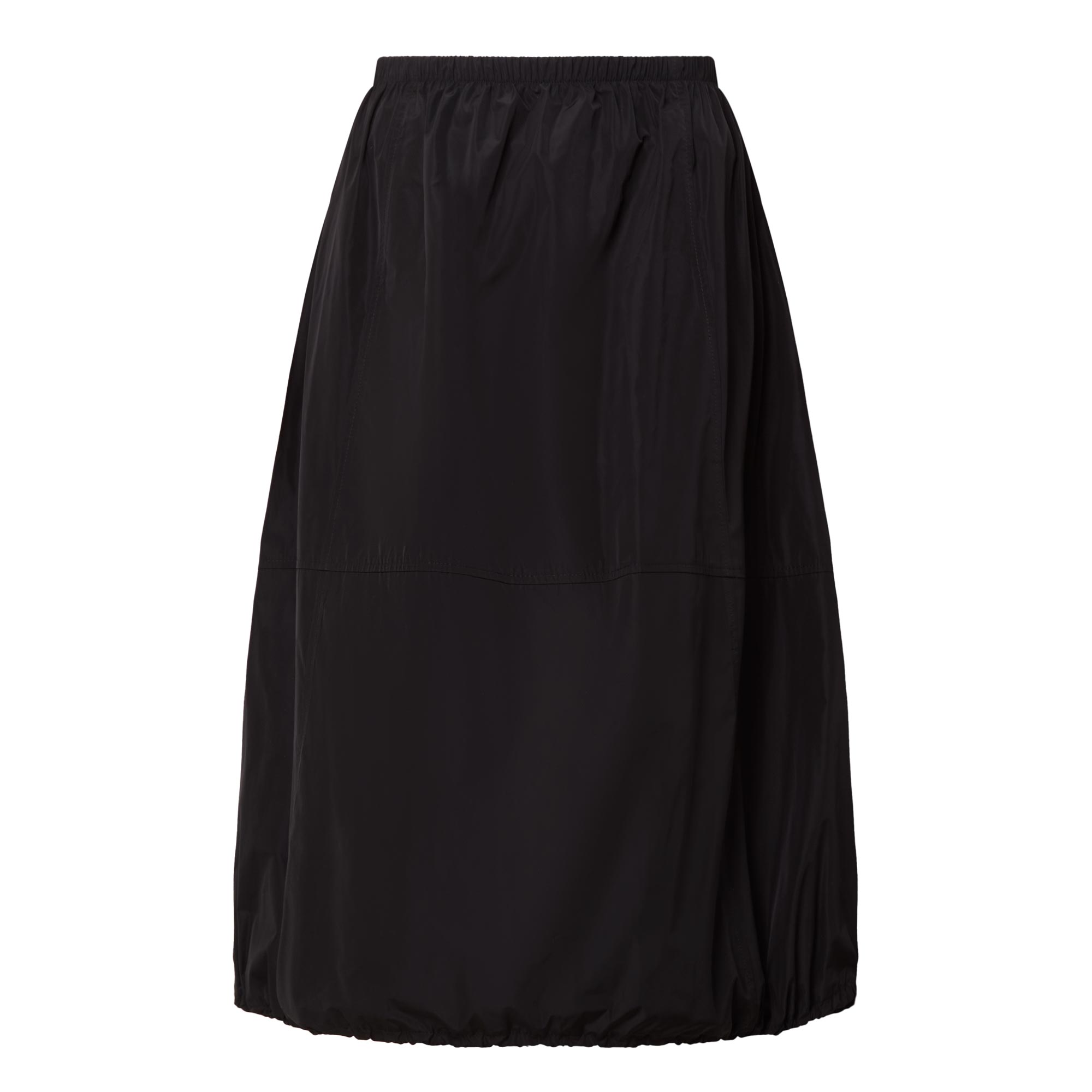 - Mid rise, elasticated waistband, straight hem with adjustable drawcord, bubble silhouette, sateen finish, midi length