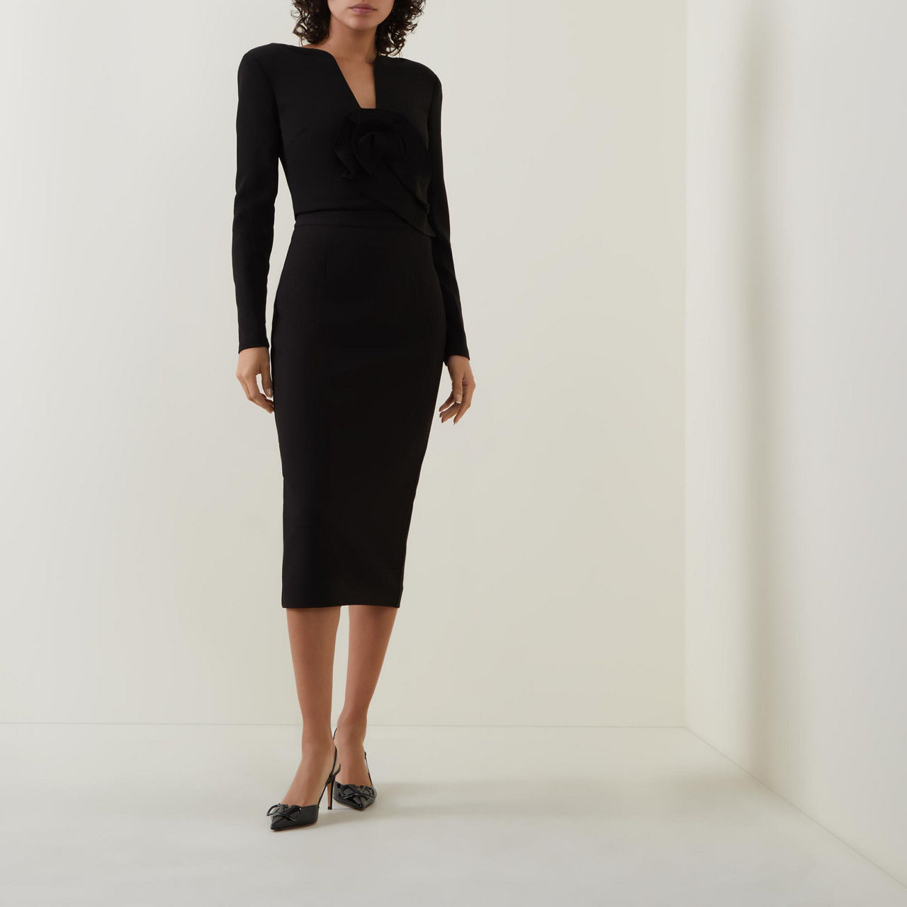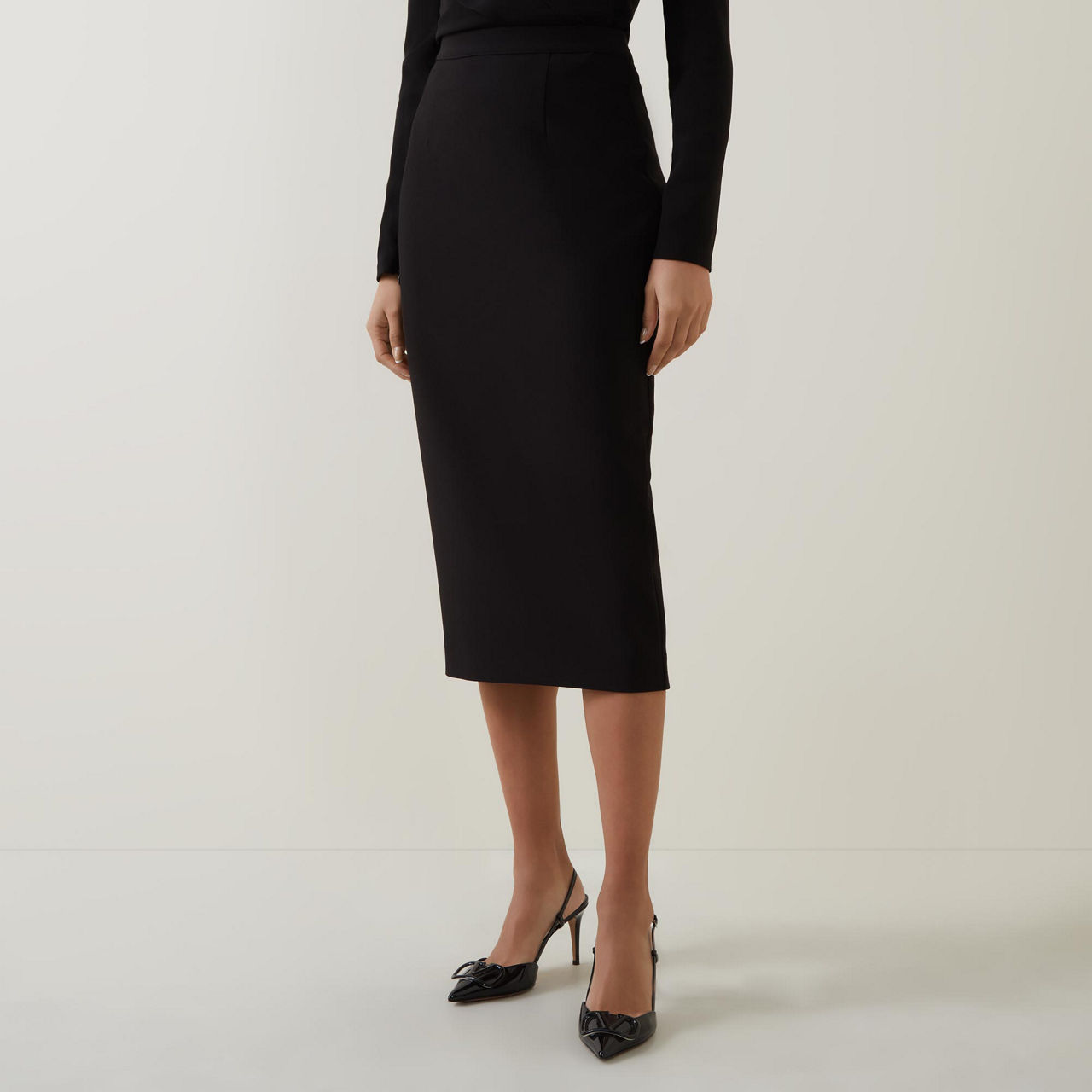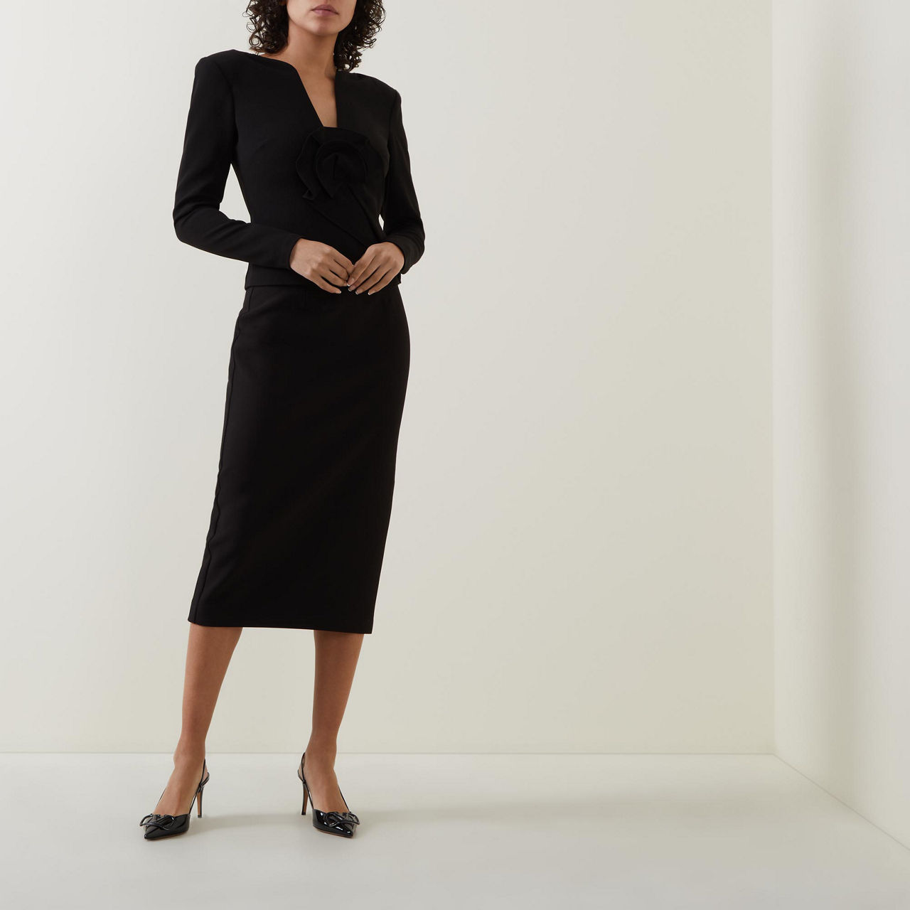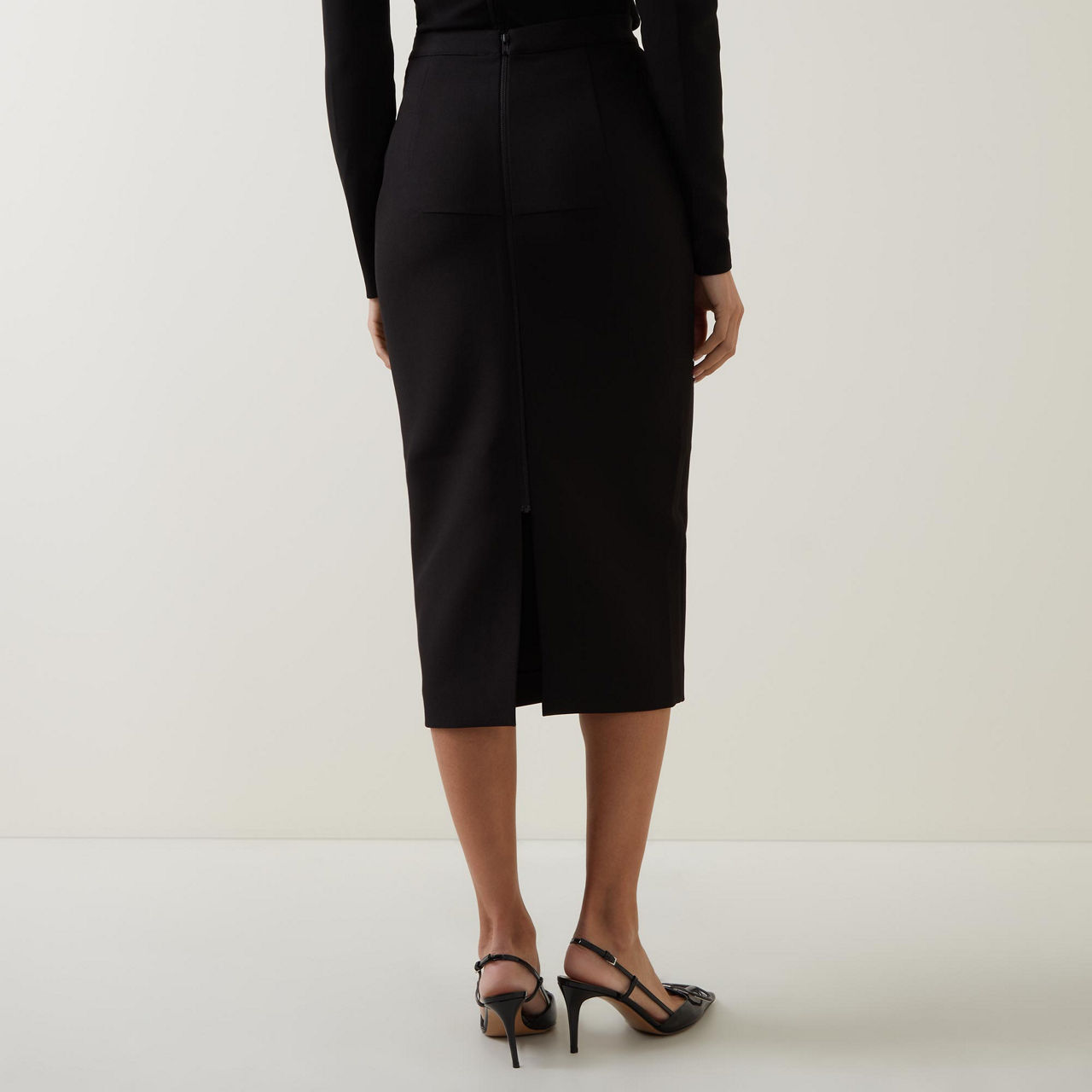 - High-rise, fitted throughout, rear concealed zip fastening, rear hem split, midi length
