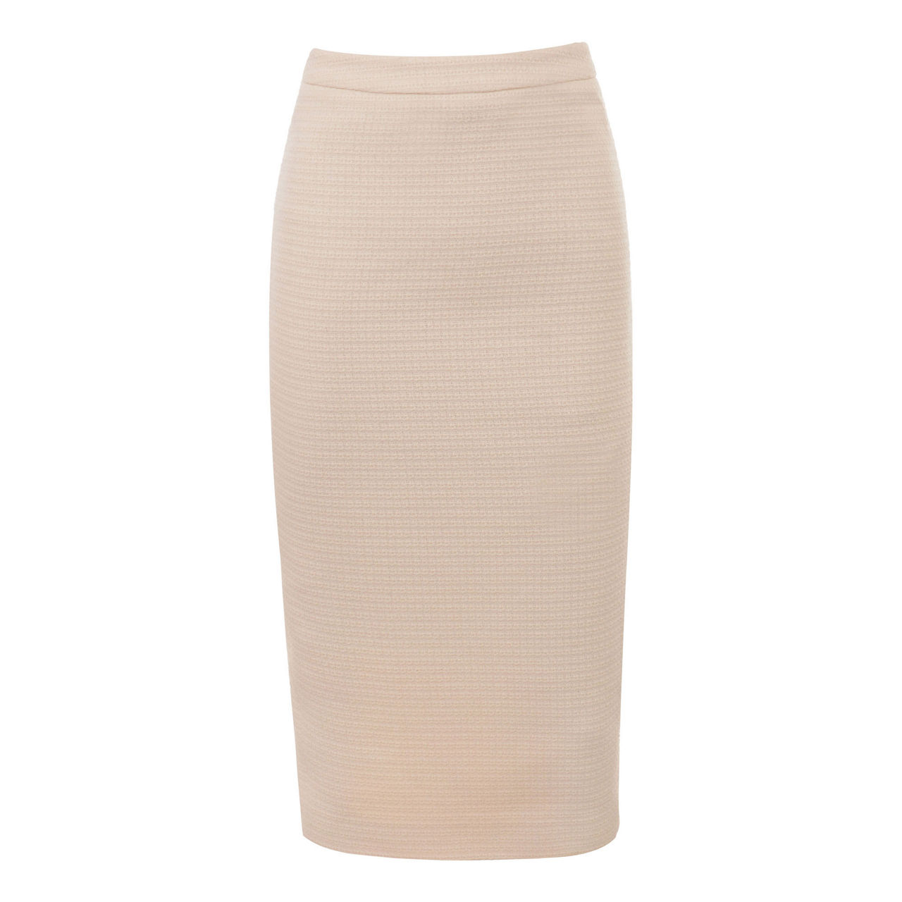 - Textured boucle finish, pencil silhouette, high-waist, back slit, zip fastening, midi length, lined