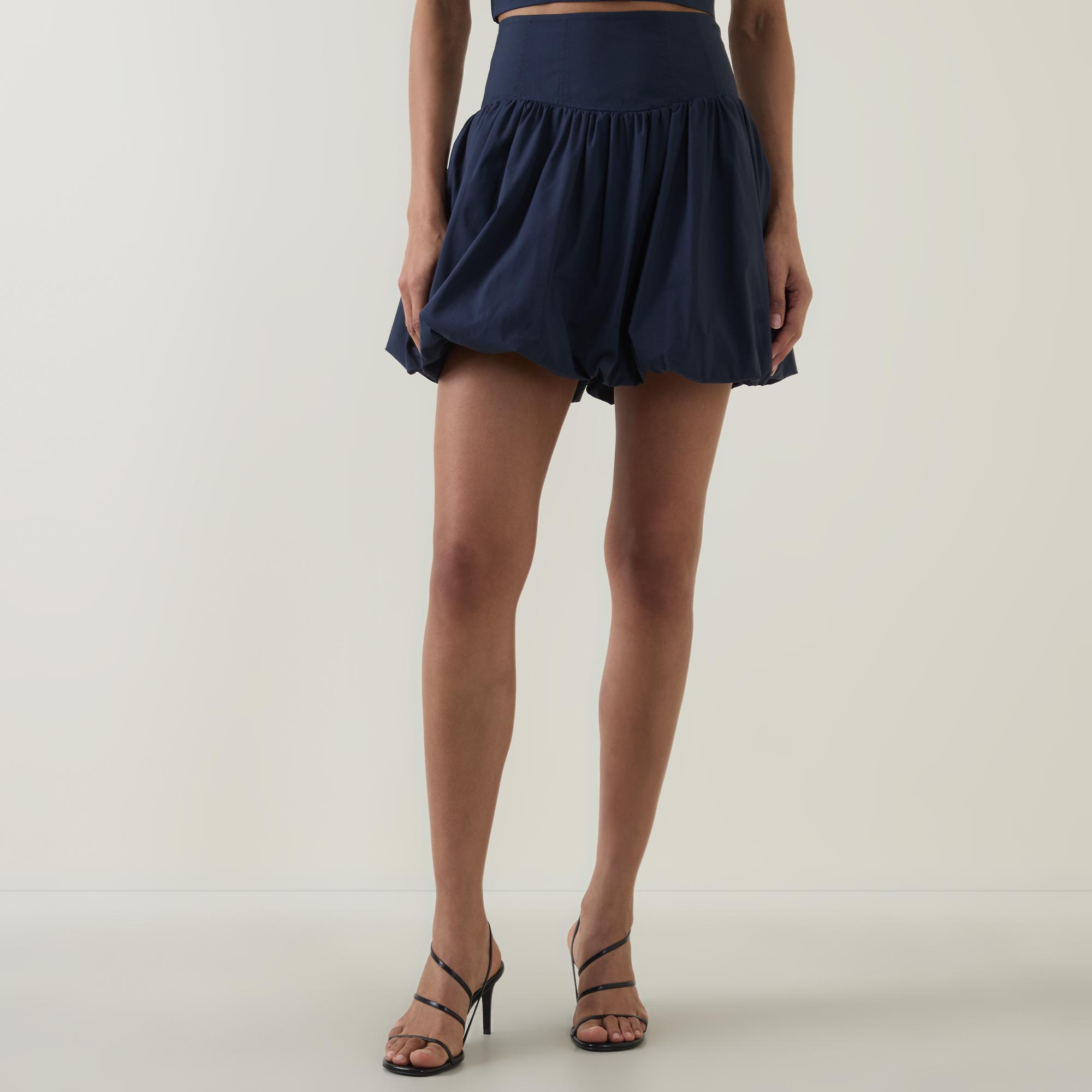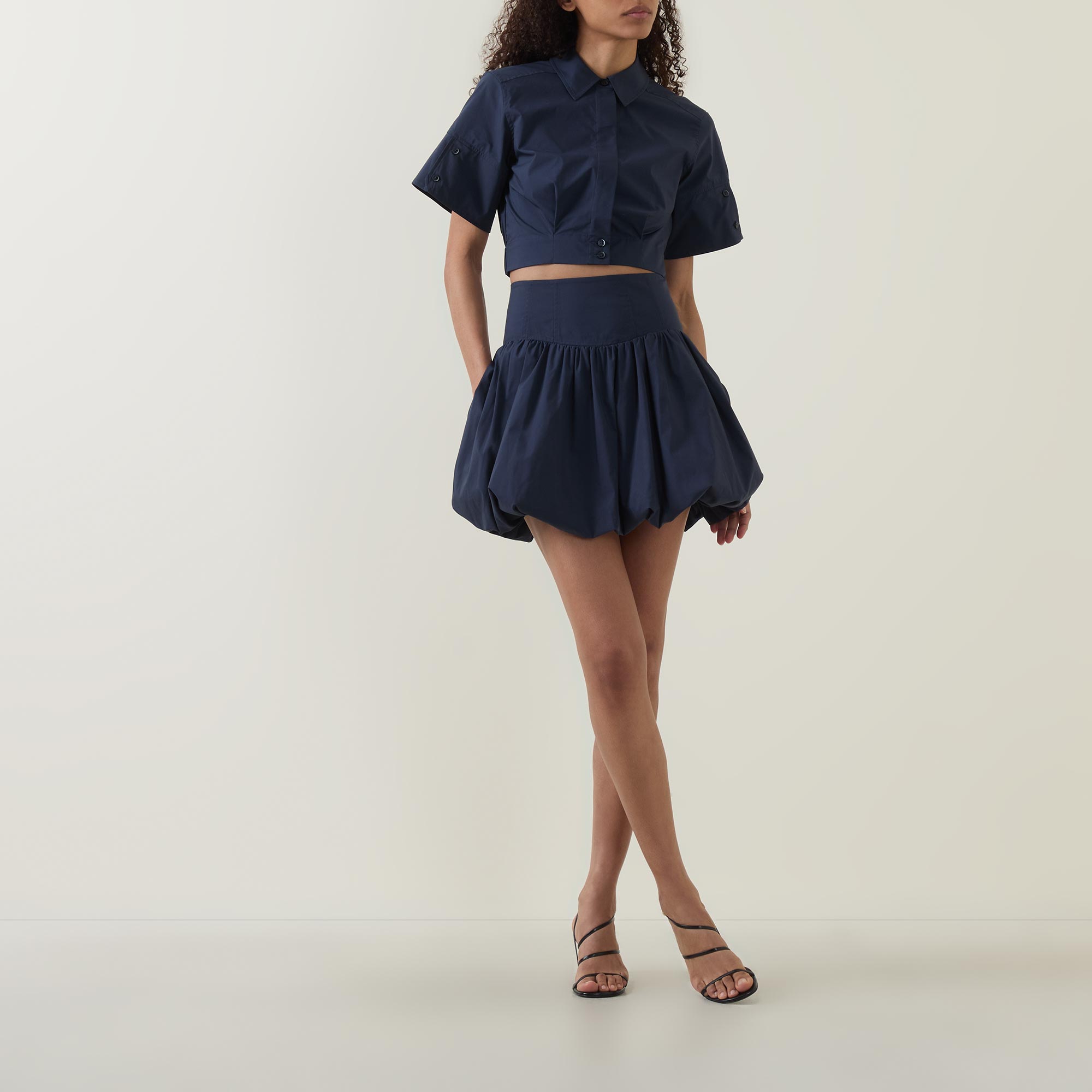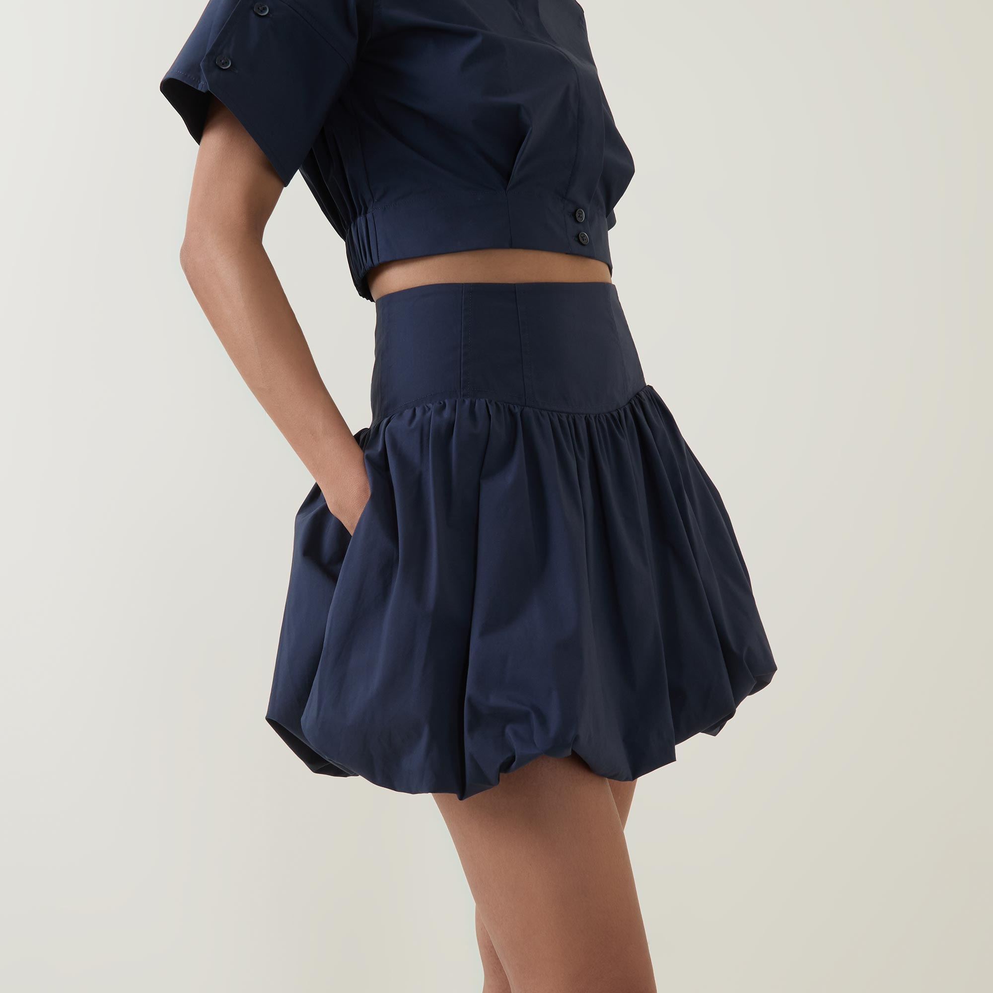 - Mini length, bubble hemline, fitted waist, side entry pockets, crisp poplin fabric, fully lined, side zip fastening