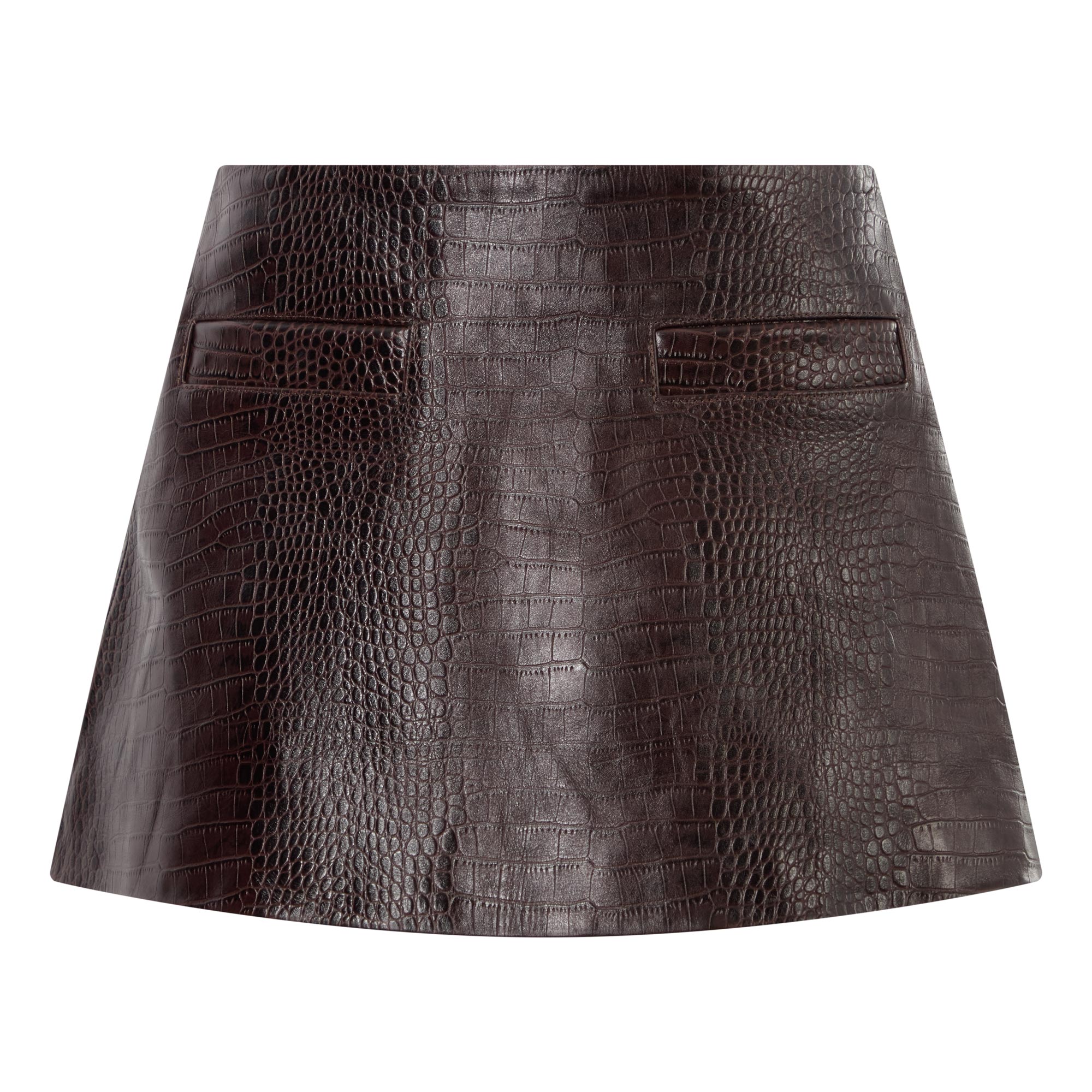 - Mini length, croc texture, illusion pockets, zip fastening, lined