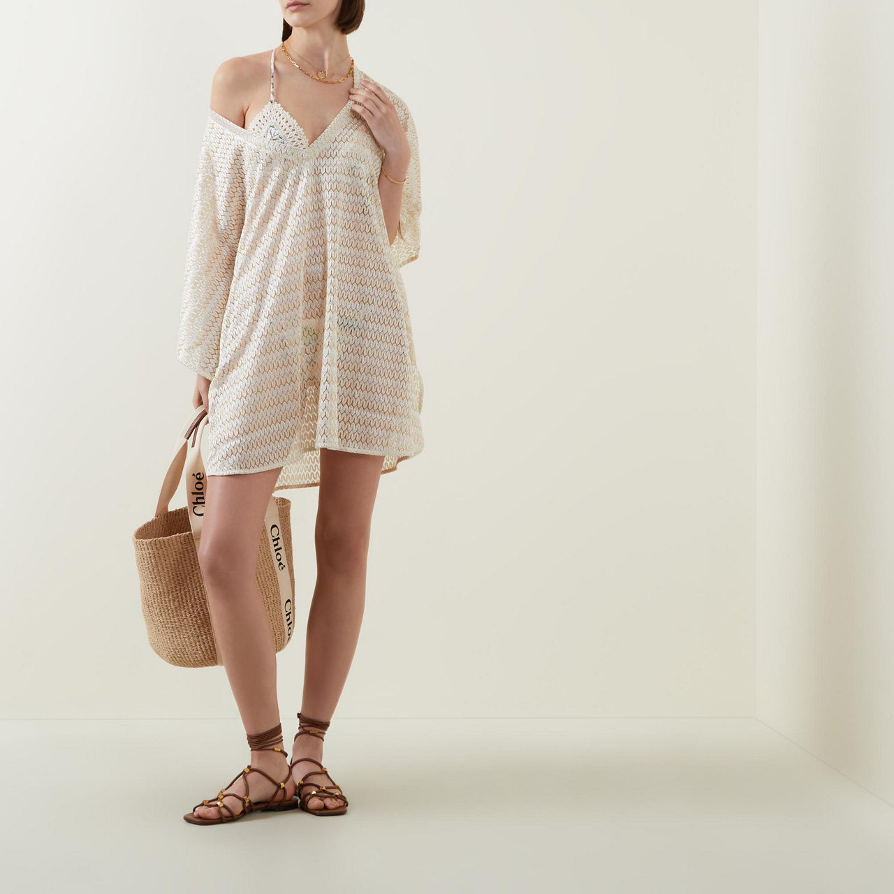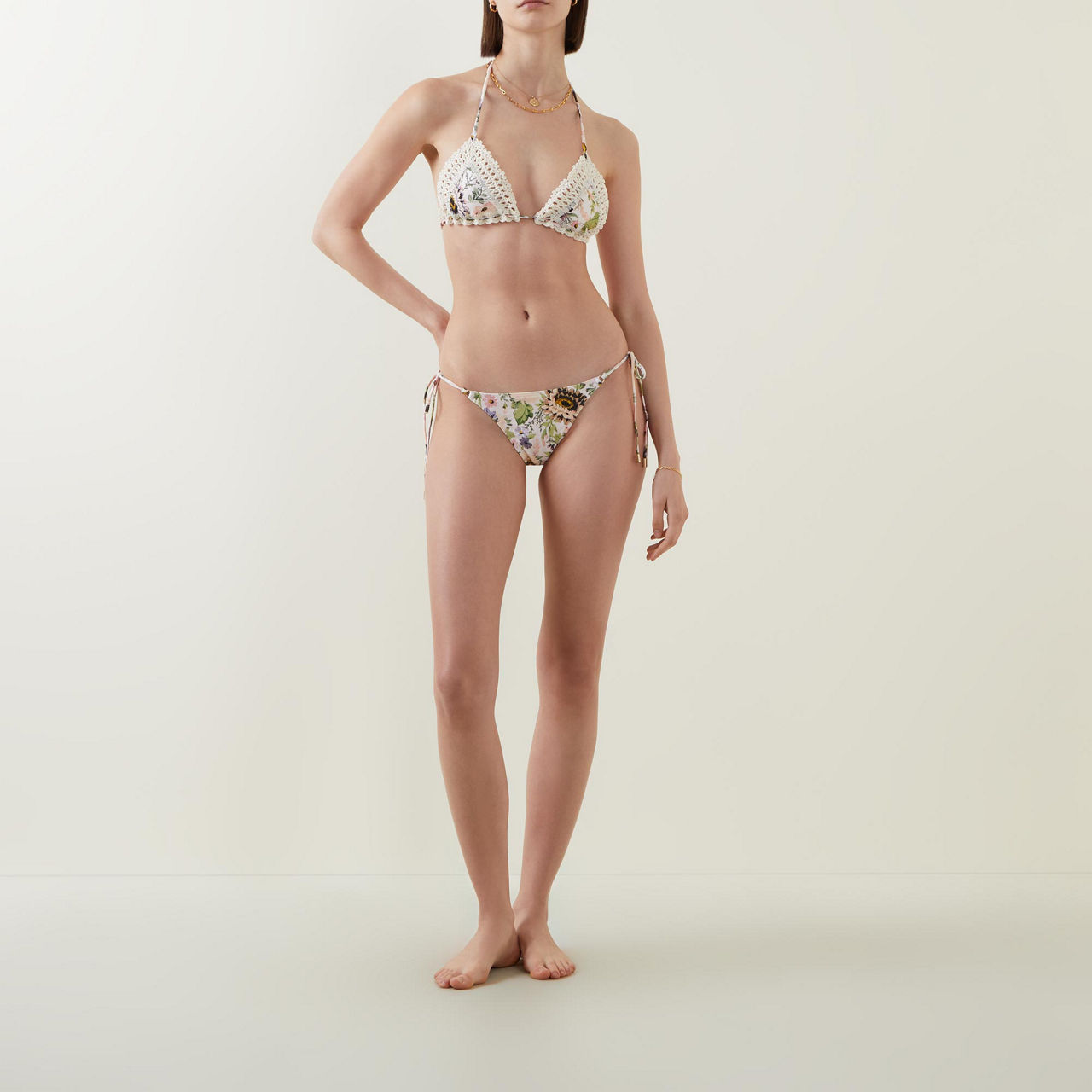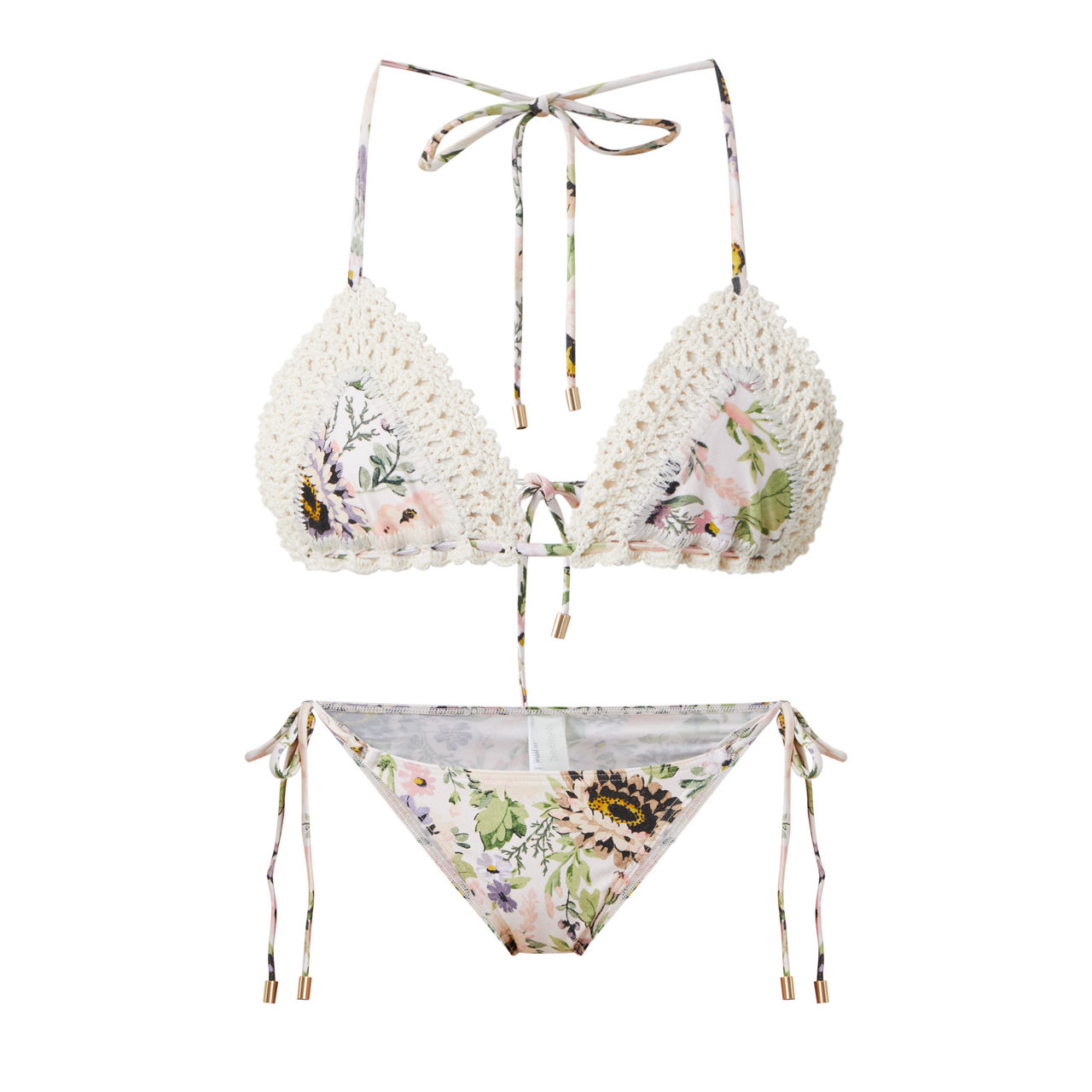 Zimmermann's Summer Swim '24 collection features a selection of designs adorned in their Cream Floral print, take the Halliday Crochet Bikini set. Spun from Italian lycra, it features a triangle bikini top with a bohemian-inspired crochet edging and removable cups, while the brief-style bottoms sit low-rise on the waist and are distinguished by adjustable self-tie side fastenings for the perfect fit.