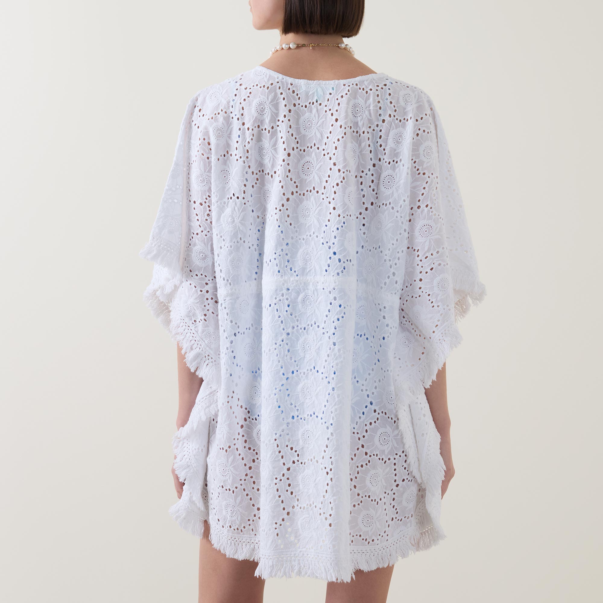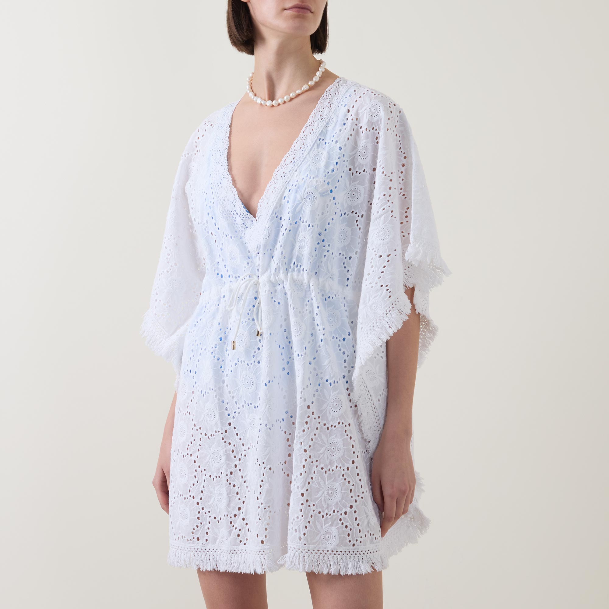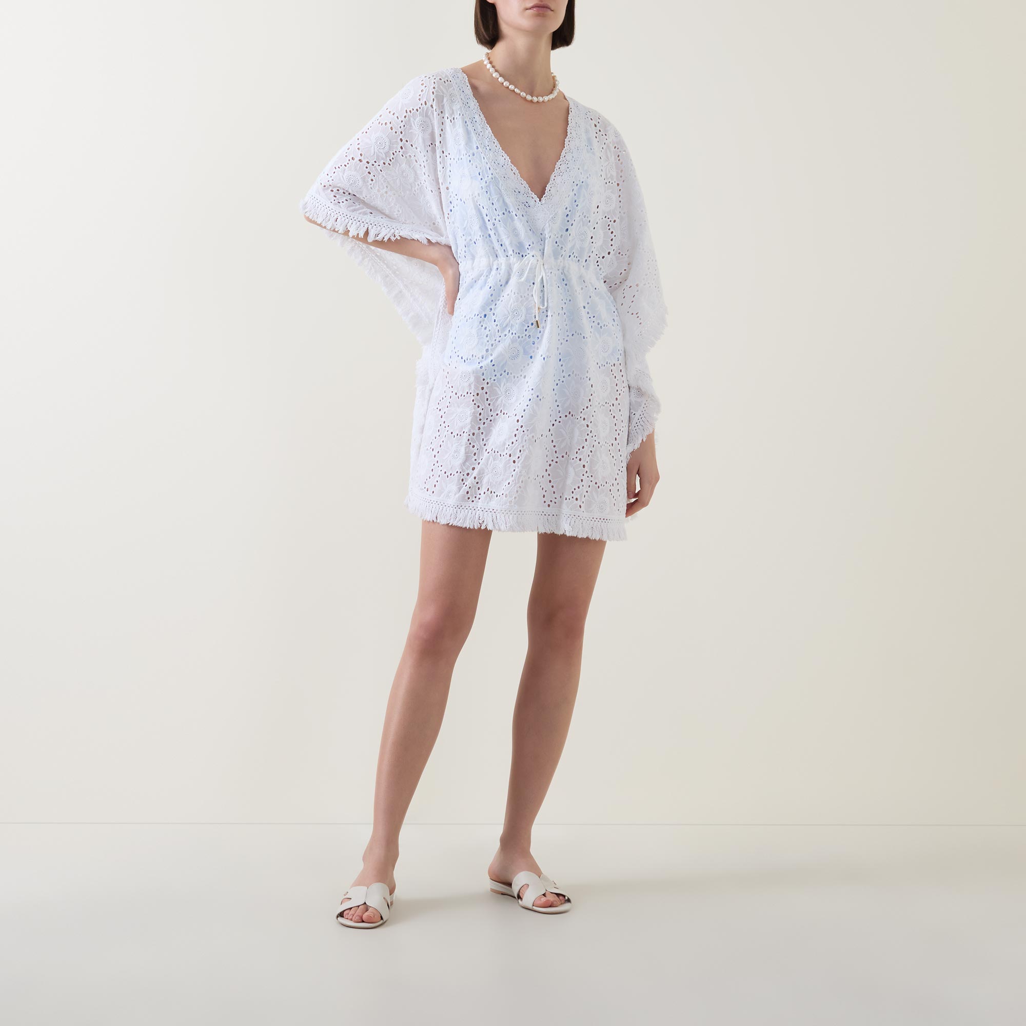 - Plunge neckline, self-tie fastening at the waist, wide-cut sleeves, short length, broderie detailing