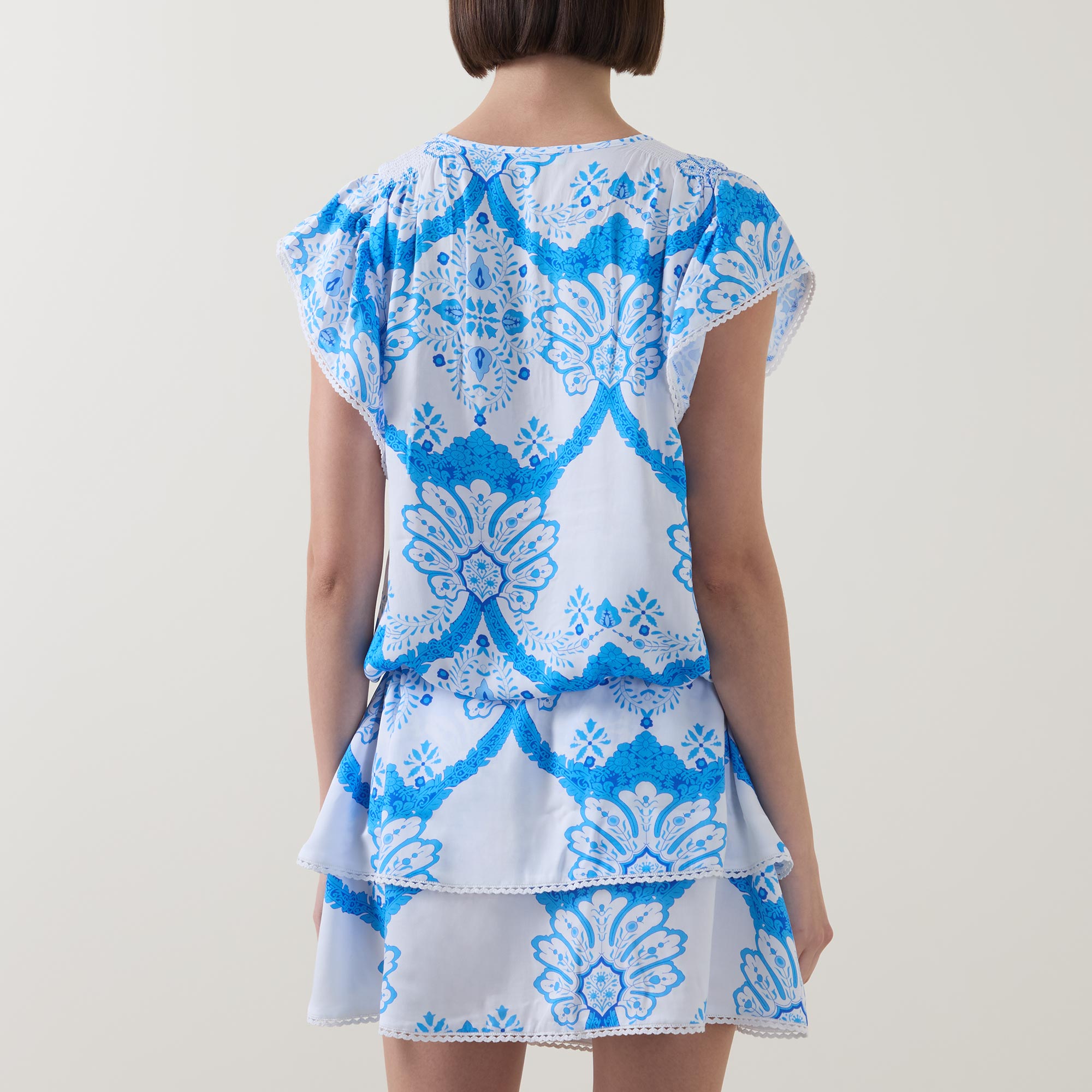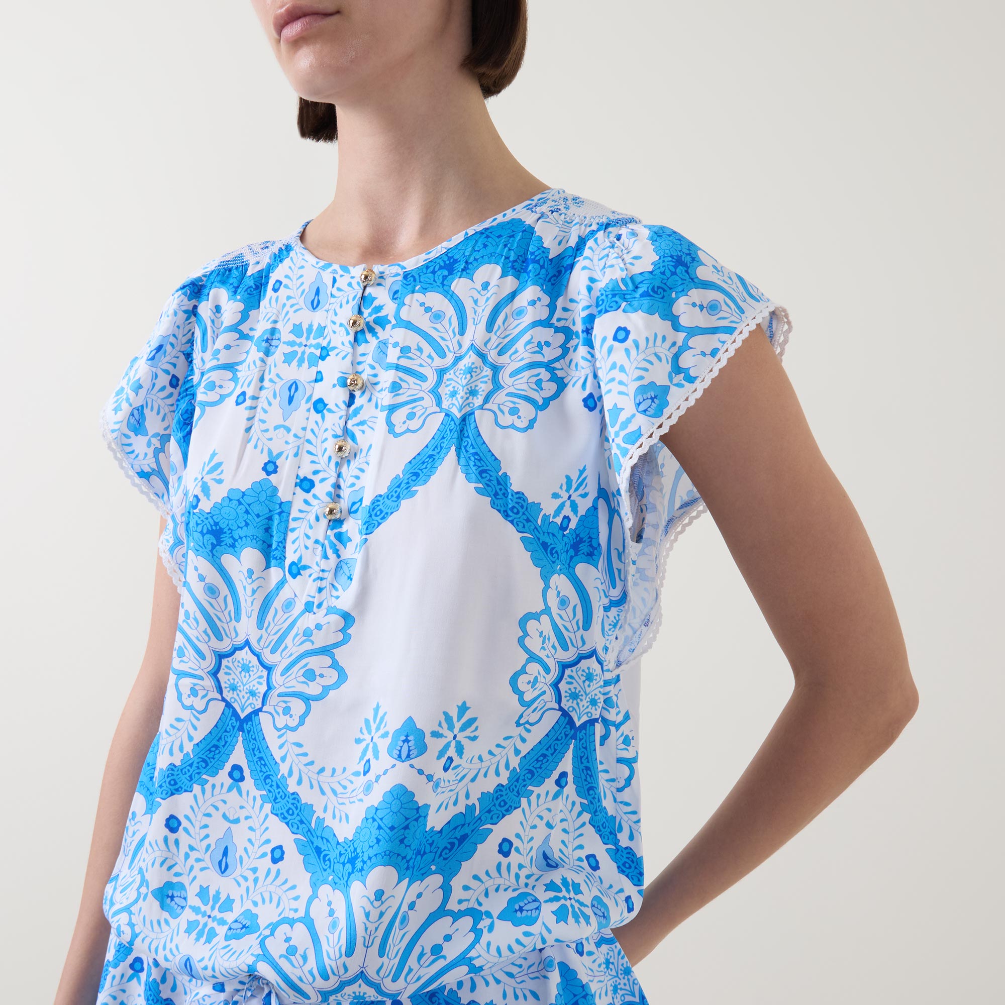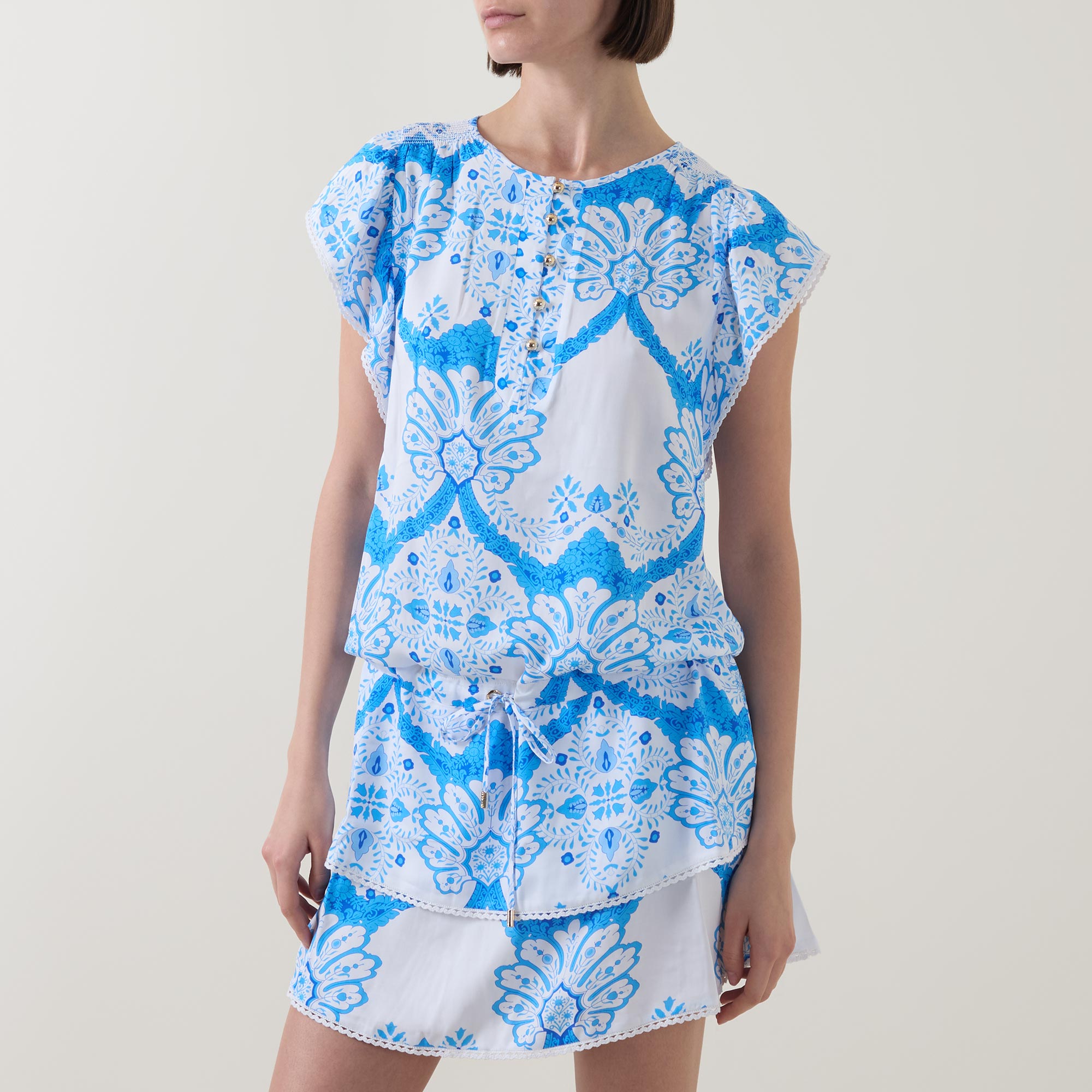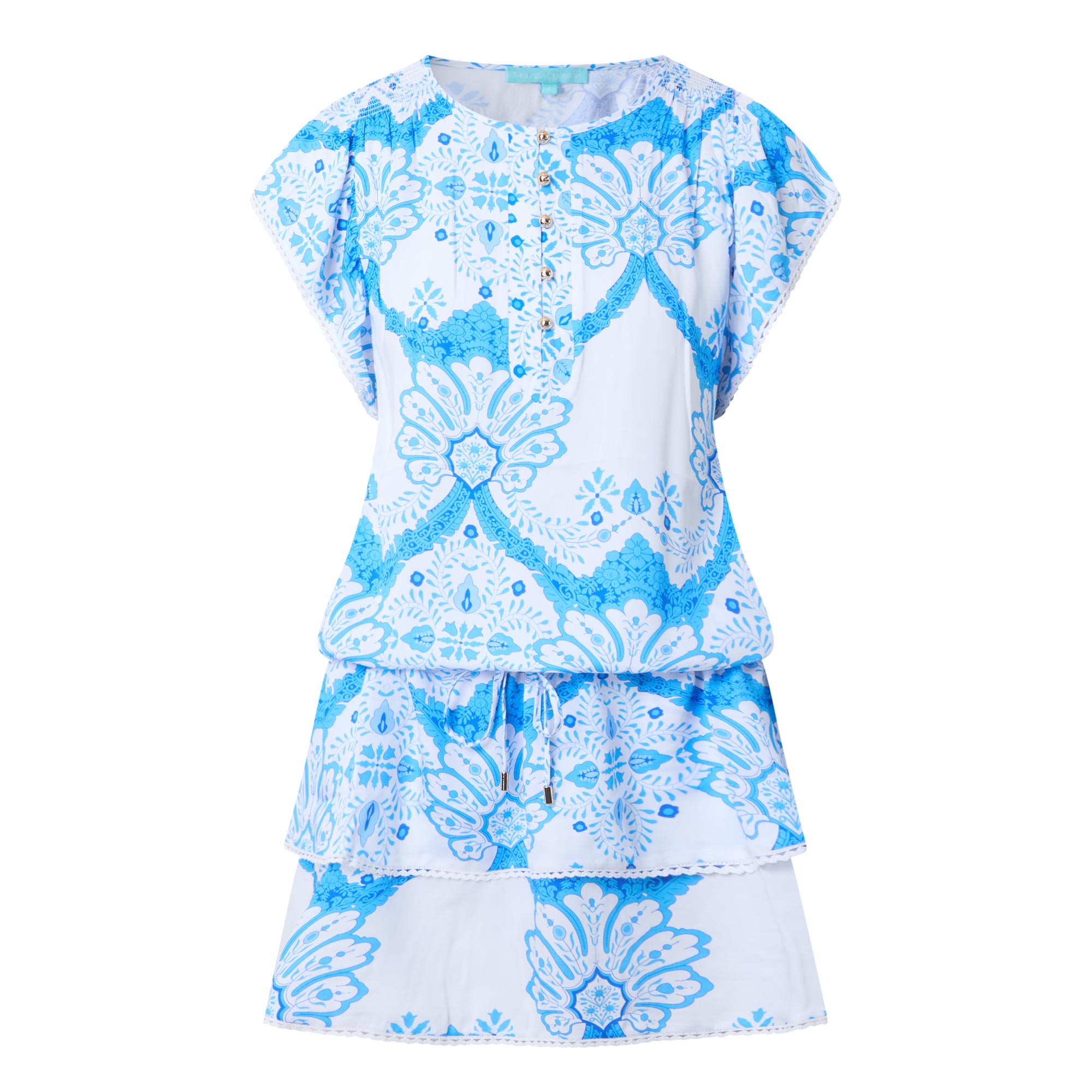 - Round neckline, half button fastening, cap sleeves, drawstring adjustable waist, tiered skirt, embroidered trims, Florian motif print