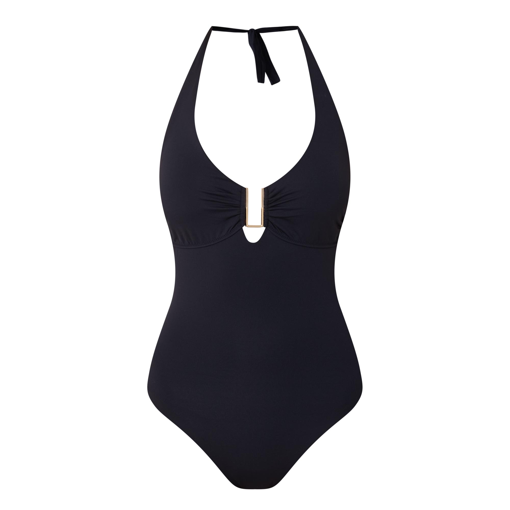 • Halterneck swimsuit, removable pads, gold-tone U-trim detail, cheeky coverage