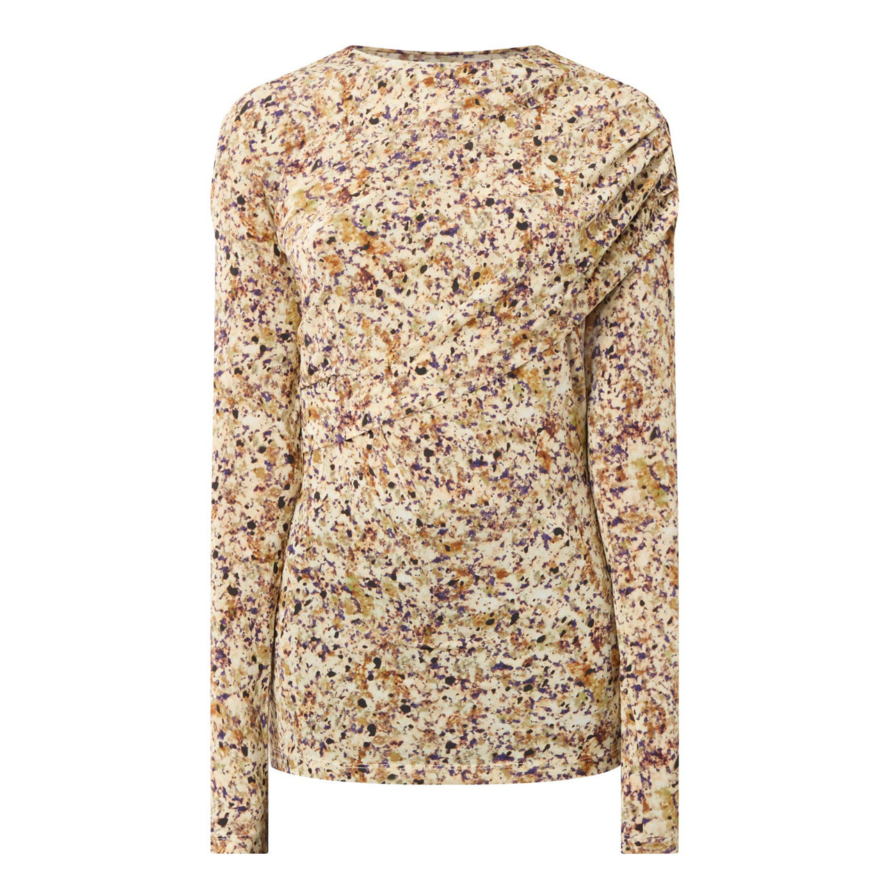 - Long sleeves, round neckline, abstract print, ruched detailing, straight hemline, smooth fabric