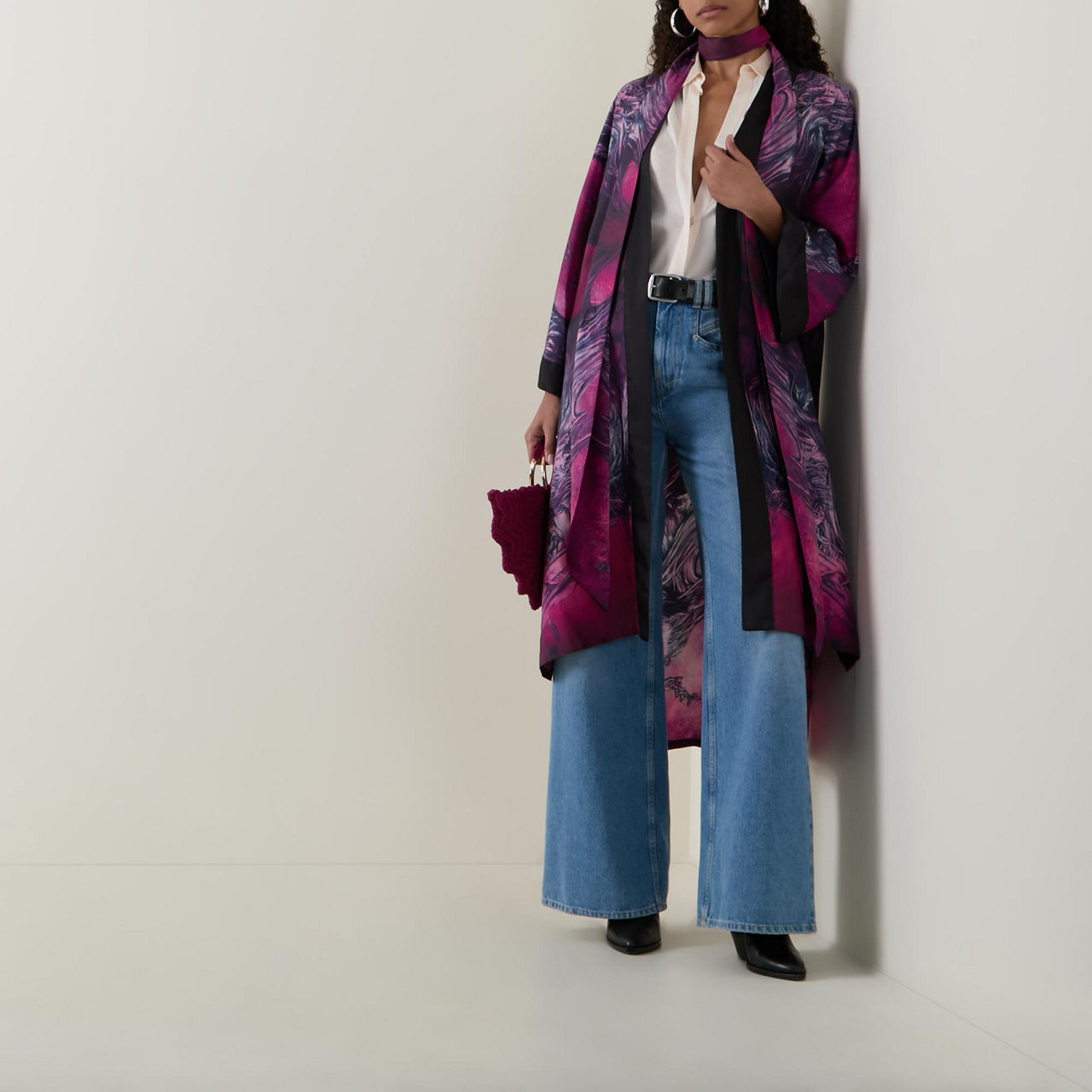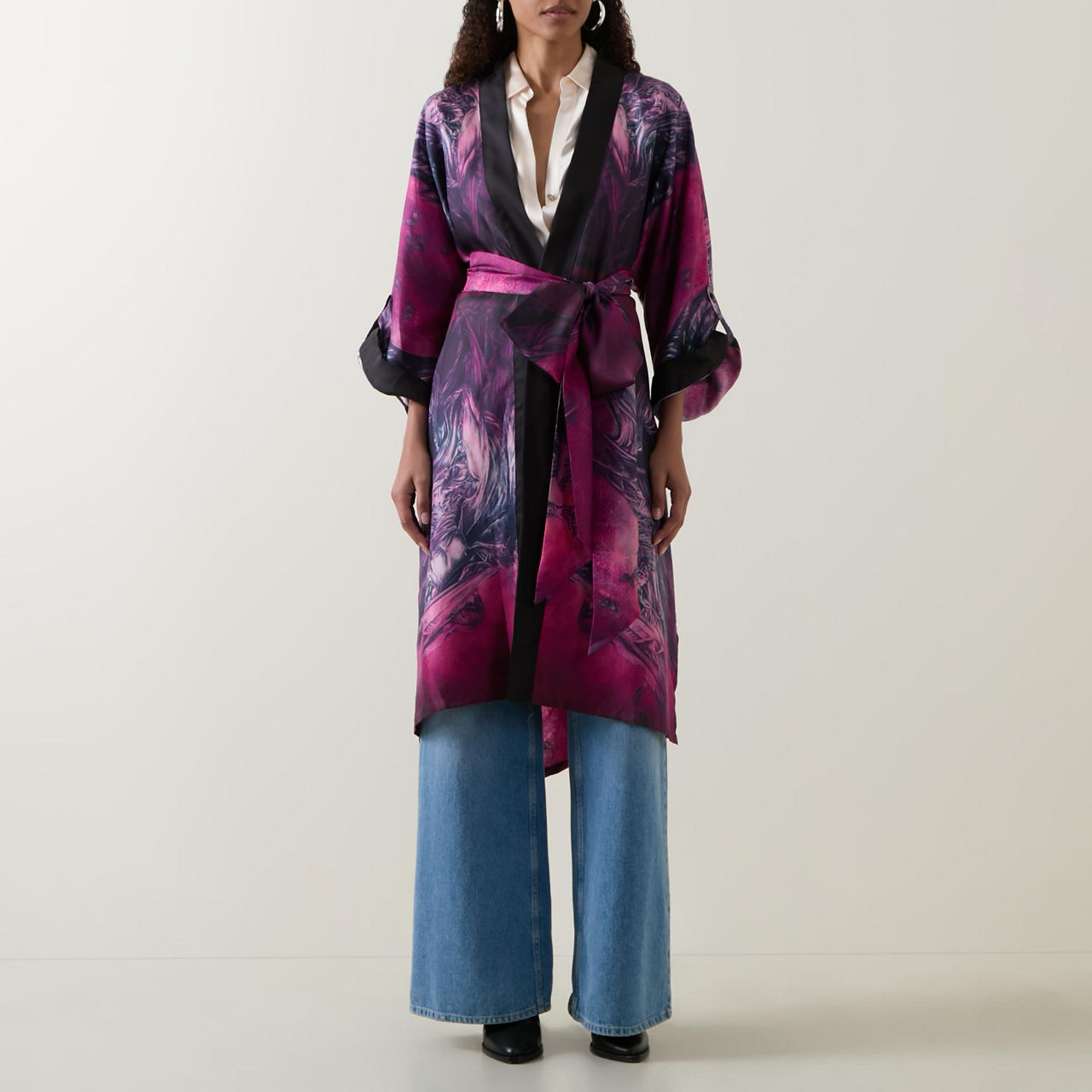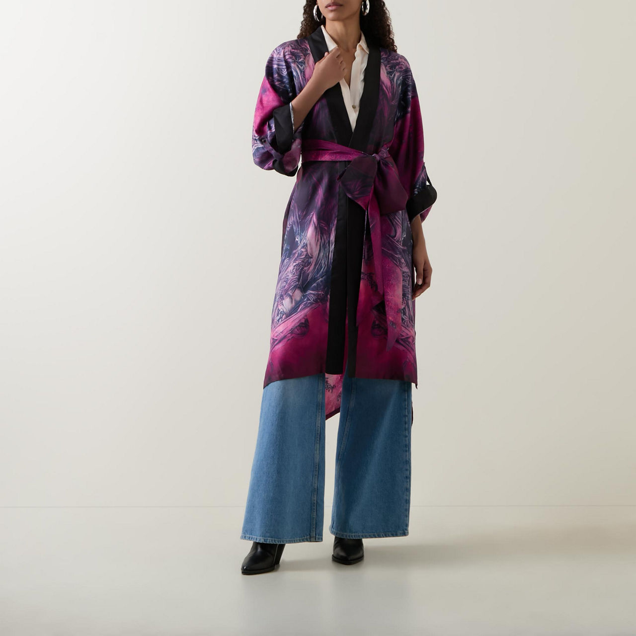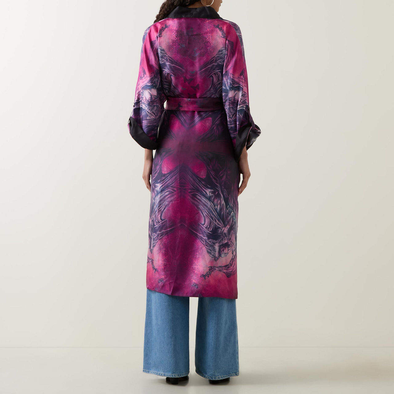 - Shawl collar, longline, self-tie belt, kimono style, rolled cuffs with tabs, split side seams, contrast trims, Banshee print