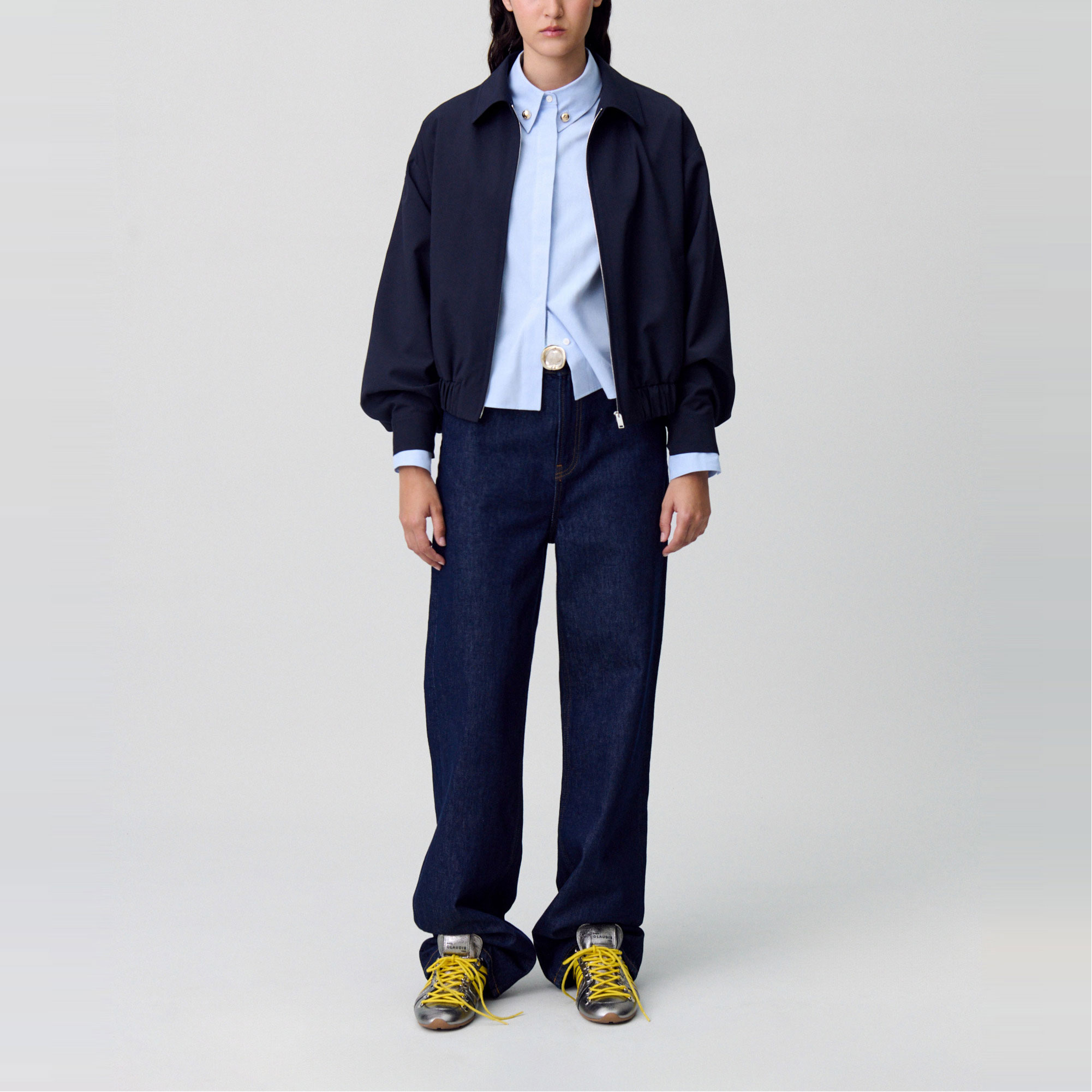- Modern boxy cut, gold-tone half-sphere buttons at collar tips, concealed button placket, buttoned cuffs, flat pleat to back