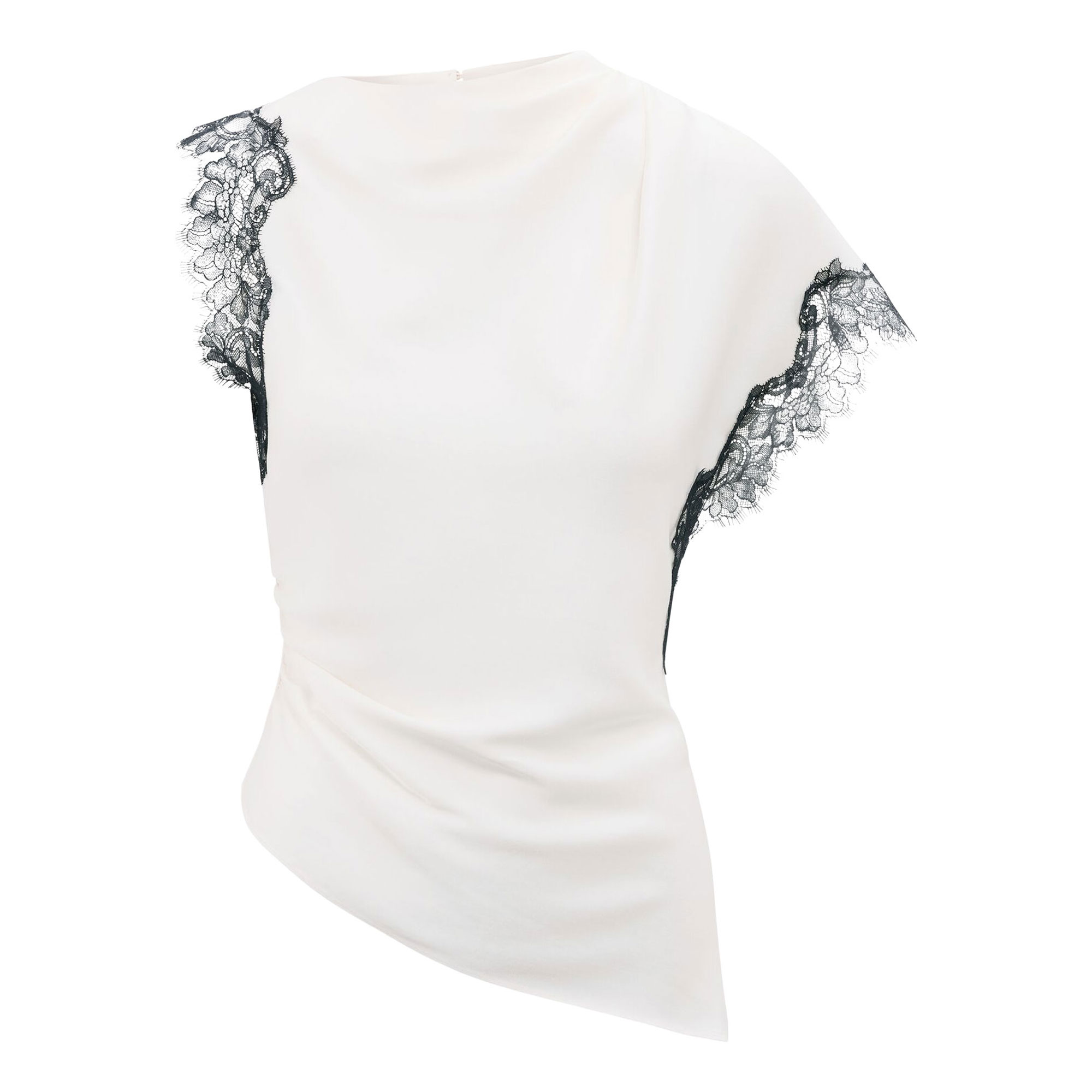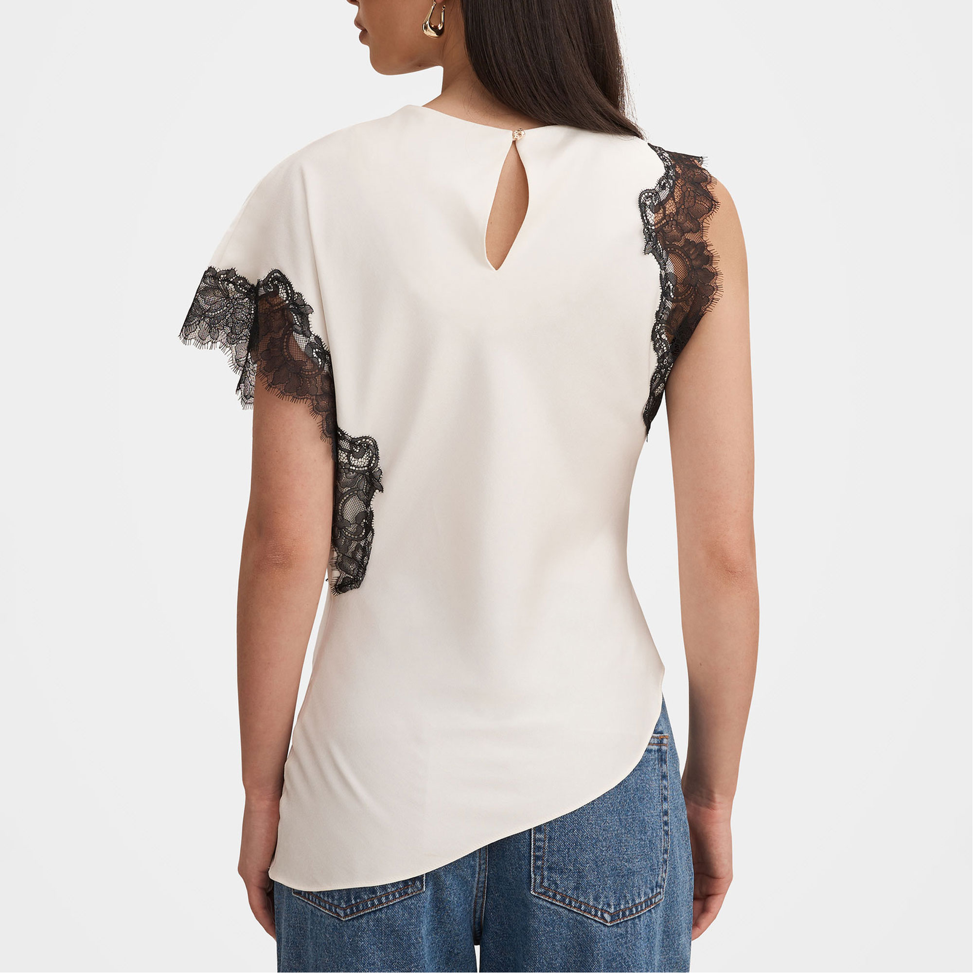 - Regular fit, high asymmetric neckline, left cap sleeve with lace trip, sleeveless right with lace trim, asymmetric hemline, hook and loop fastening at rear neck