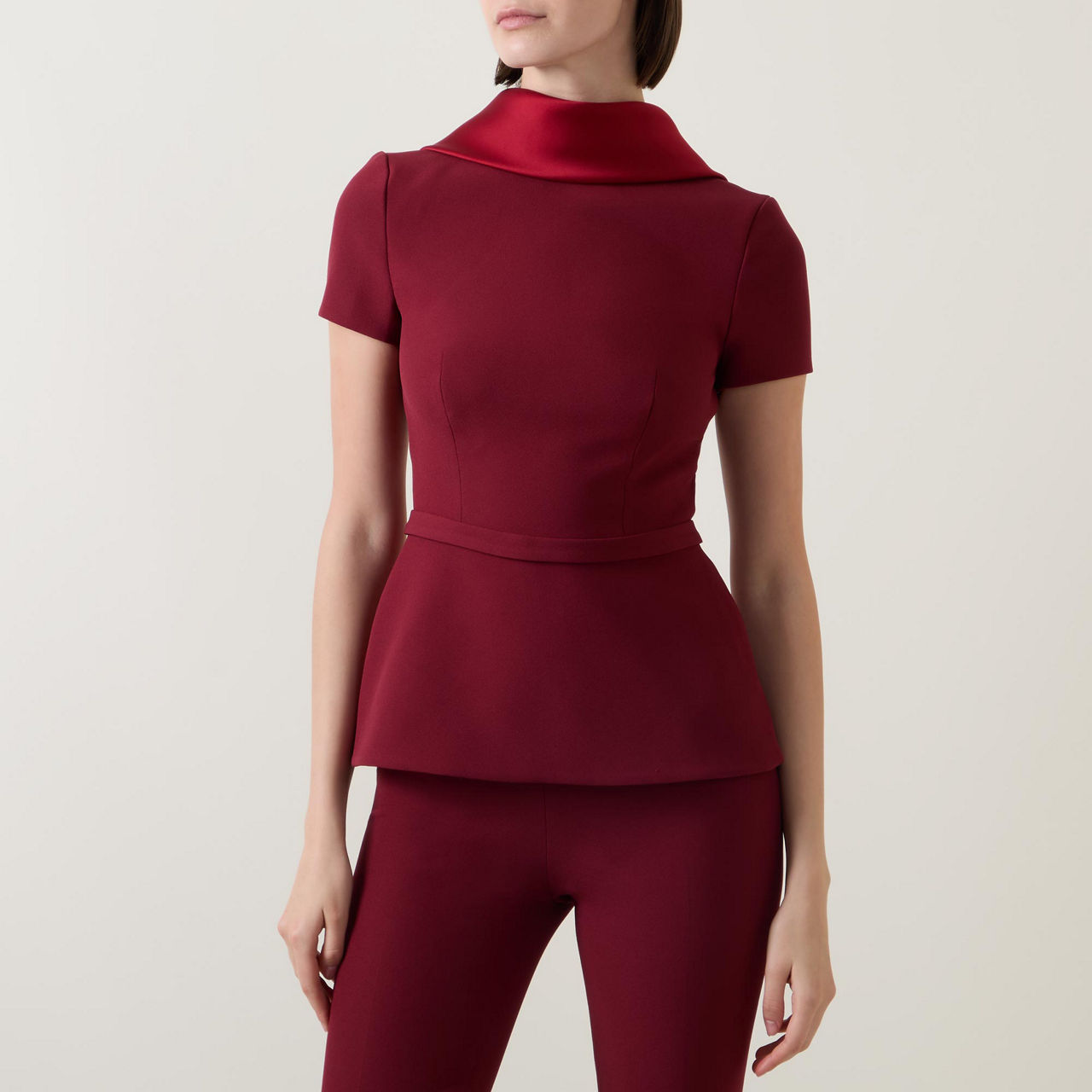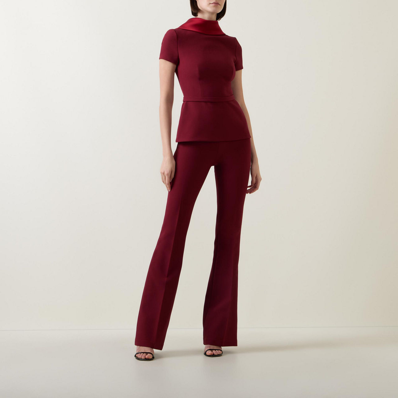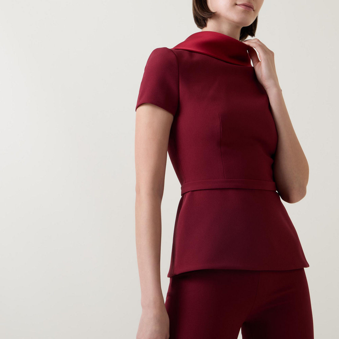 - High neckline in contrasting satin fabric, V-shaped back, rear concealed zip fastening, fitted through the waist, belt detail, peplum hem, smooth finish