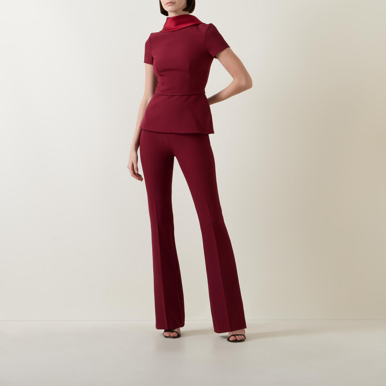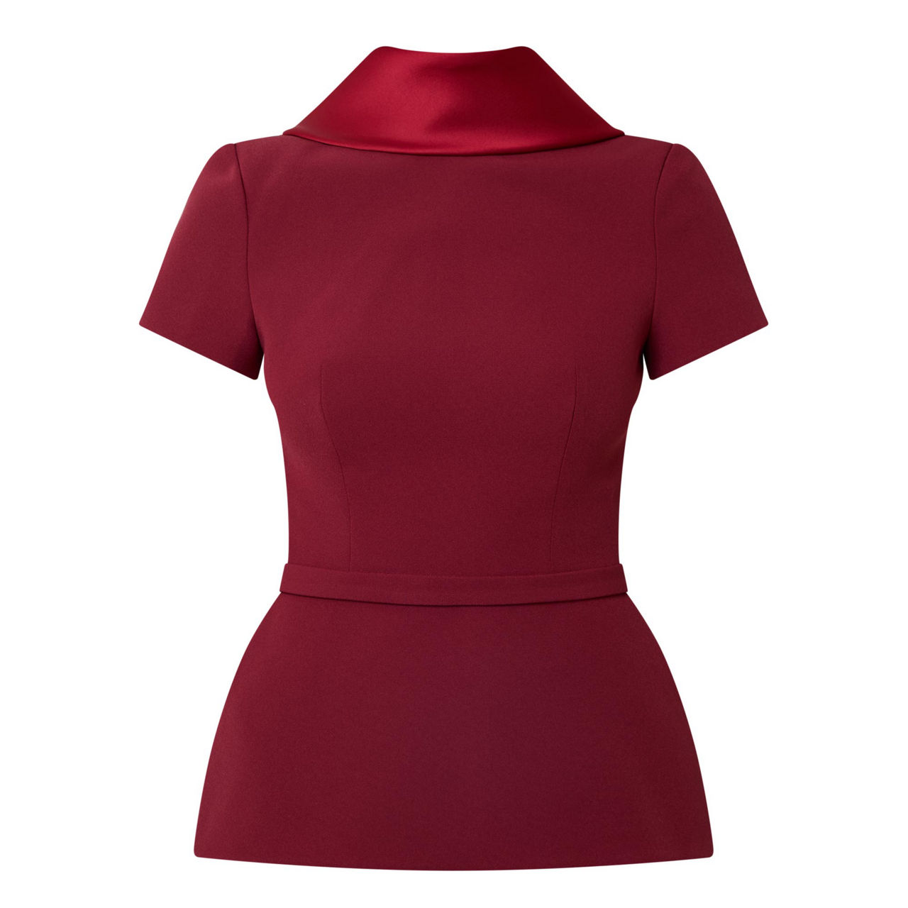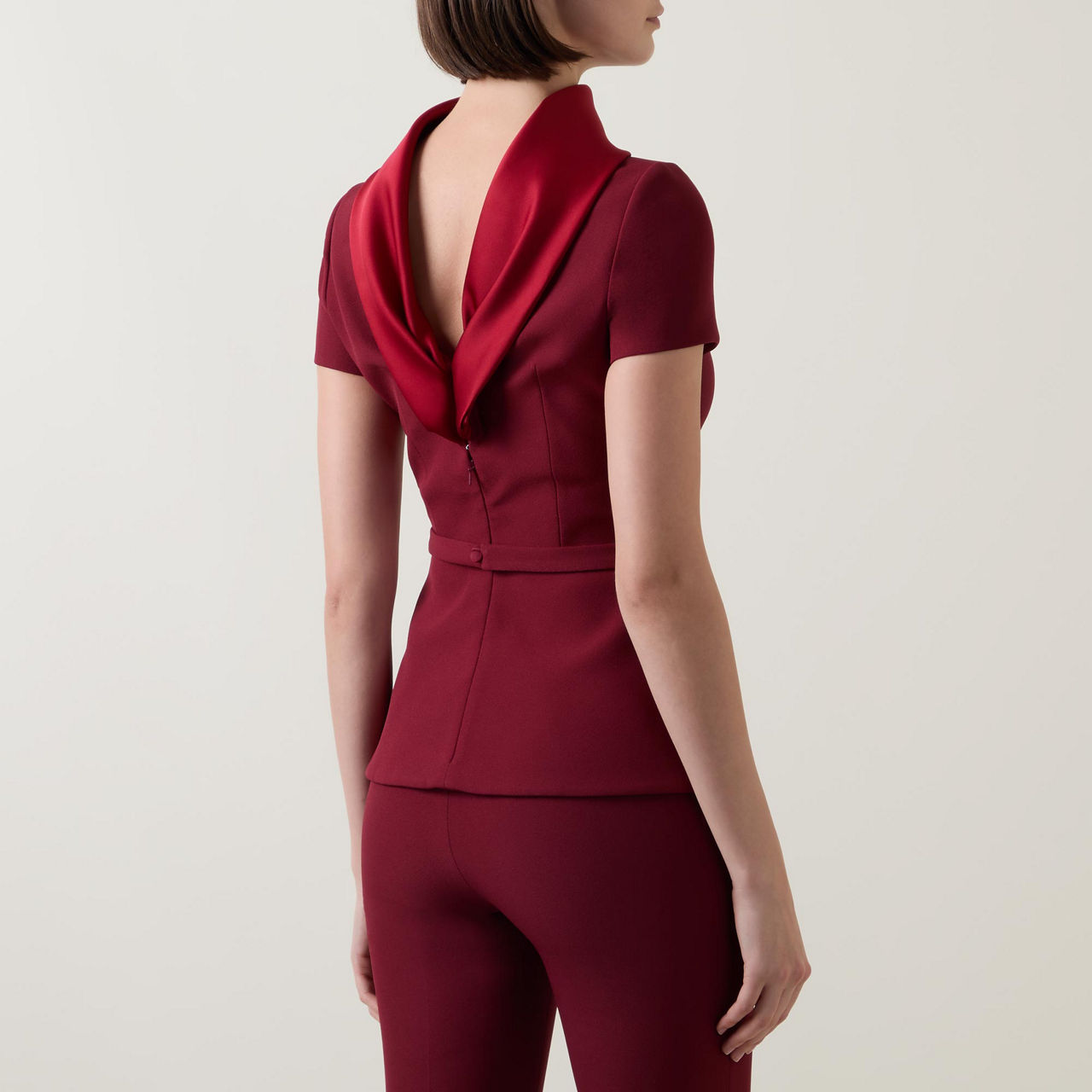 - High neckline in contrasting satin fabric, V-shaped back, rear concealed zip fastening, fitted through the waist, belt detail, peplum hem, smooth finish