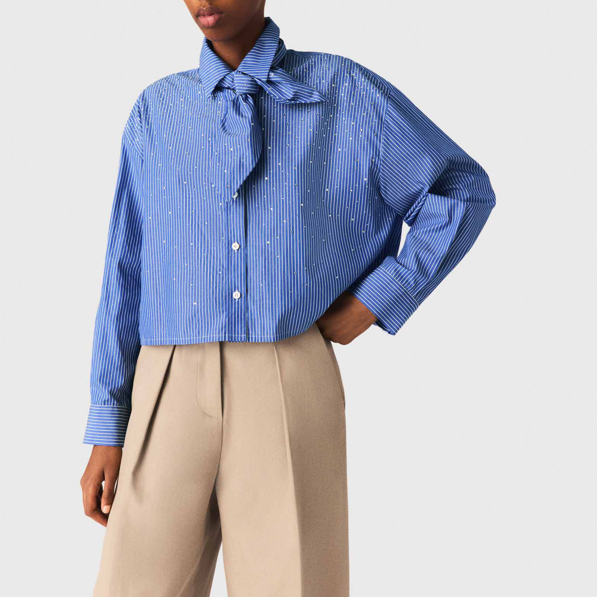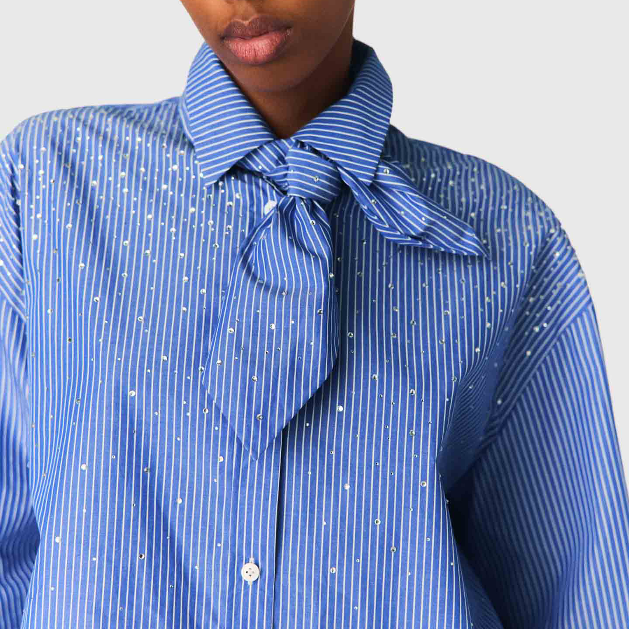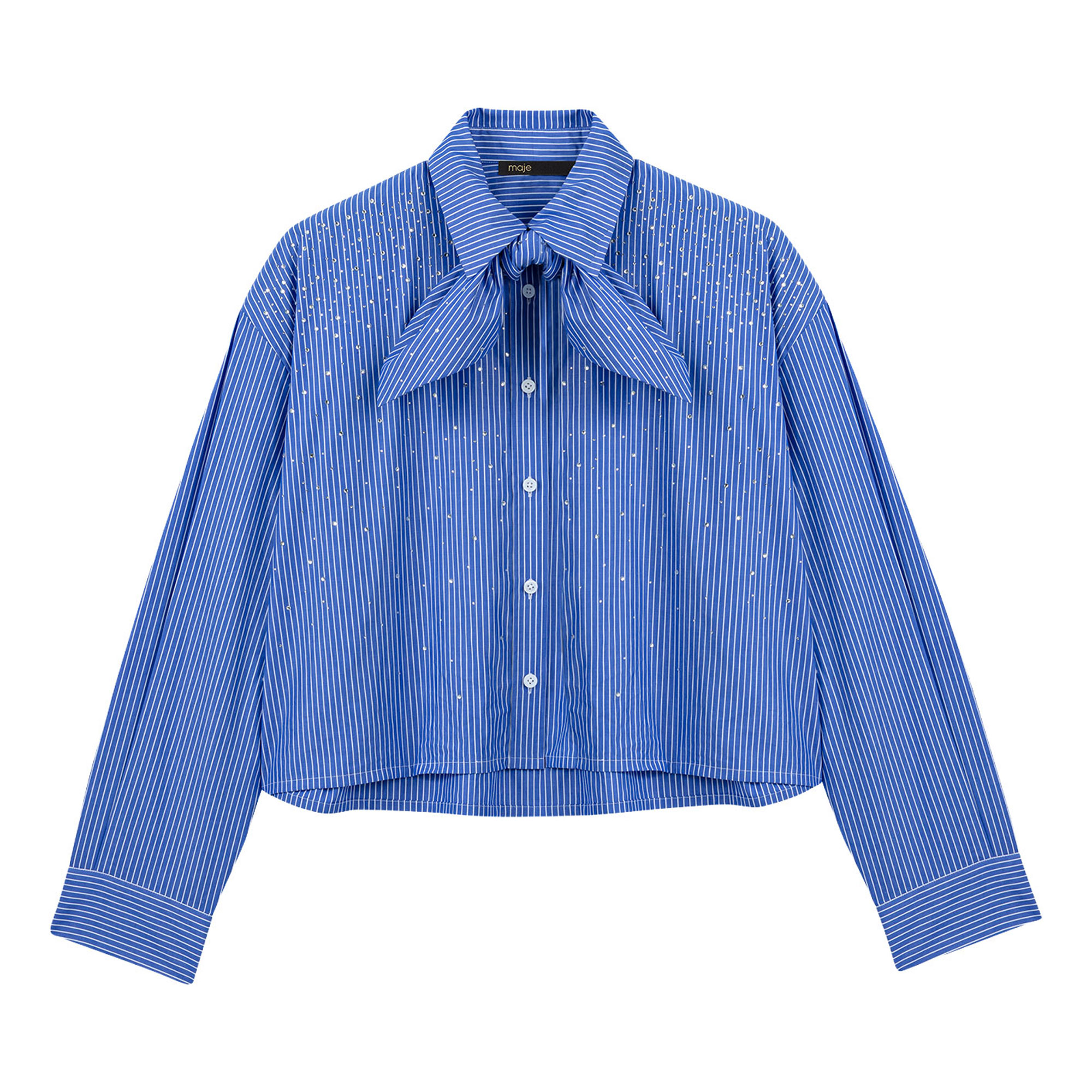 - Striped, removable tie-neck detail, silver-tone rhinestone embellishment, mother-of-pearl buttons, poplin fabric