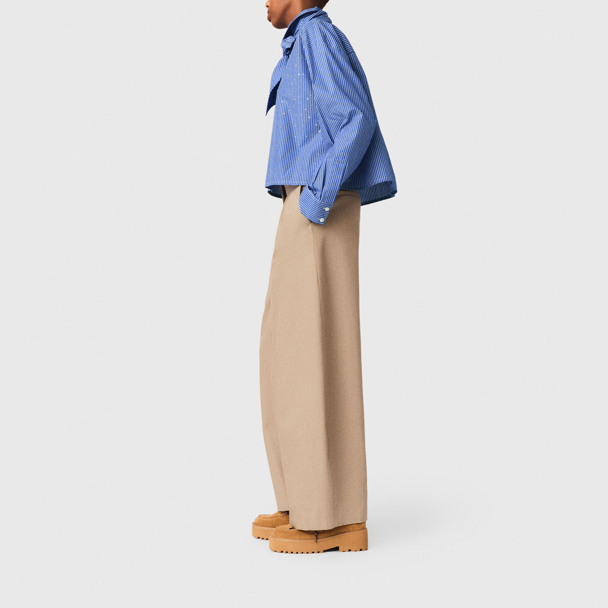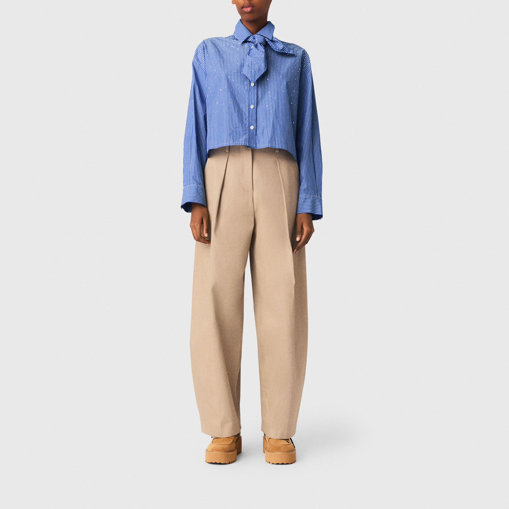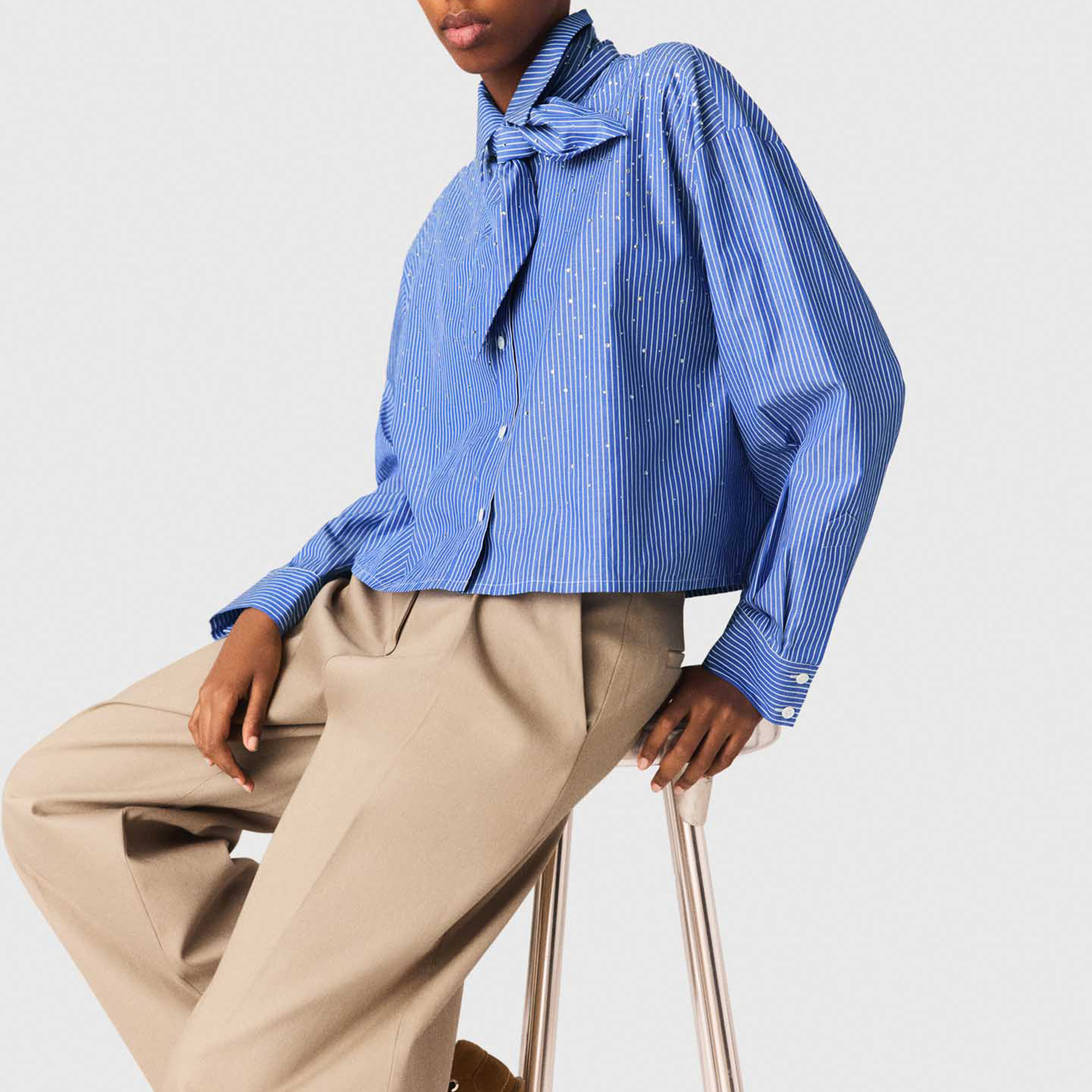- Striped, removable tie-neck detail, silver-tone rhinestone embellishment, mother-of-pearl buttons, poplin fabric