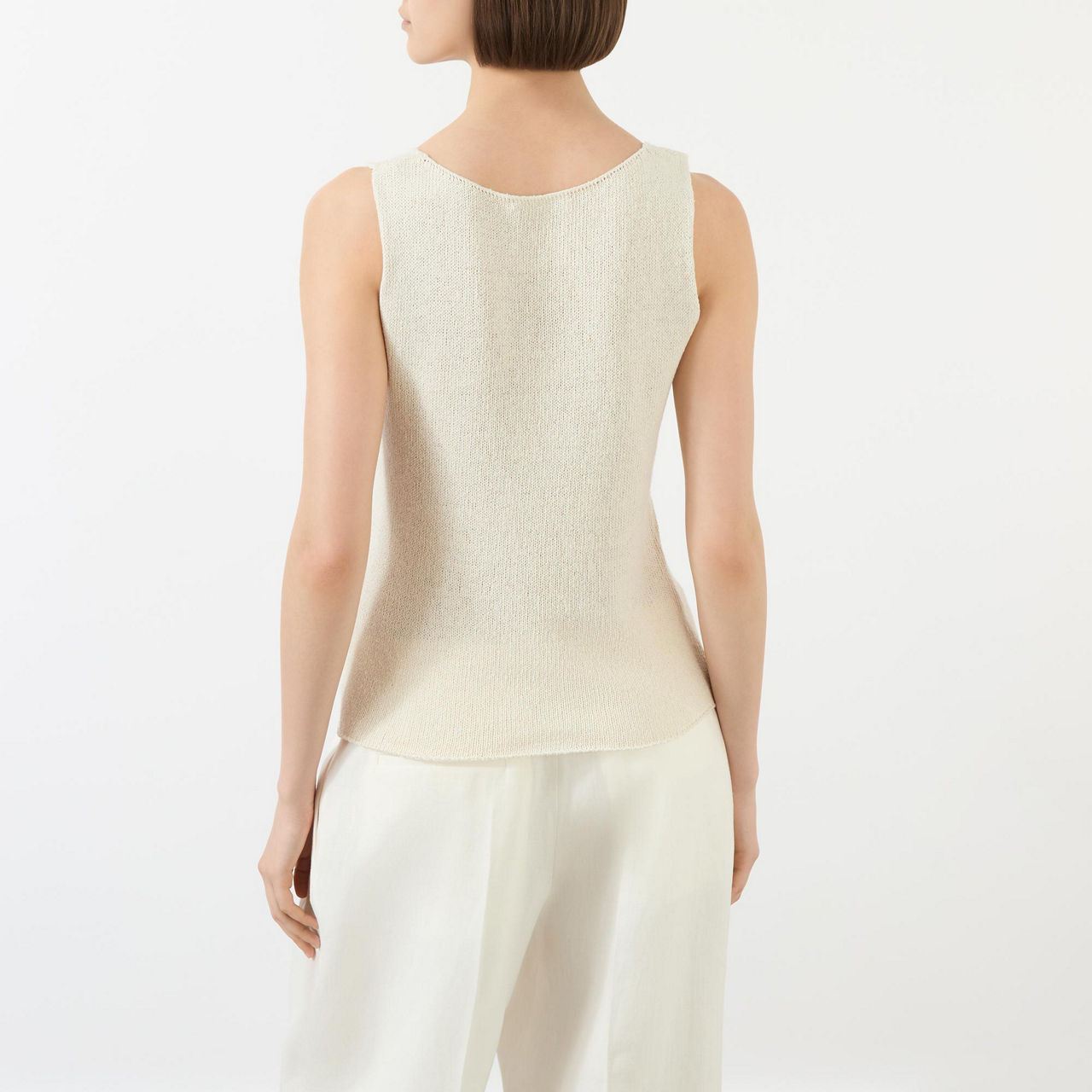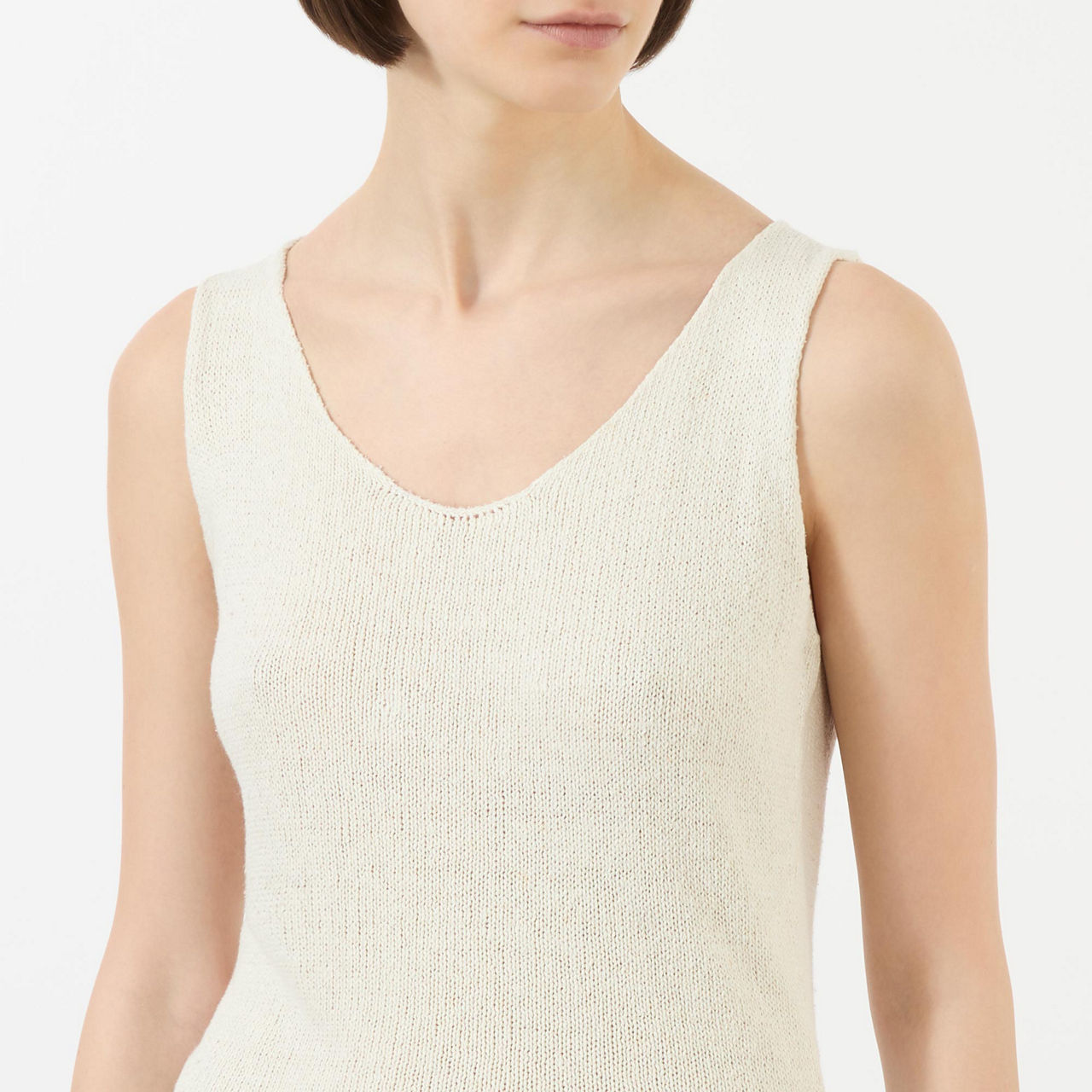 - Sleeveless, wide straps, scooped neckline, tonal stitching, smooth silk finish