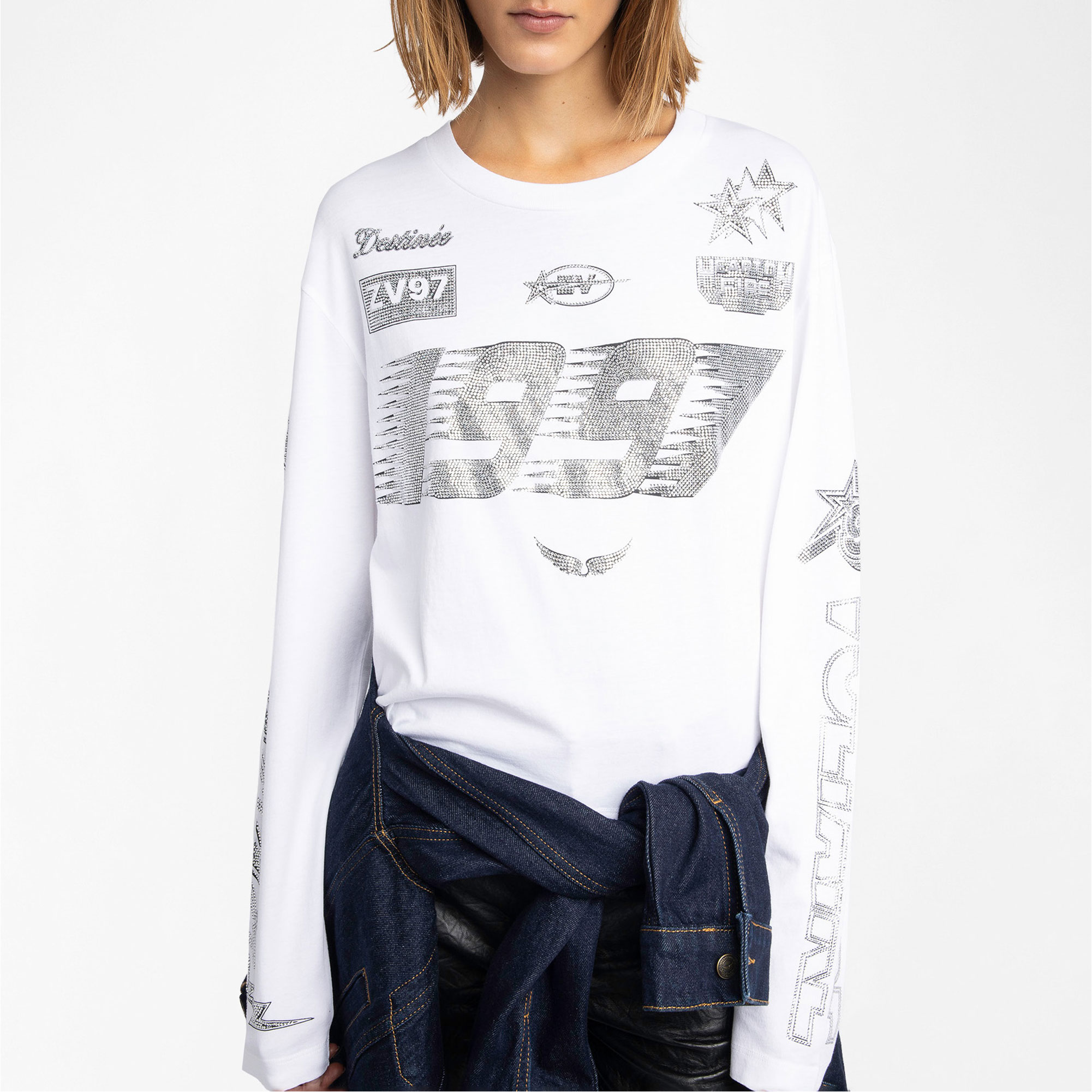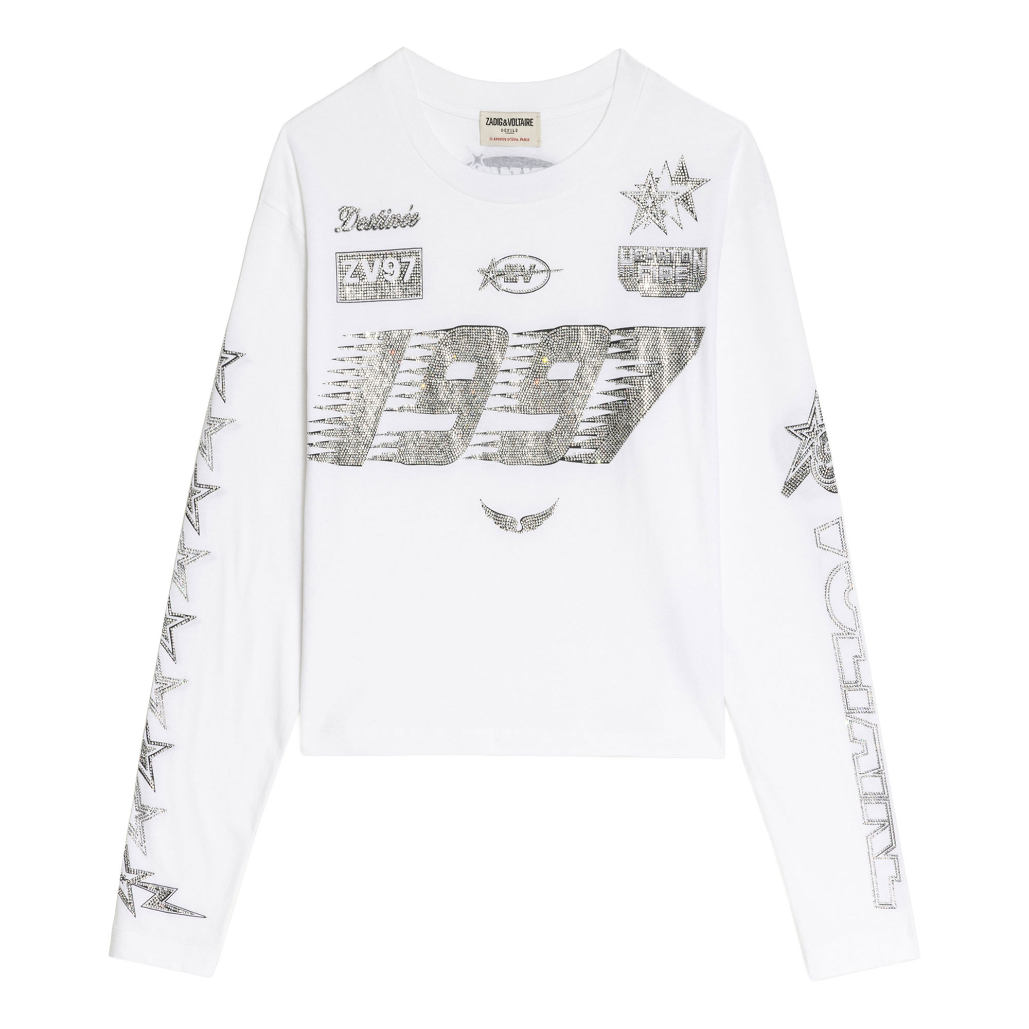- Long-sleeve, round neck, print and rhinestones details