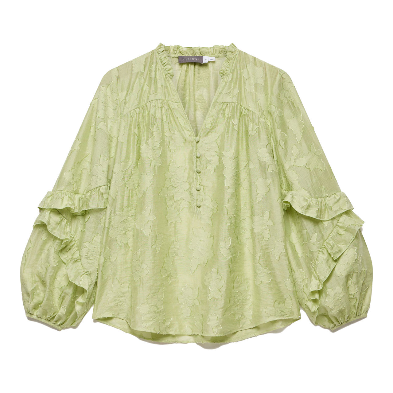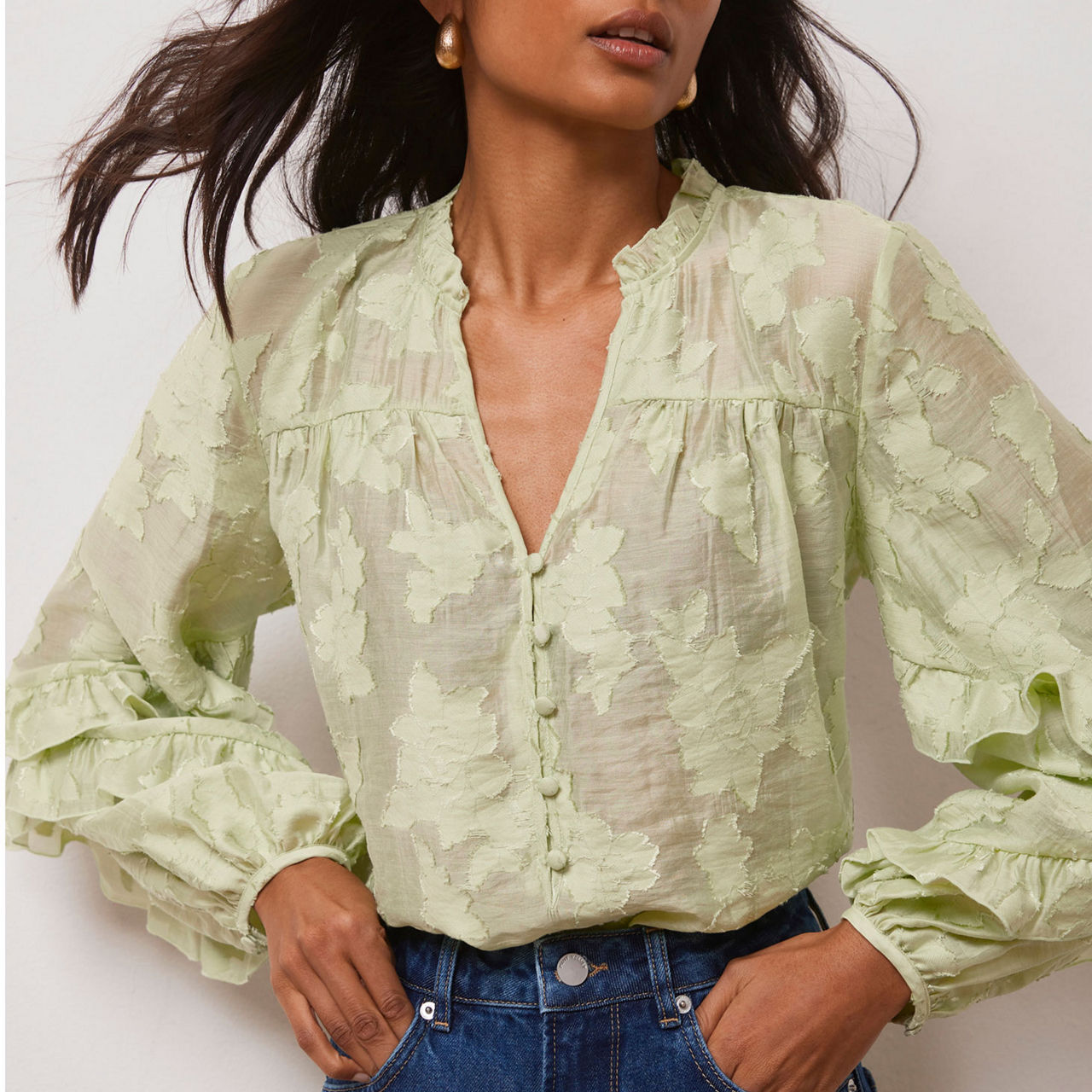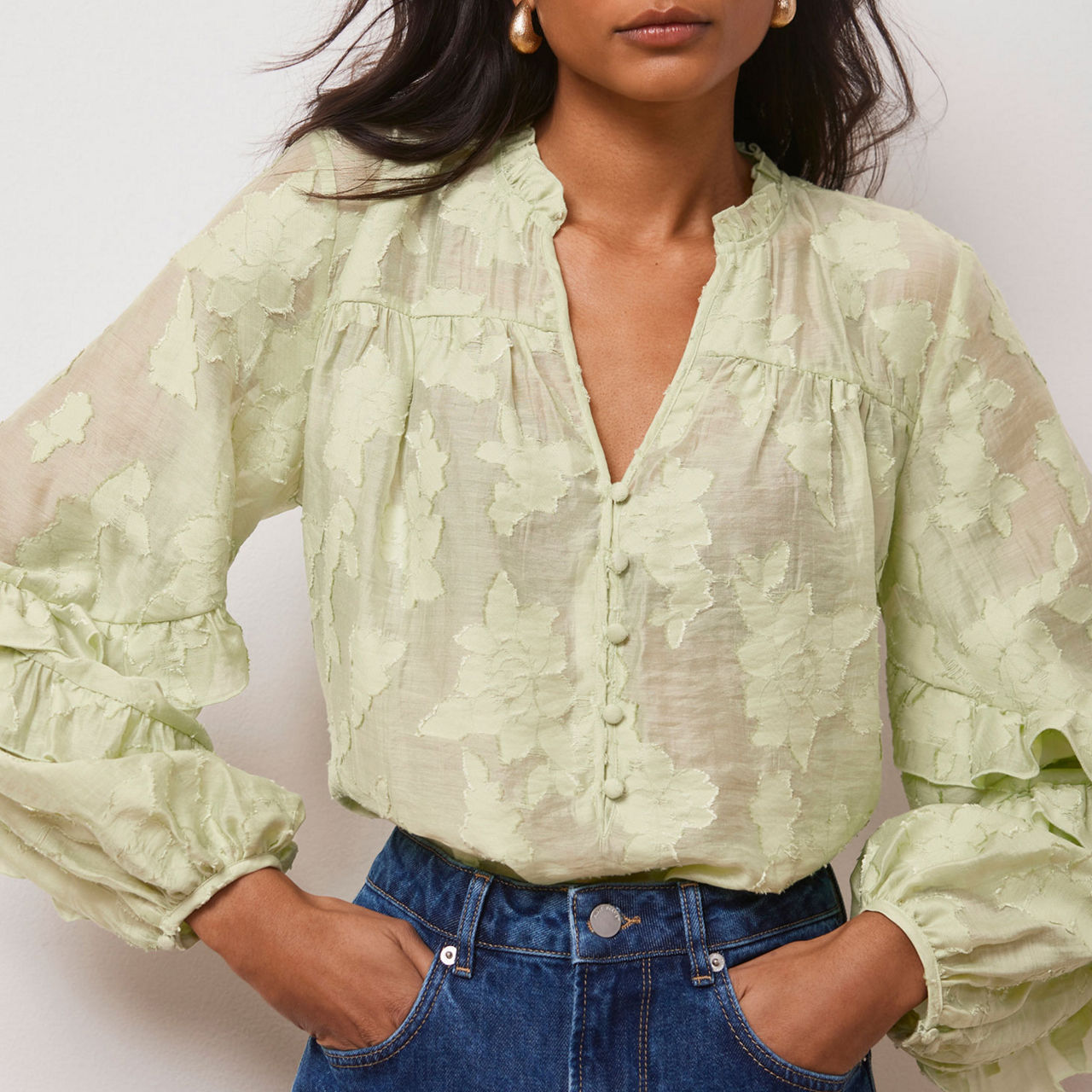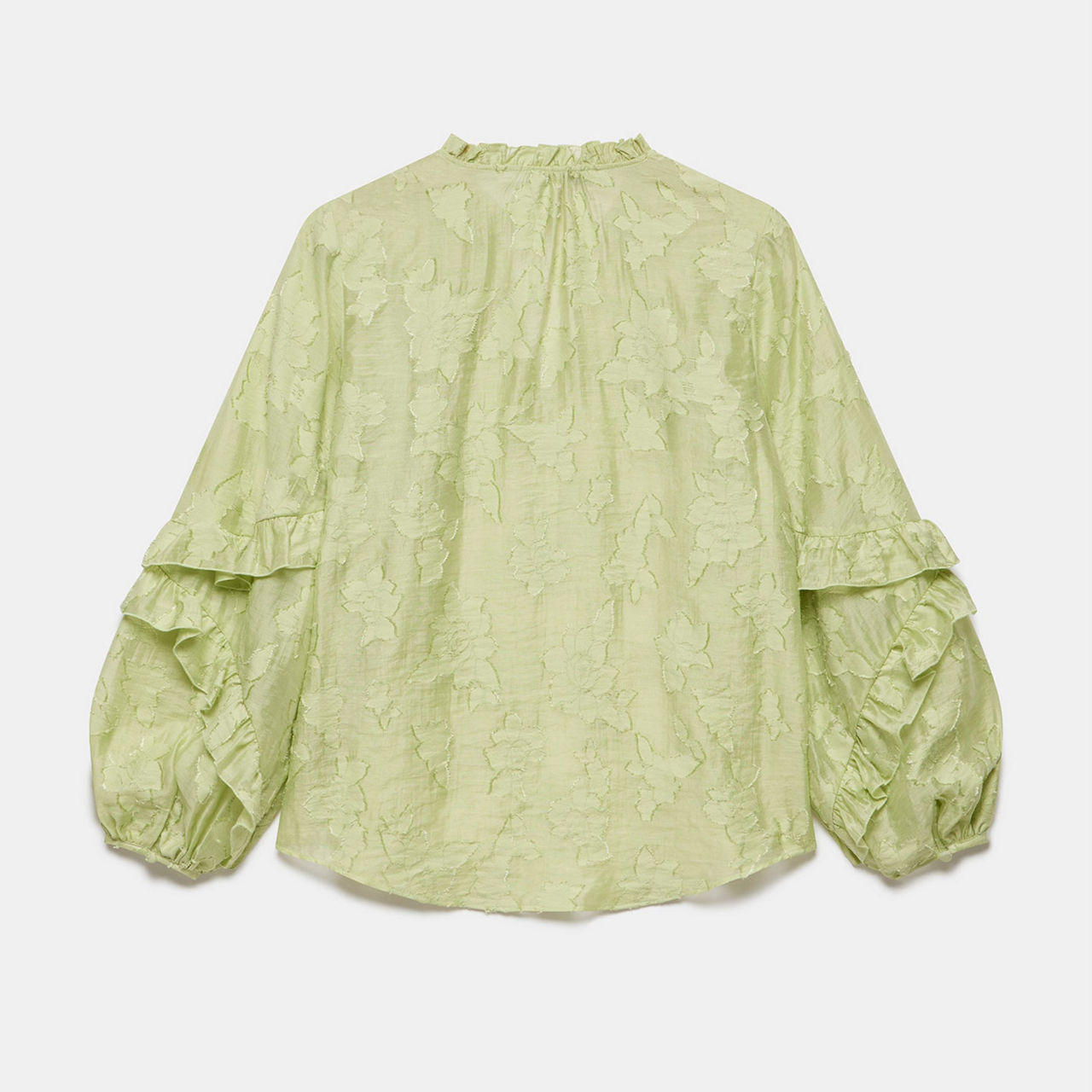 - Jacquard floral print, V-neckline, long ballooned sleeves, ruffle detailing, buttoned cuff, button fastening