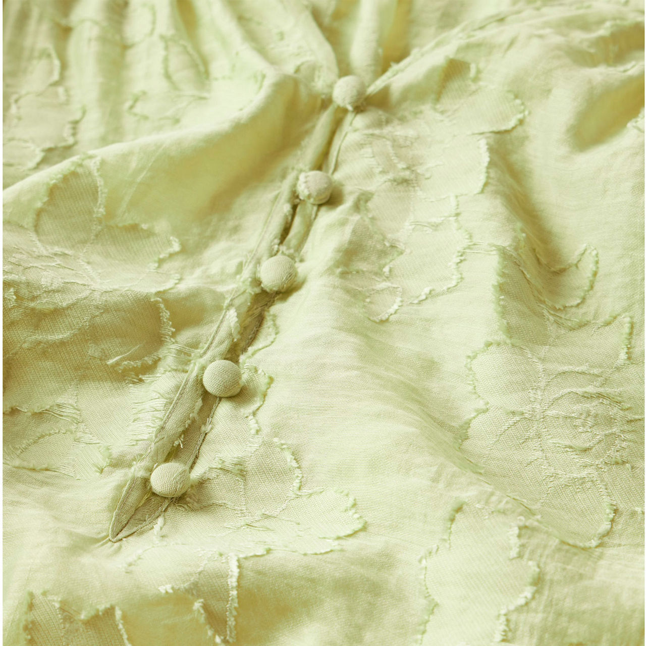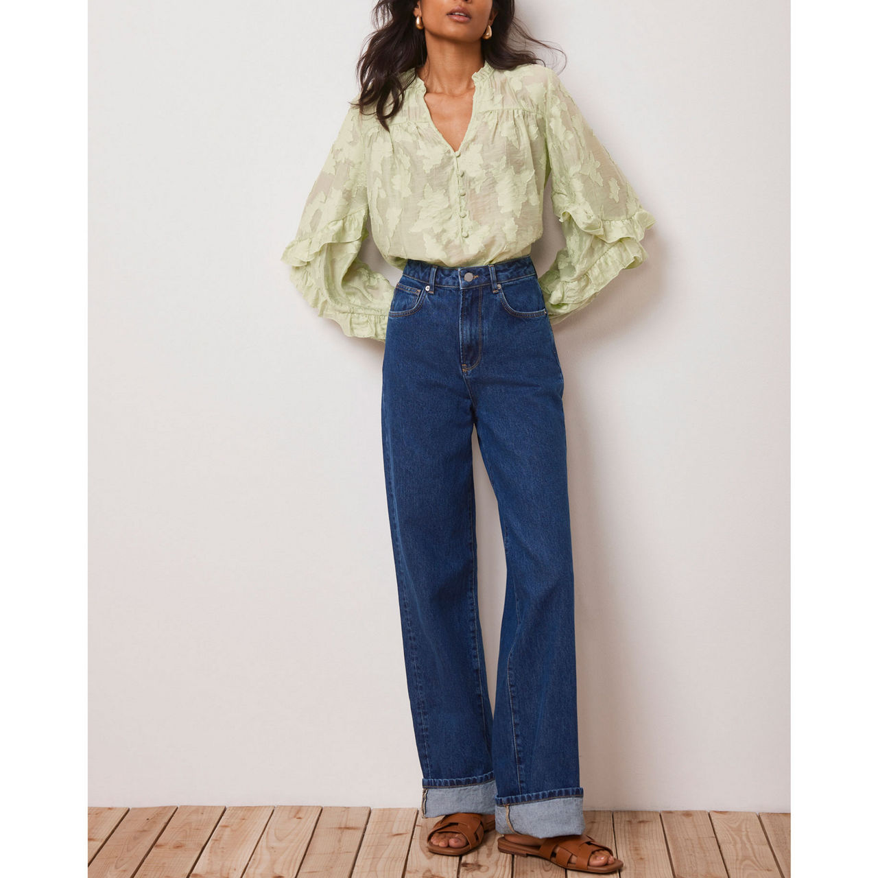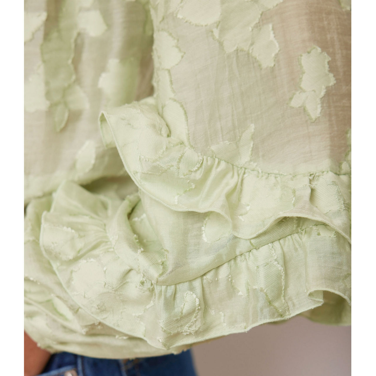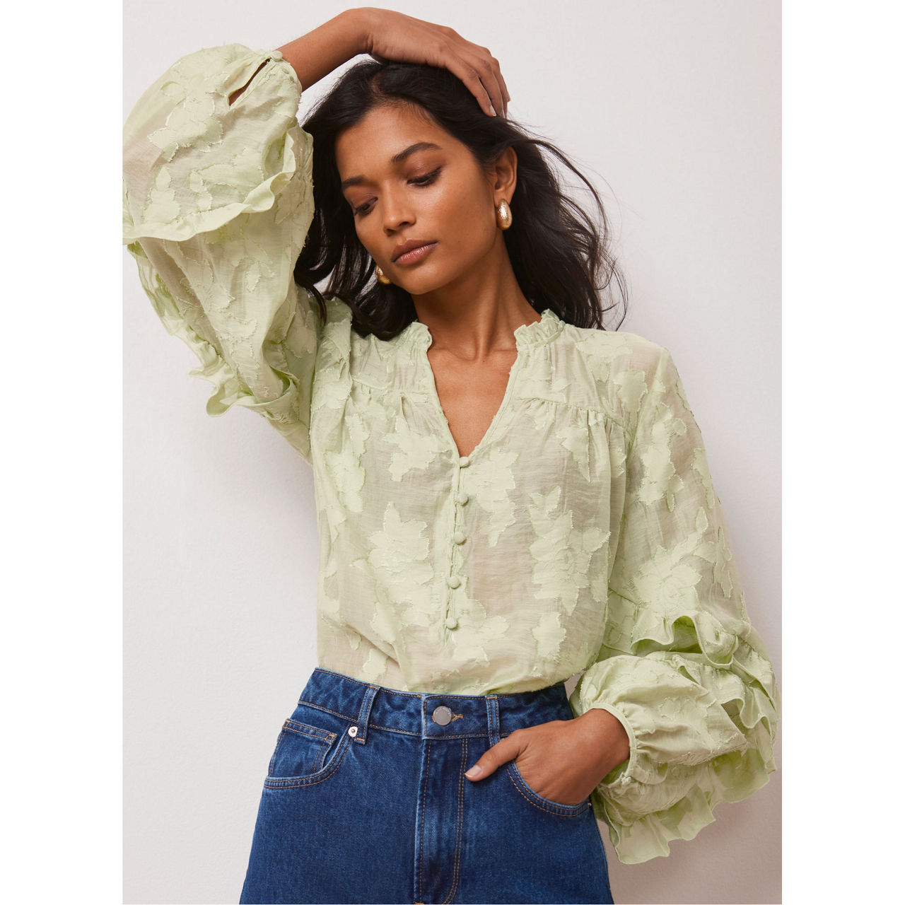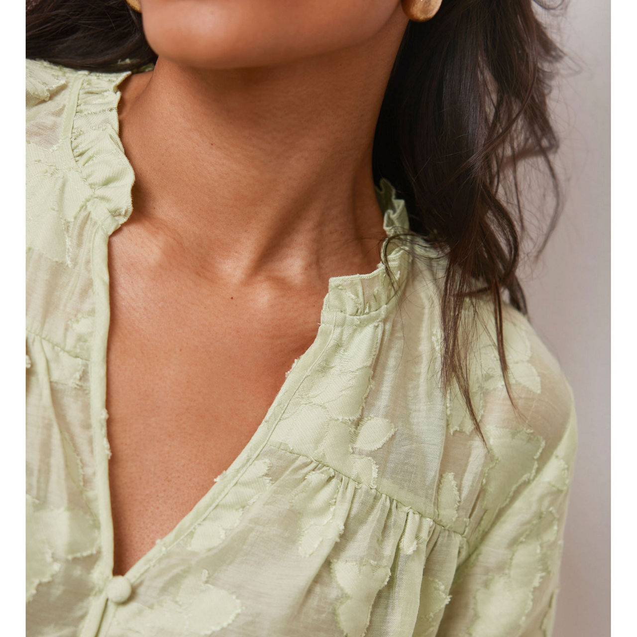 - Jacquard floral print, V-neckline, long ballooned sleeves, ruffle detailing, buttoned cuff, button fastening