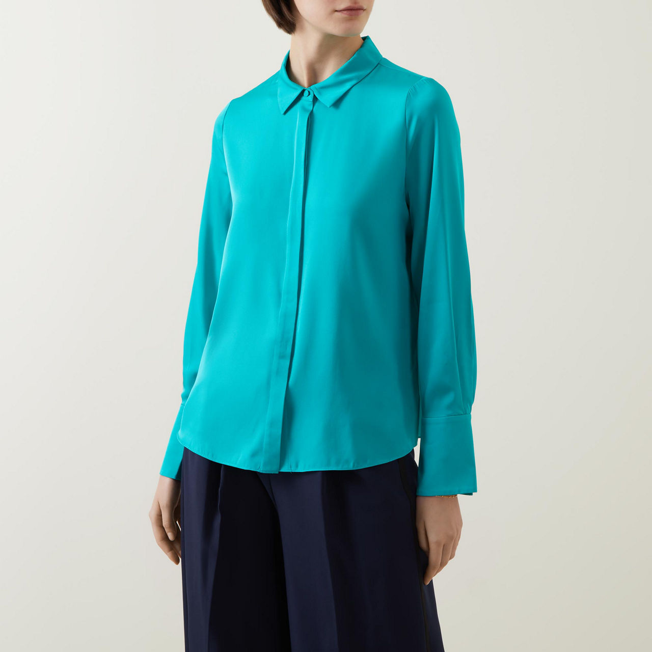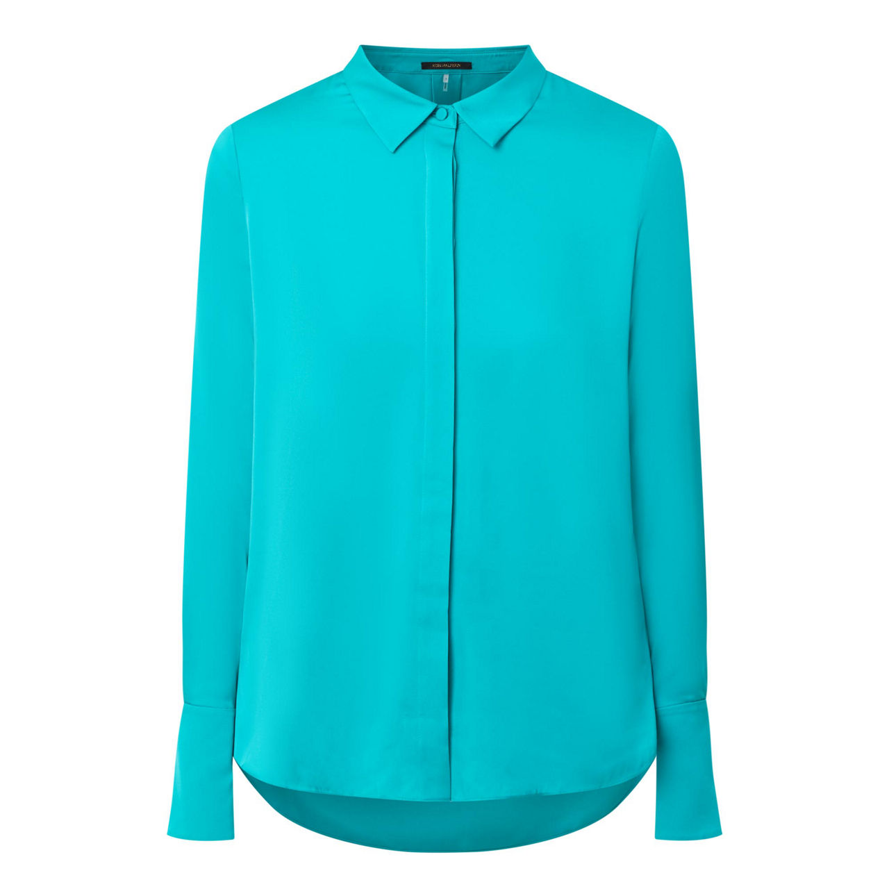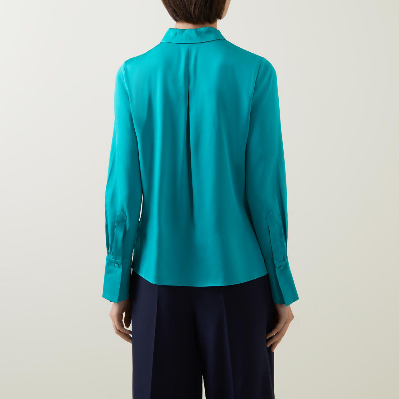 - Point collar, long sleeves, extended buttoned cuffs, concealed front button fastening, rear inverted pleat, straight hem