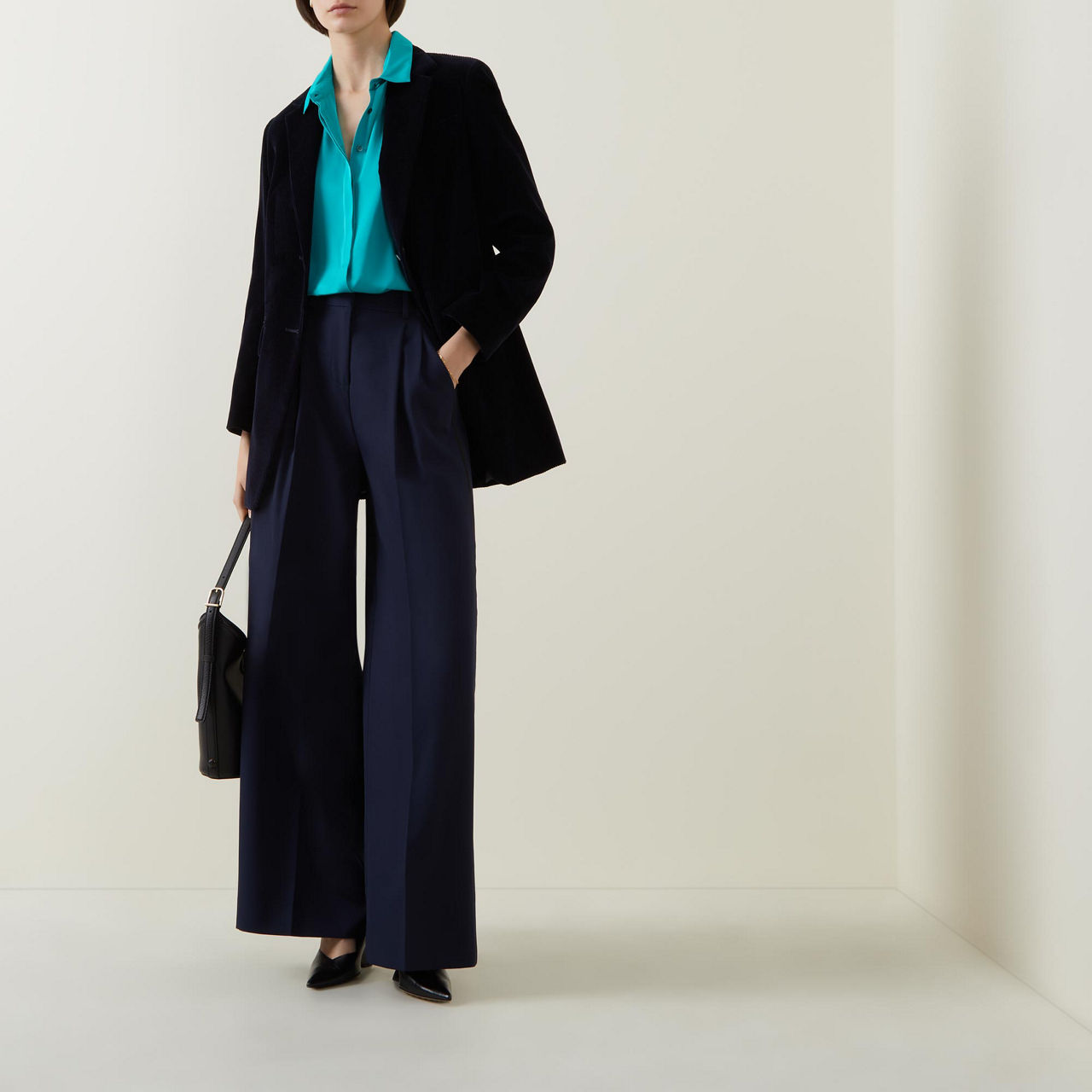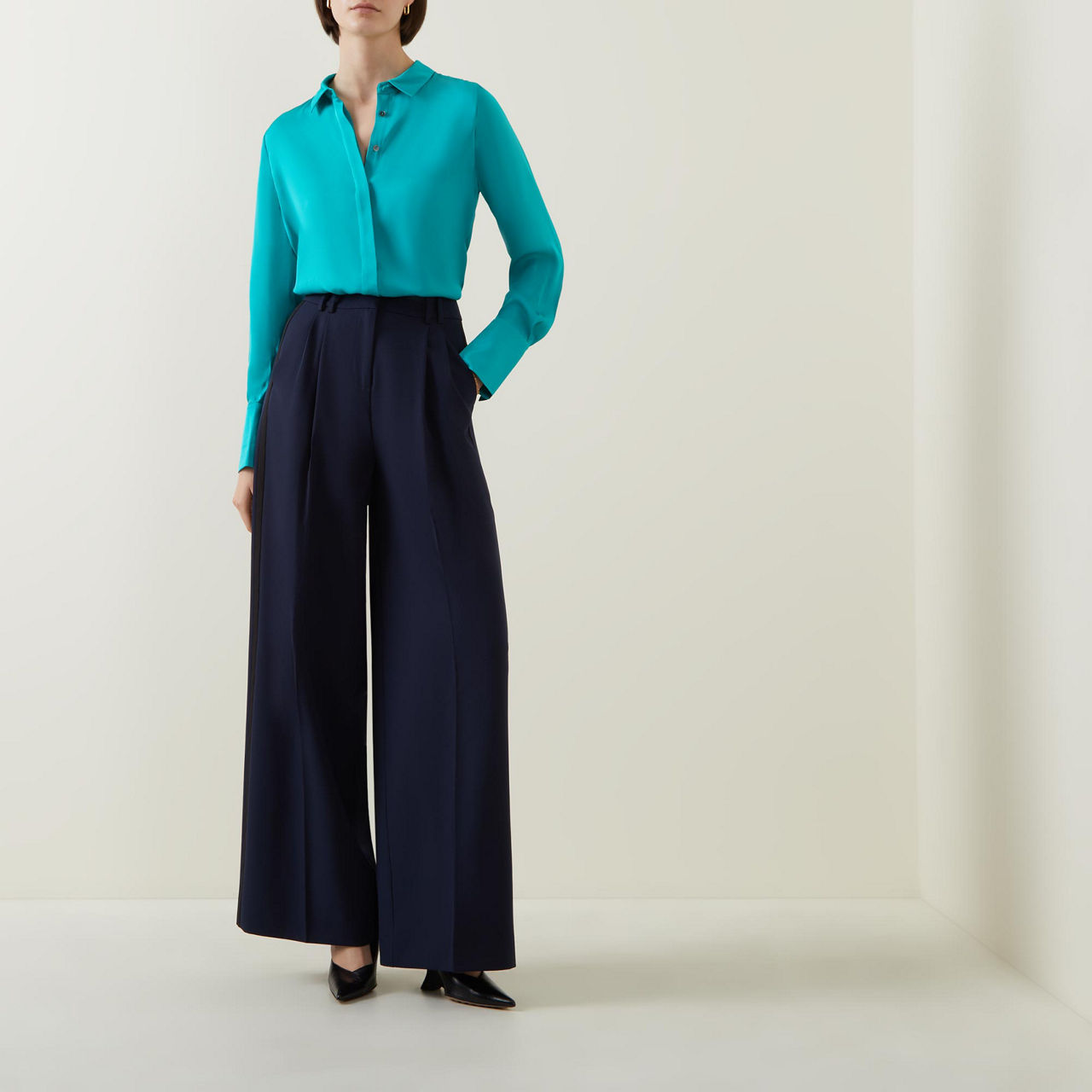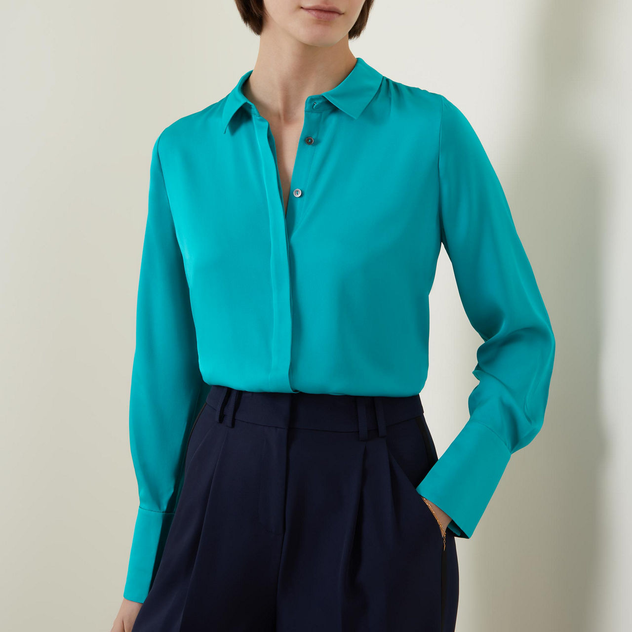 - Point collar, long sleeves, extended buttoned cuffs, concealed front button fastening, rear inverted pleat, straight hem