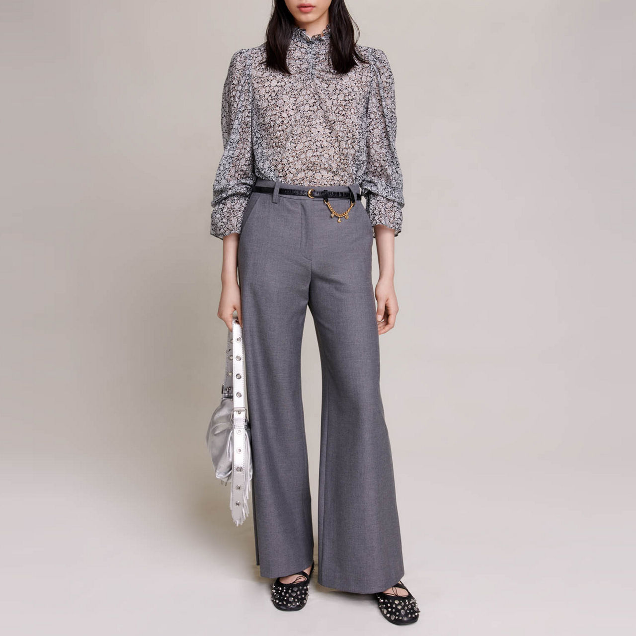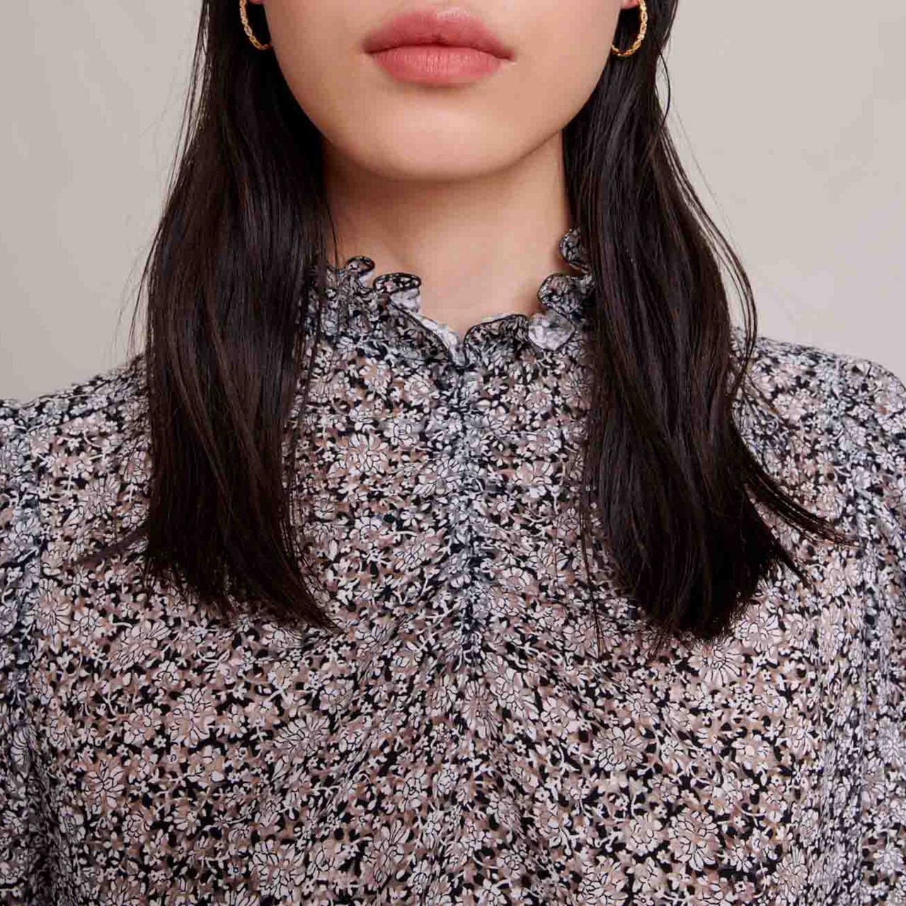 - See-through details, slightly puffed long sleeves, elasticated cuffs, high ruffled collar, ruched chest, floaty silhouette