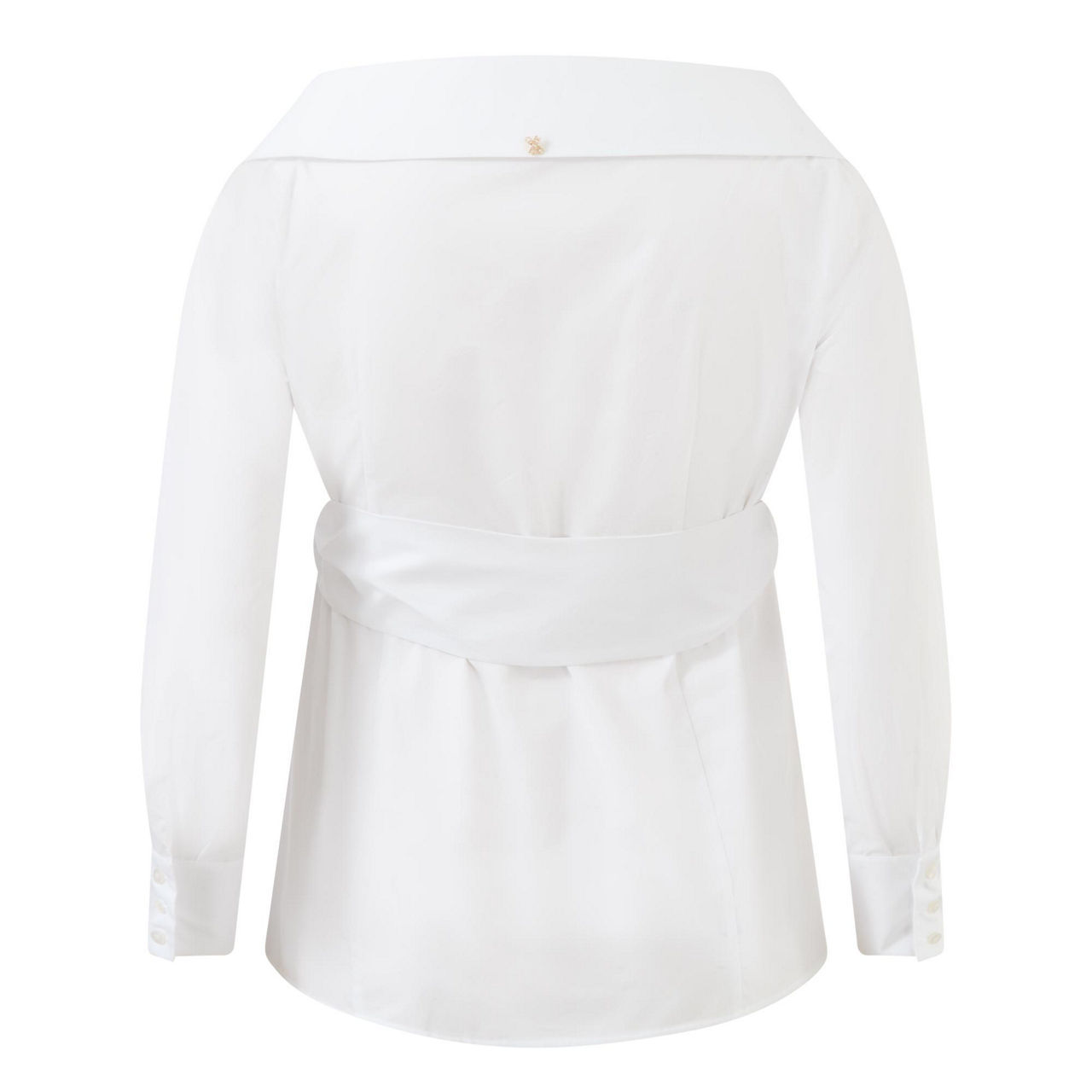 - Off-the-shoulder neckline, long cuffed sleeves, side knotted sash detail, attachable shoulder straps