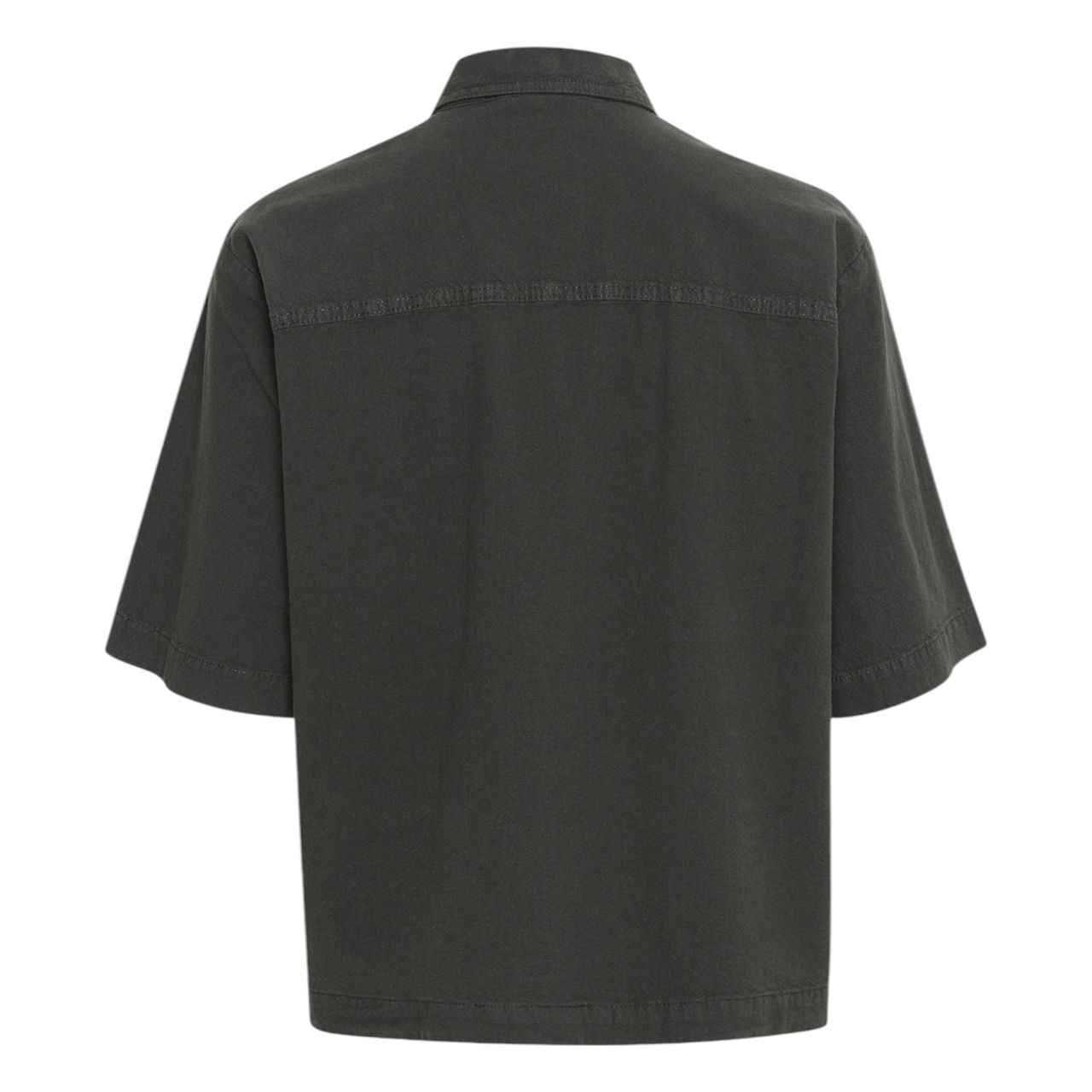 - Utility style, spread collar, front button fastenings, short sleeves, chest flap pockets