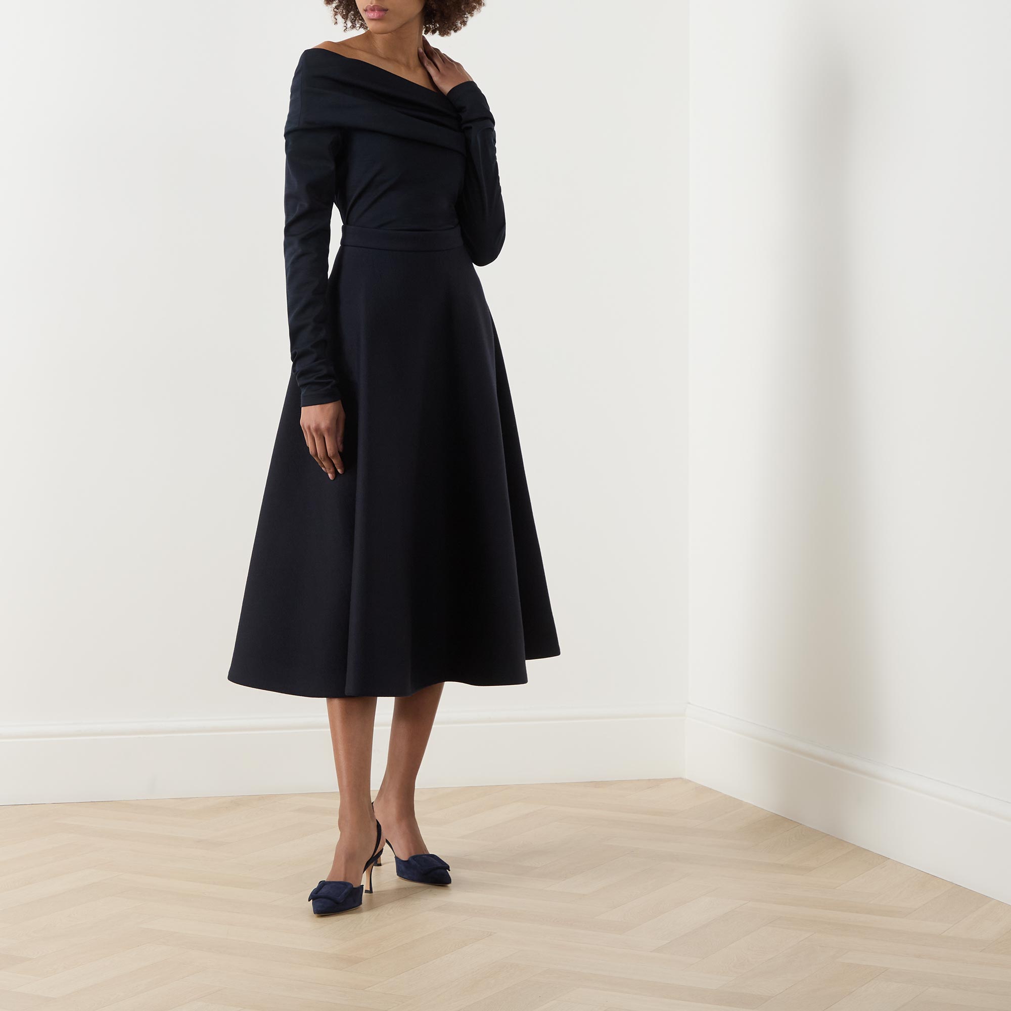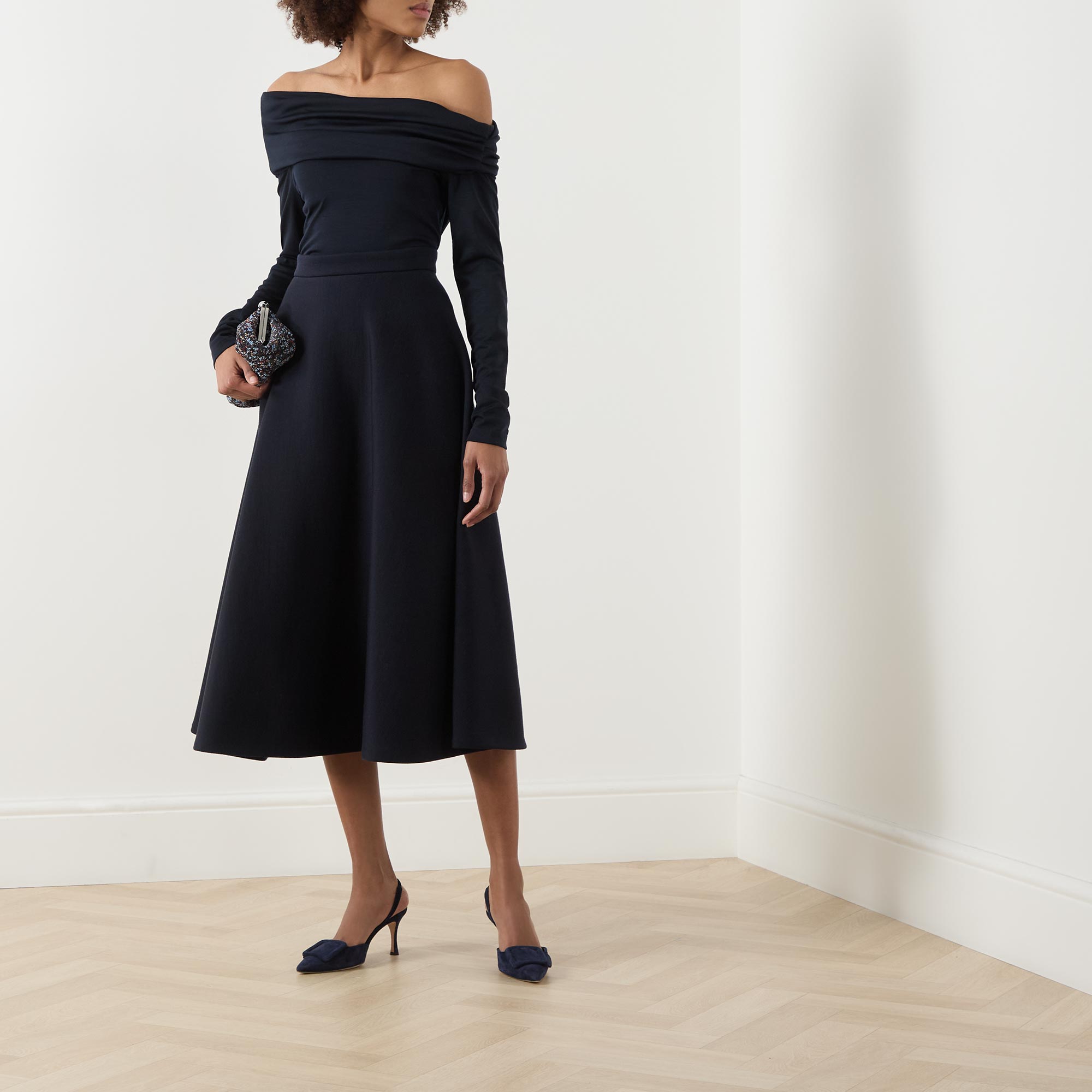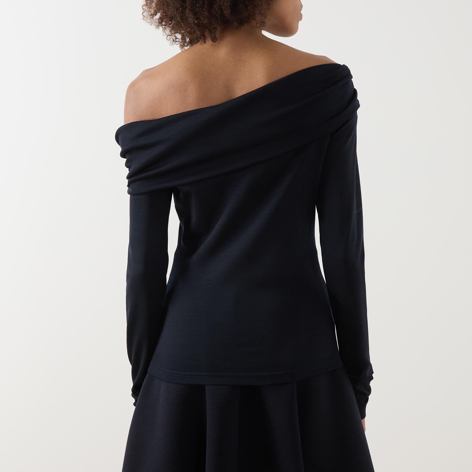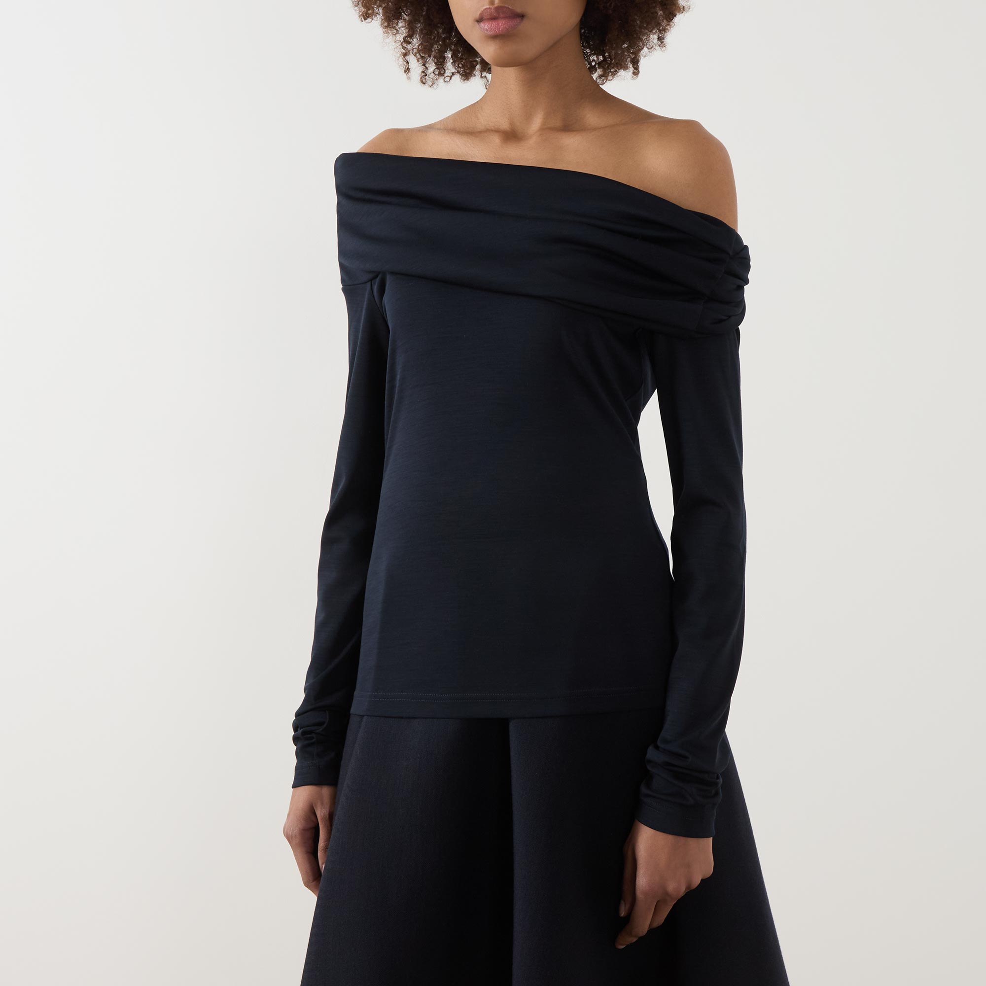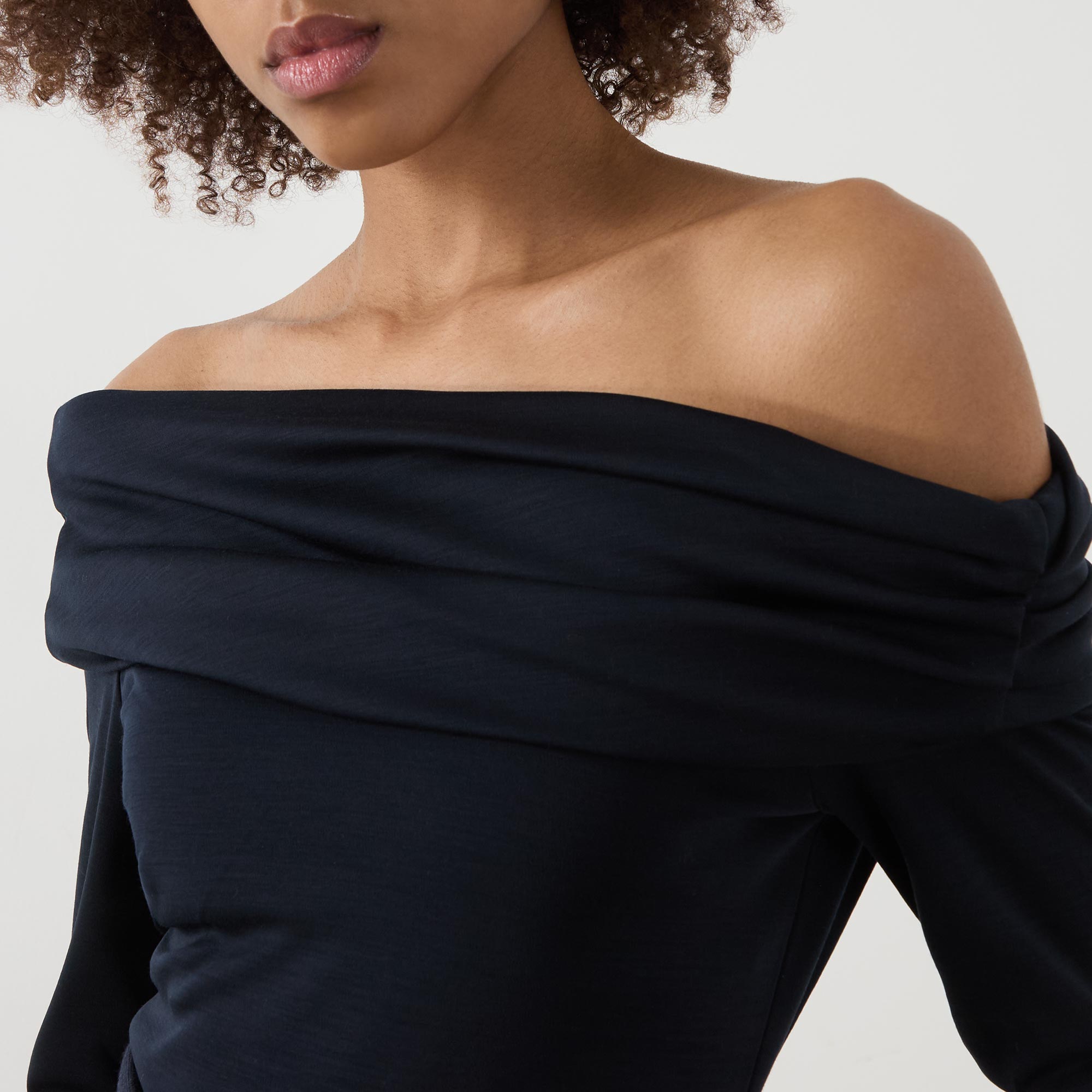 - Off-the-shoulder design, long sleeves, tonal stitching, straight hemline, smooth fabric