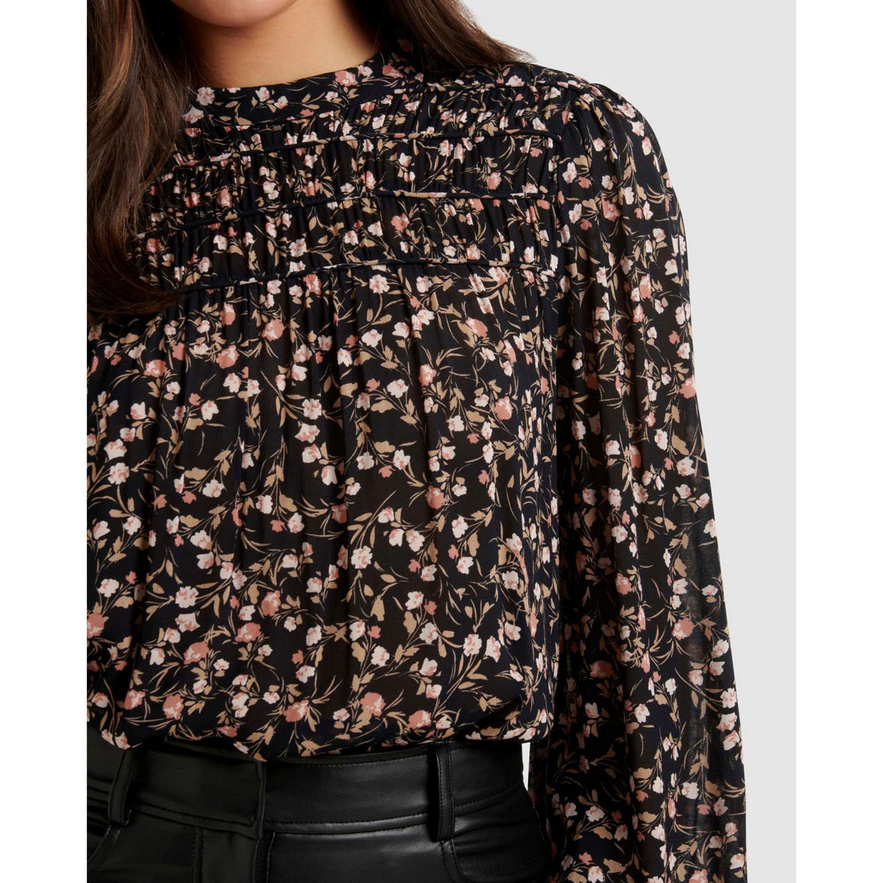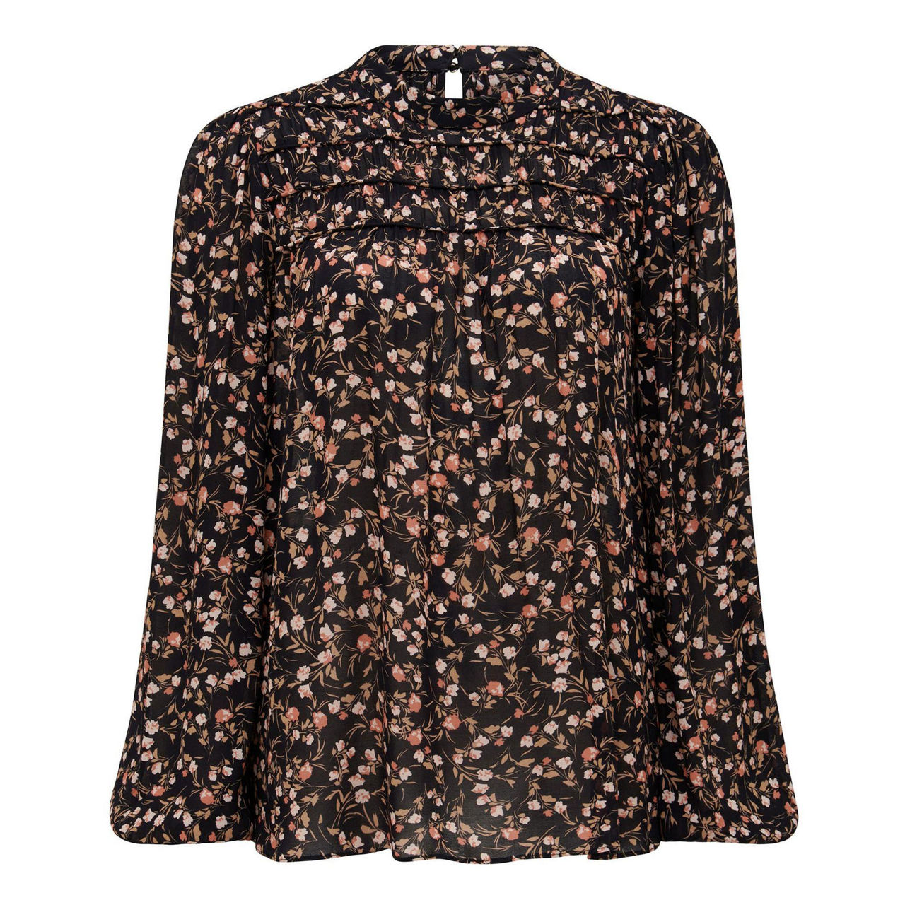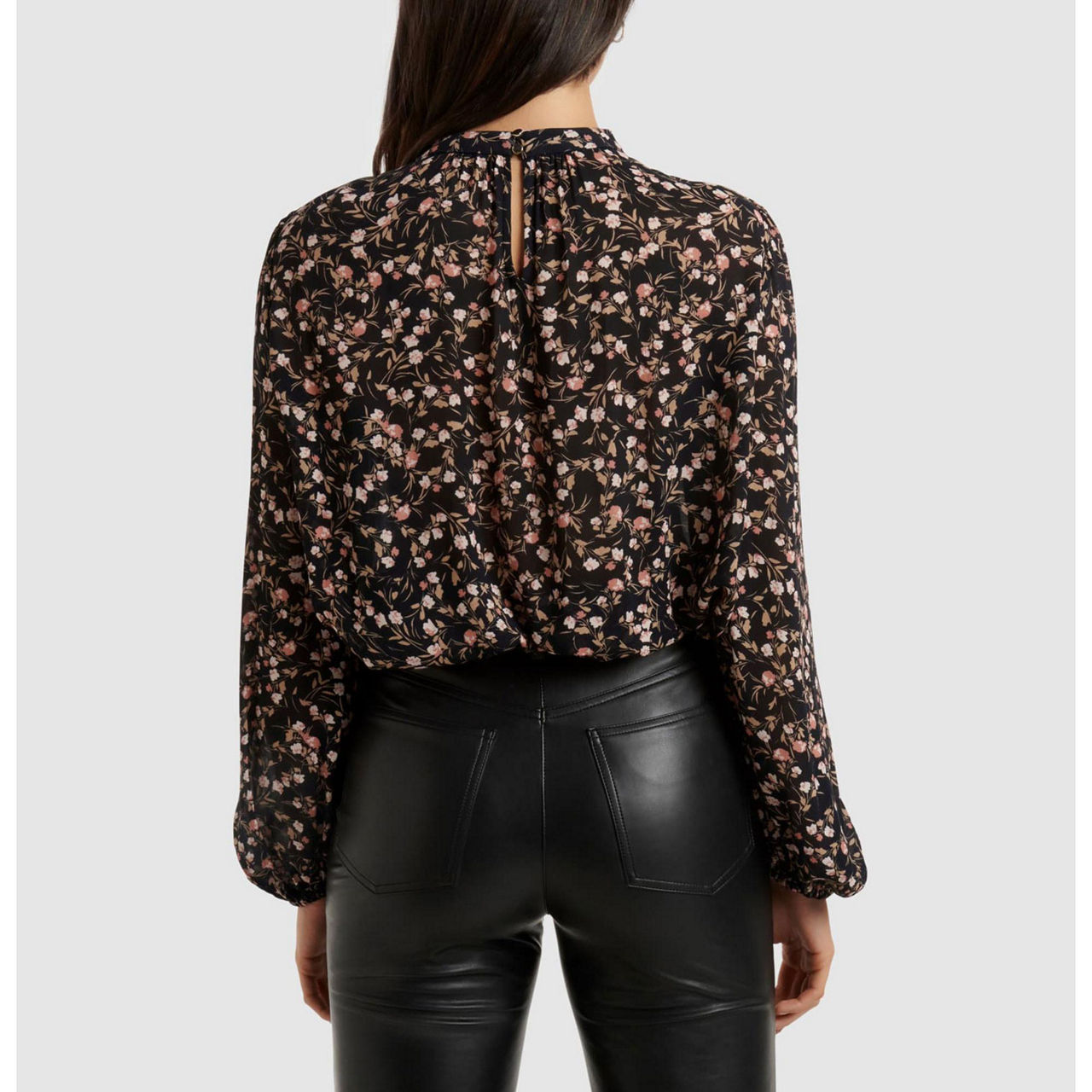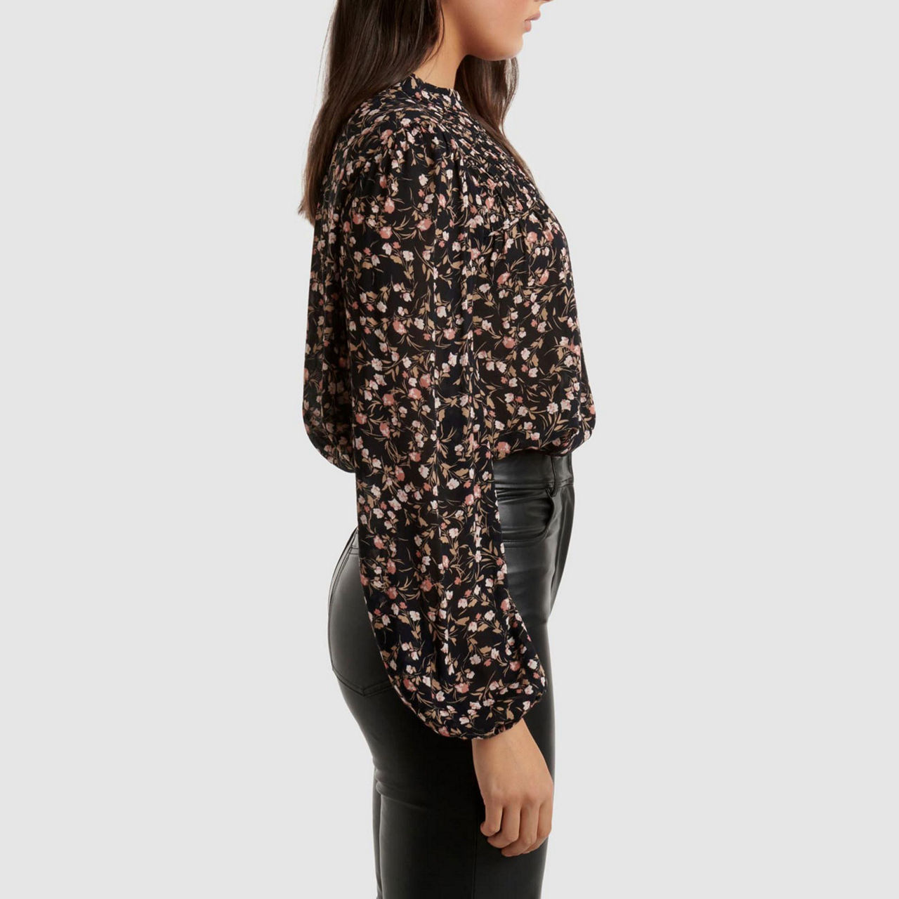 - Long blouson sleeves, high neckline, cord detailing on yoke, back keyhole and button fastening, floral pattern, woven fabric