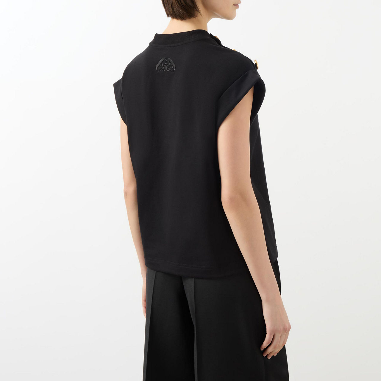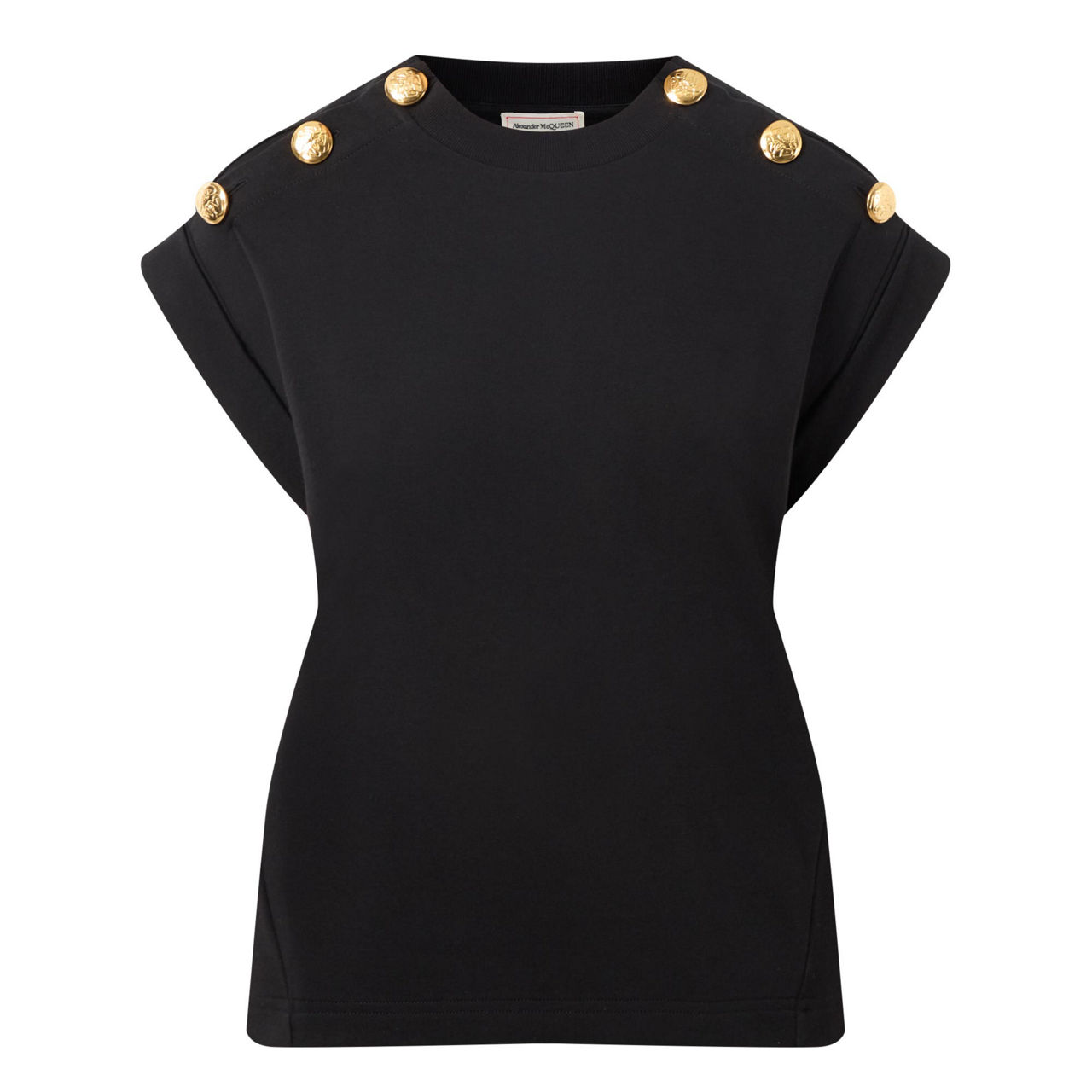 Alexander McQueen is no stranger to a structured design with striking embellishments, take this T-shirt. Crafted from pure cotton and spun to a straight fit, it features epaulette detailing with gold-tone buttons and short, turn-up sleeves.