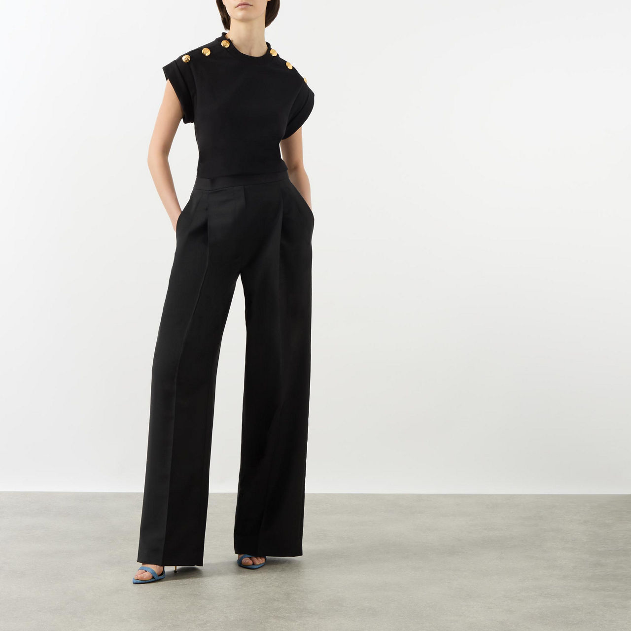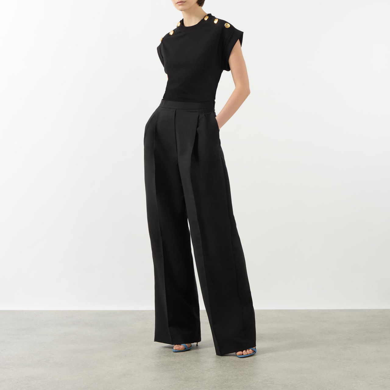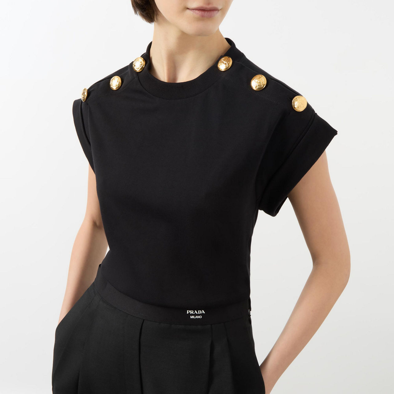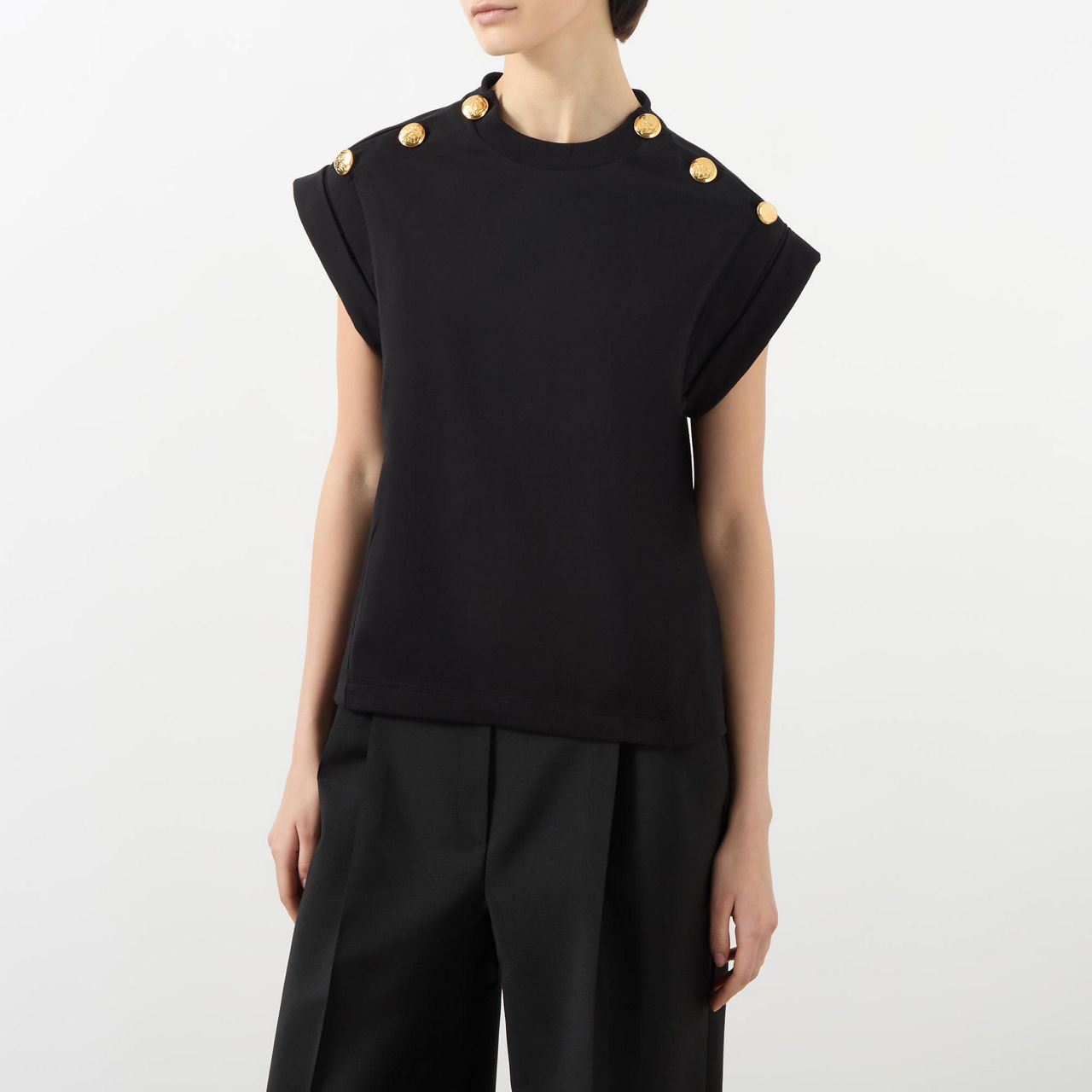 - Crew neck, gold-tone button detailing on the shoulders, short turn-up sleeves, straight hem