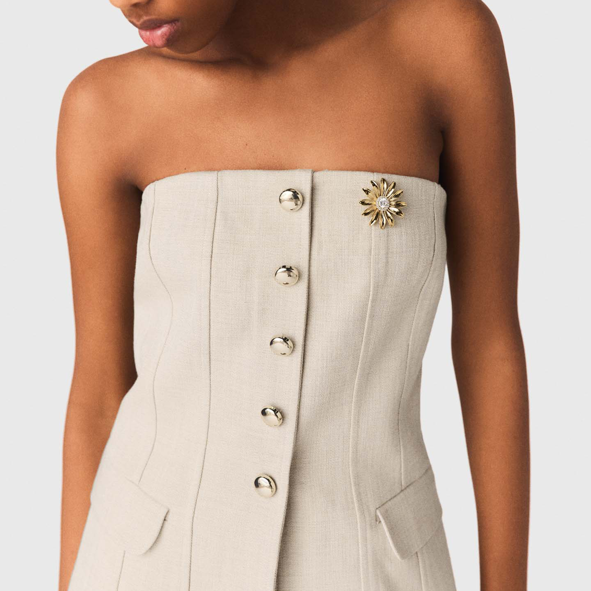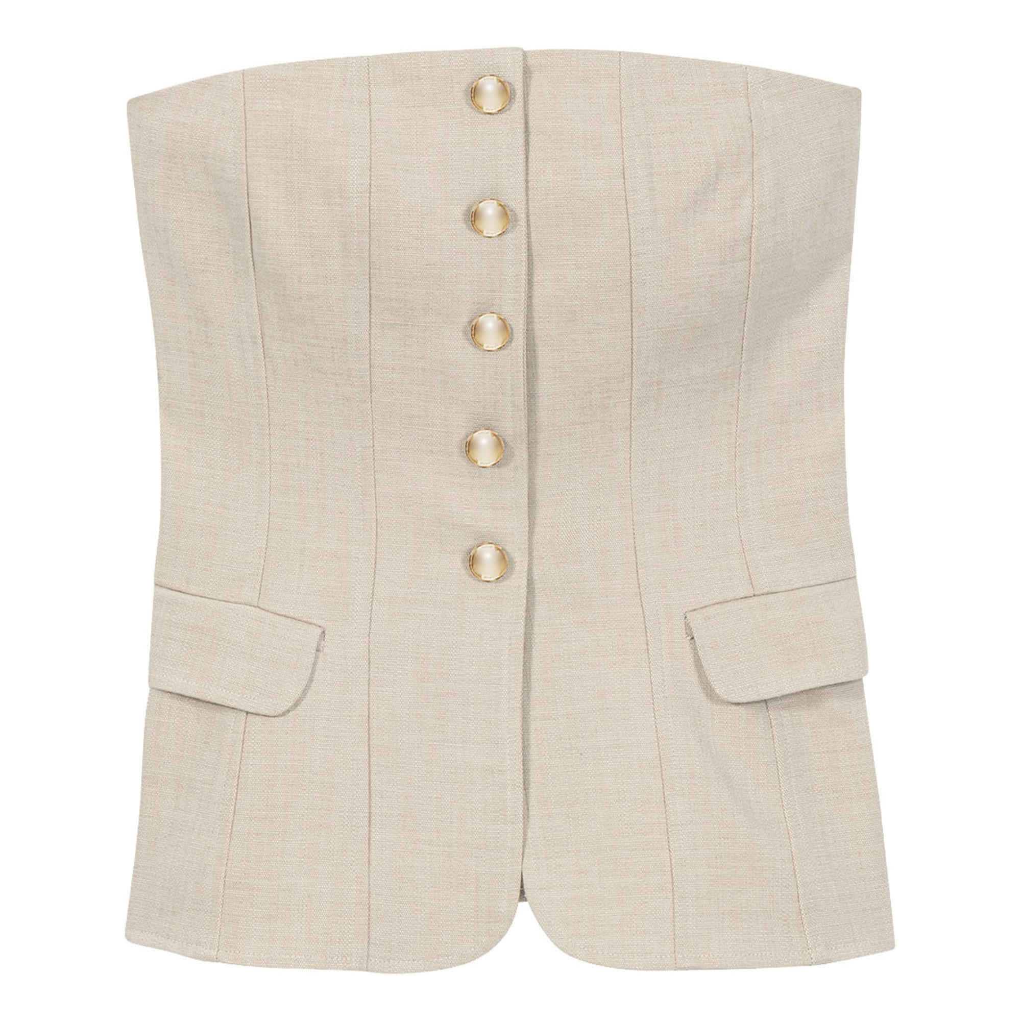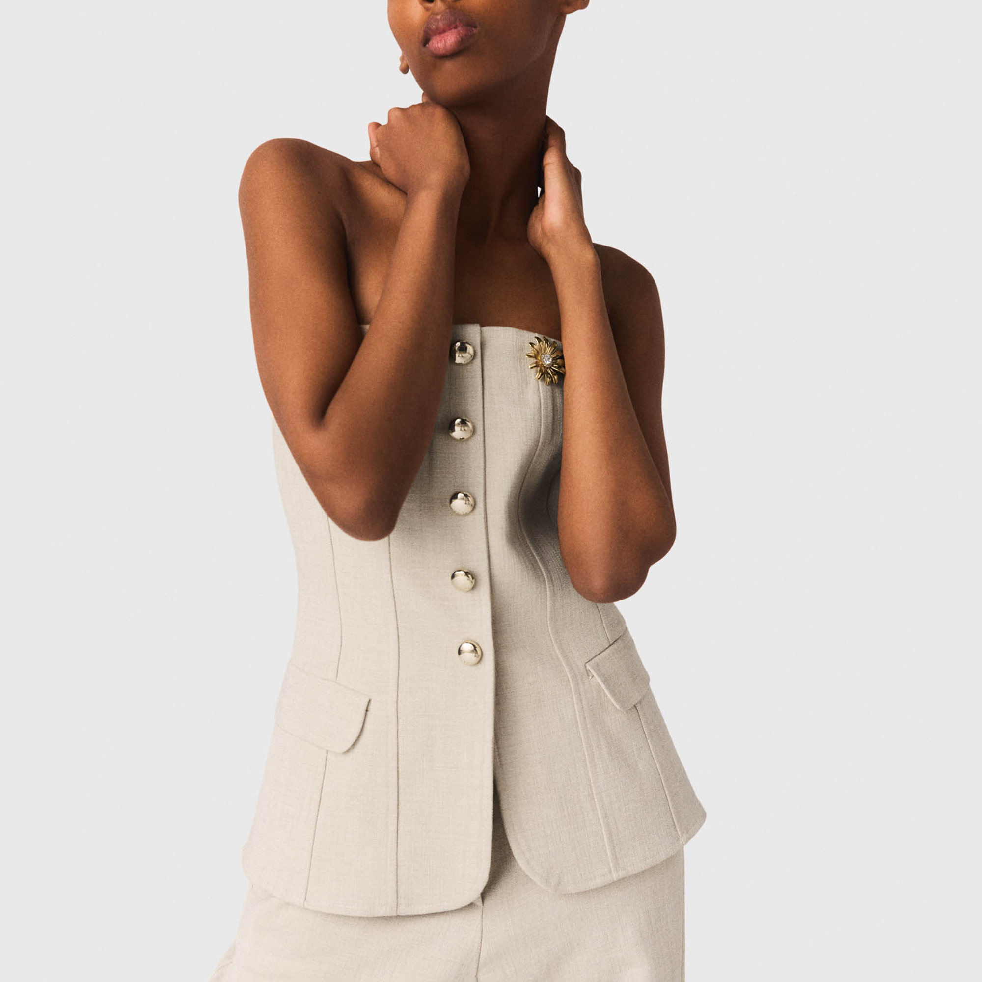 - Tailored-style, bustier design, waistcoat-style pointed hem, five gold-tone domed buttons, mock pocket flaps, gold-tone zip fastening at the back, textured, princess seams