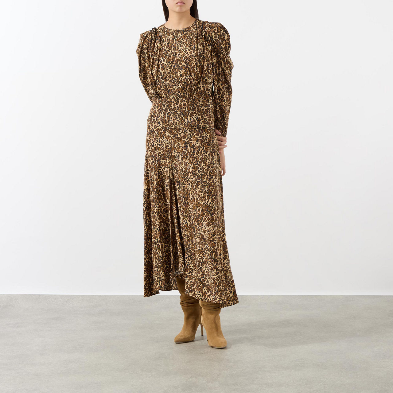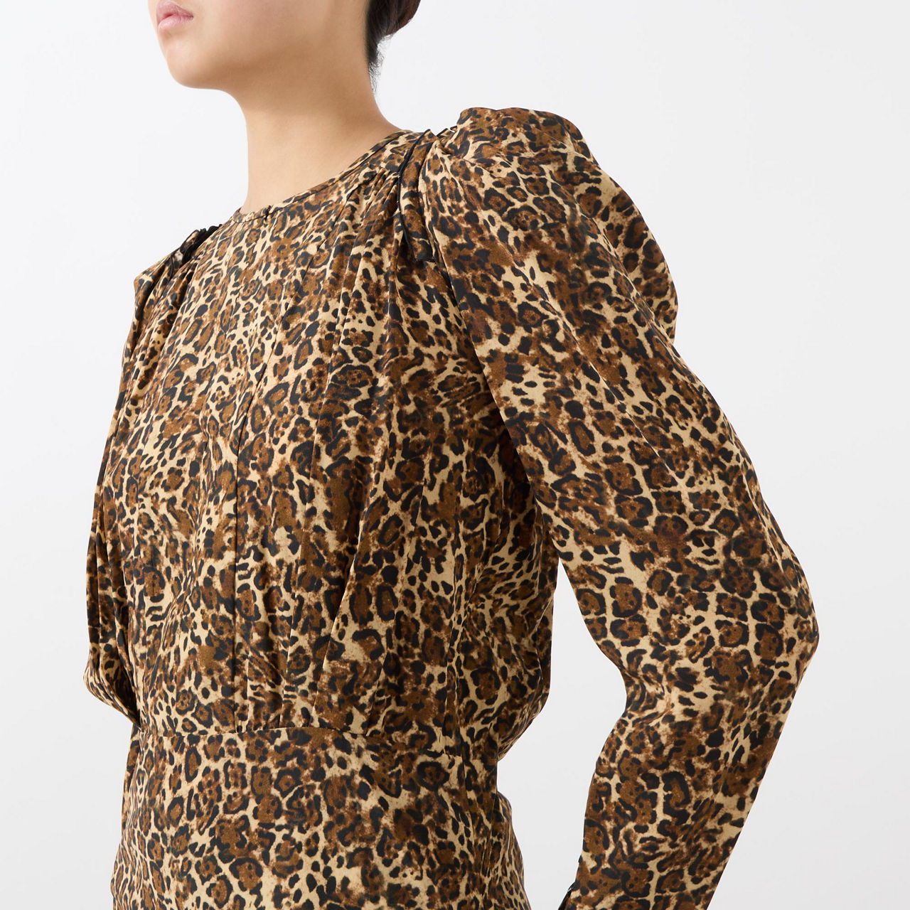 - Round neckline, drop opening, structured shoulders with pleated detail, long sleeves, side zip fastening, fitted through the waist, leopard print pattern
