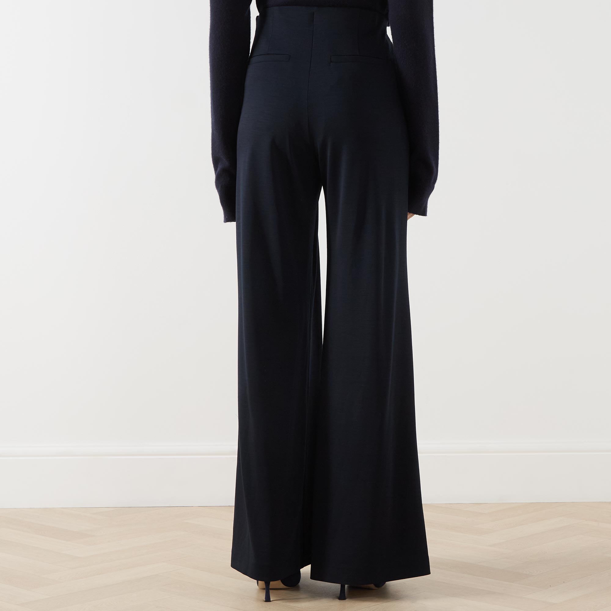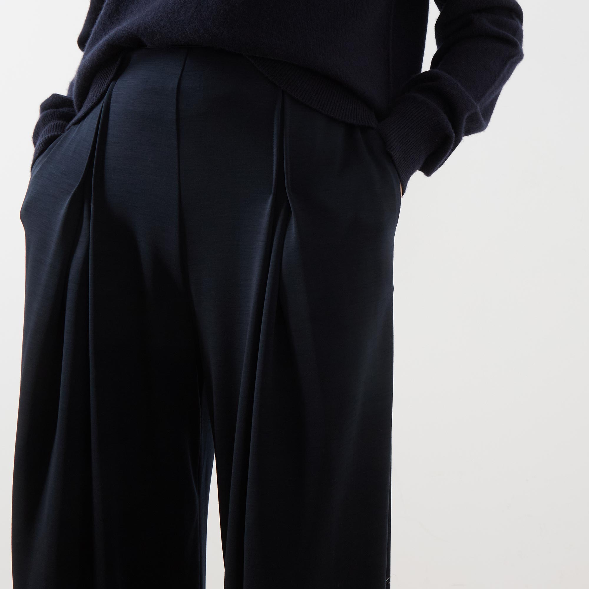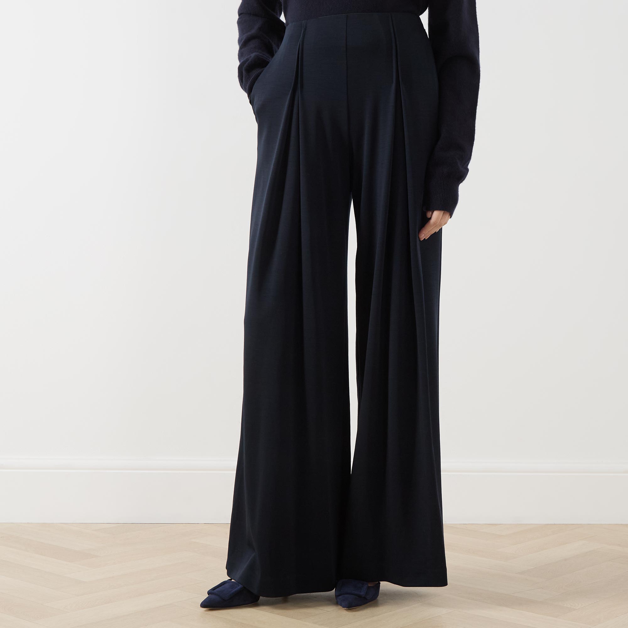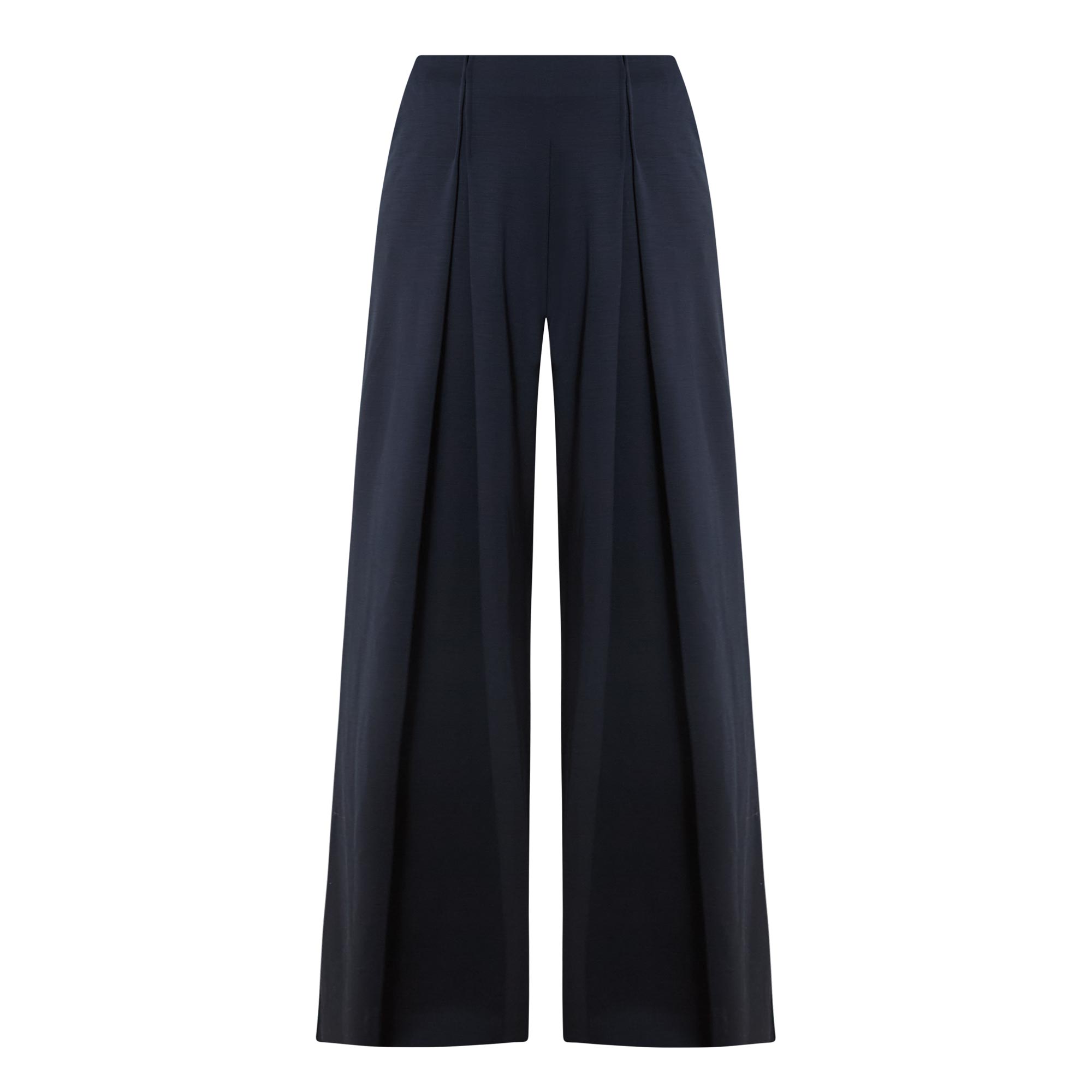 - Internal elasticated waist, concealed zip fastening to the side, side entry pockets, rear pockets, deep reverse pleats, wide-cut legs