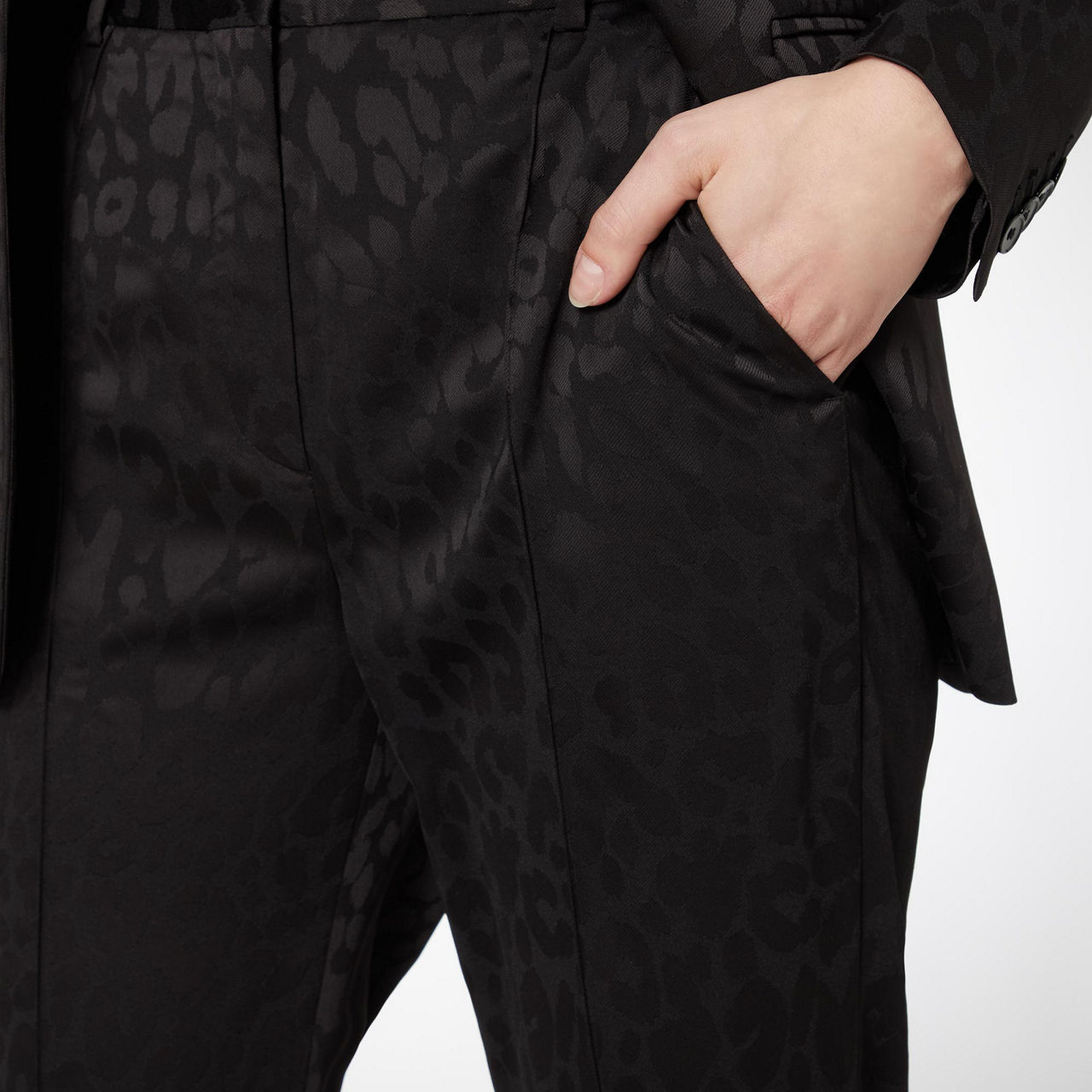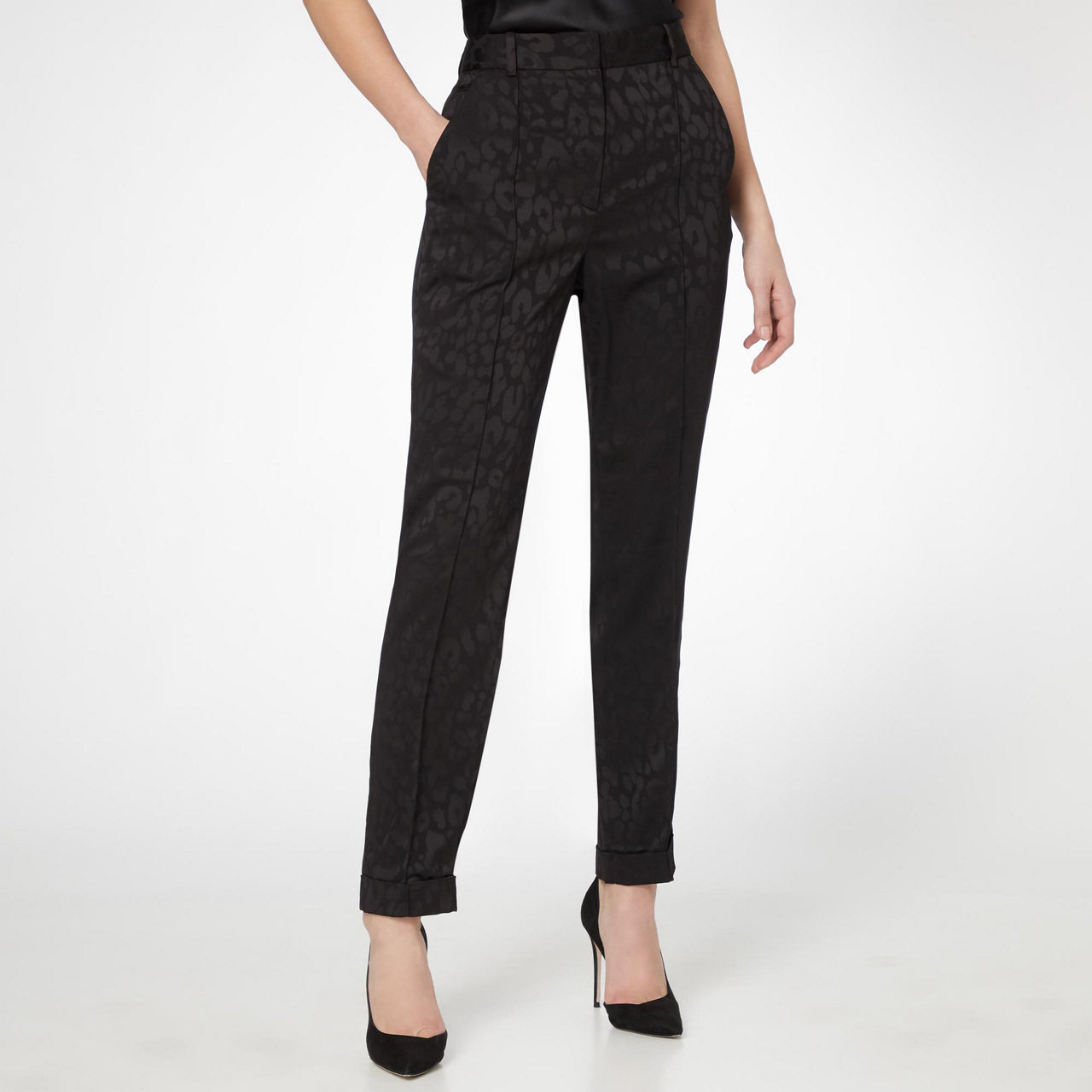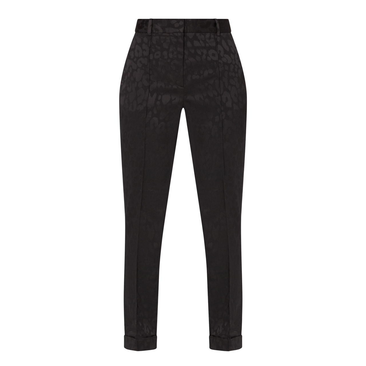 - Straight leg, leopard print, cropped length, four slip pockets, belt hoops, front pleats.