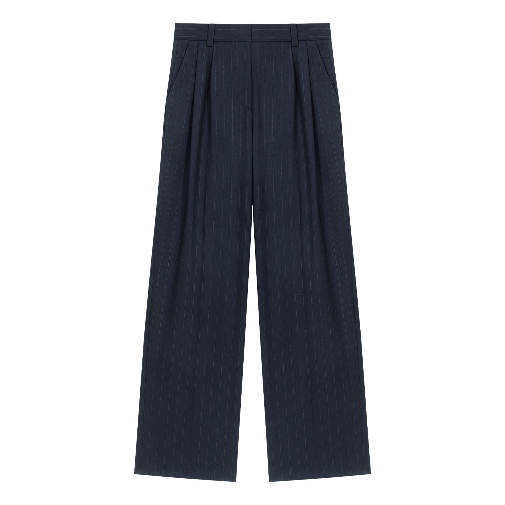 • Striped, wide-leg silhouette, pinstripes, front double pleats, Italian side pockets