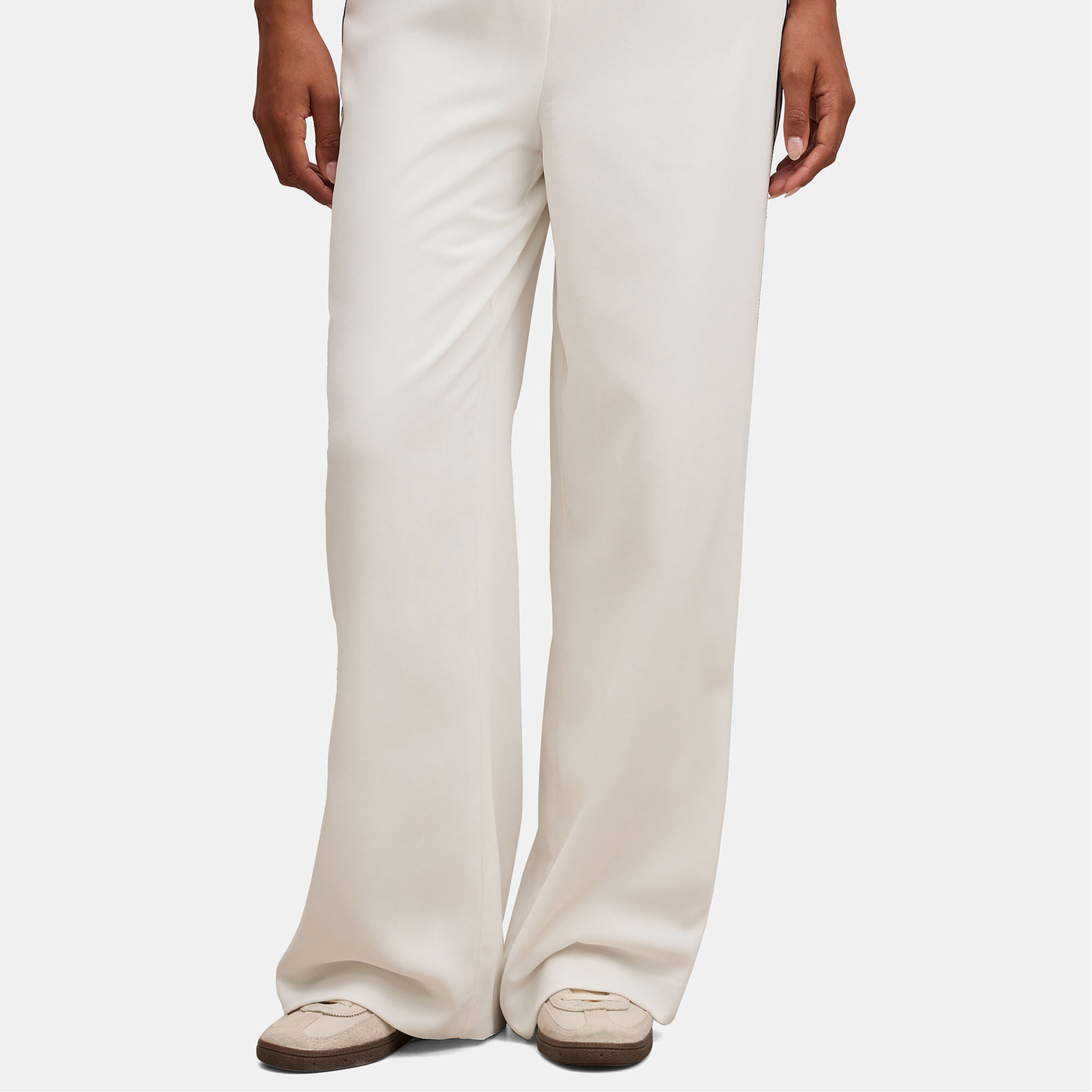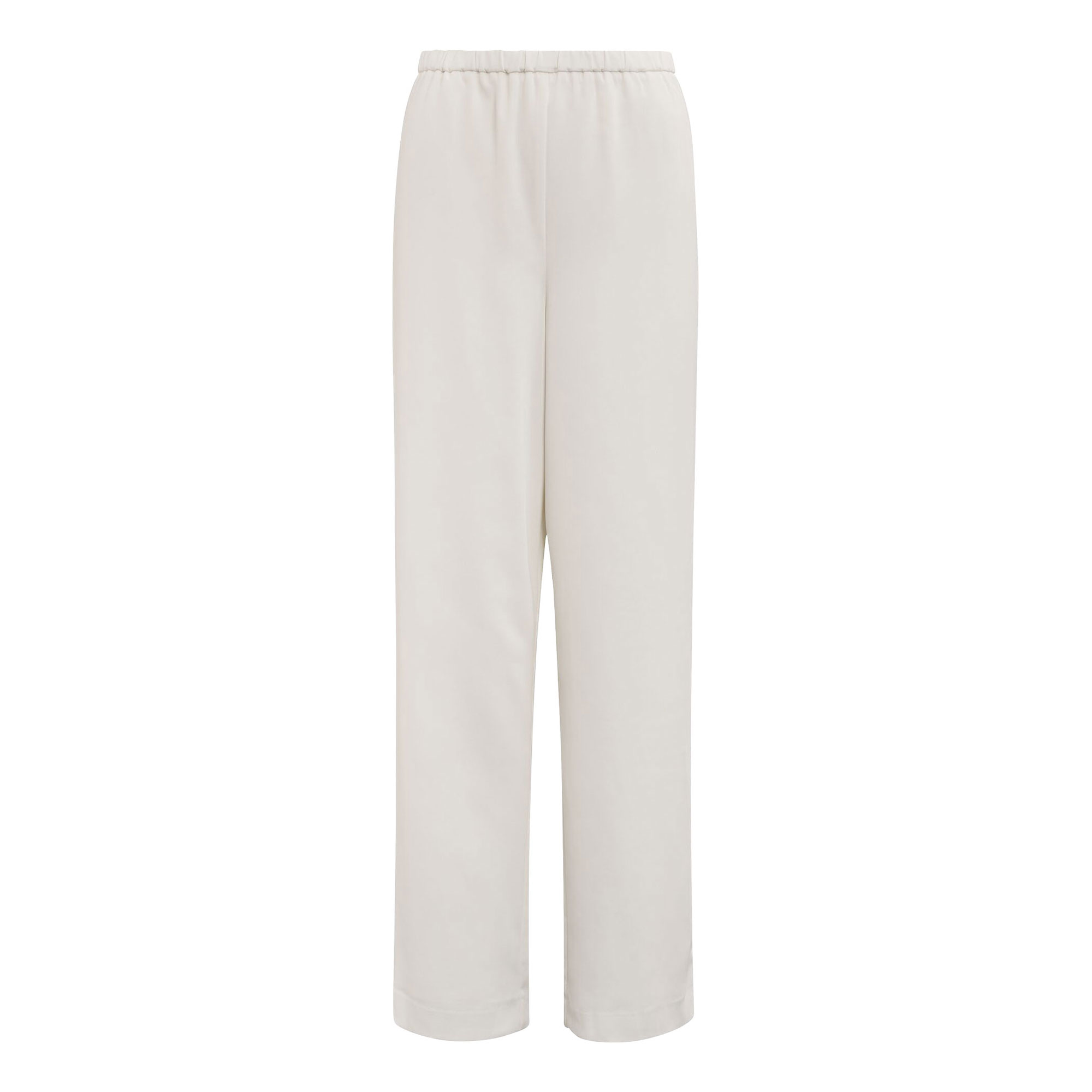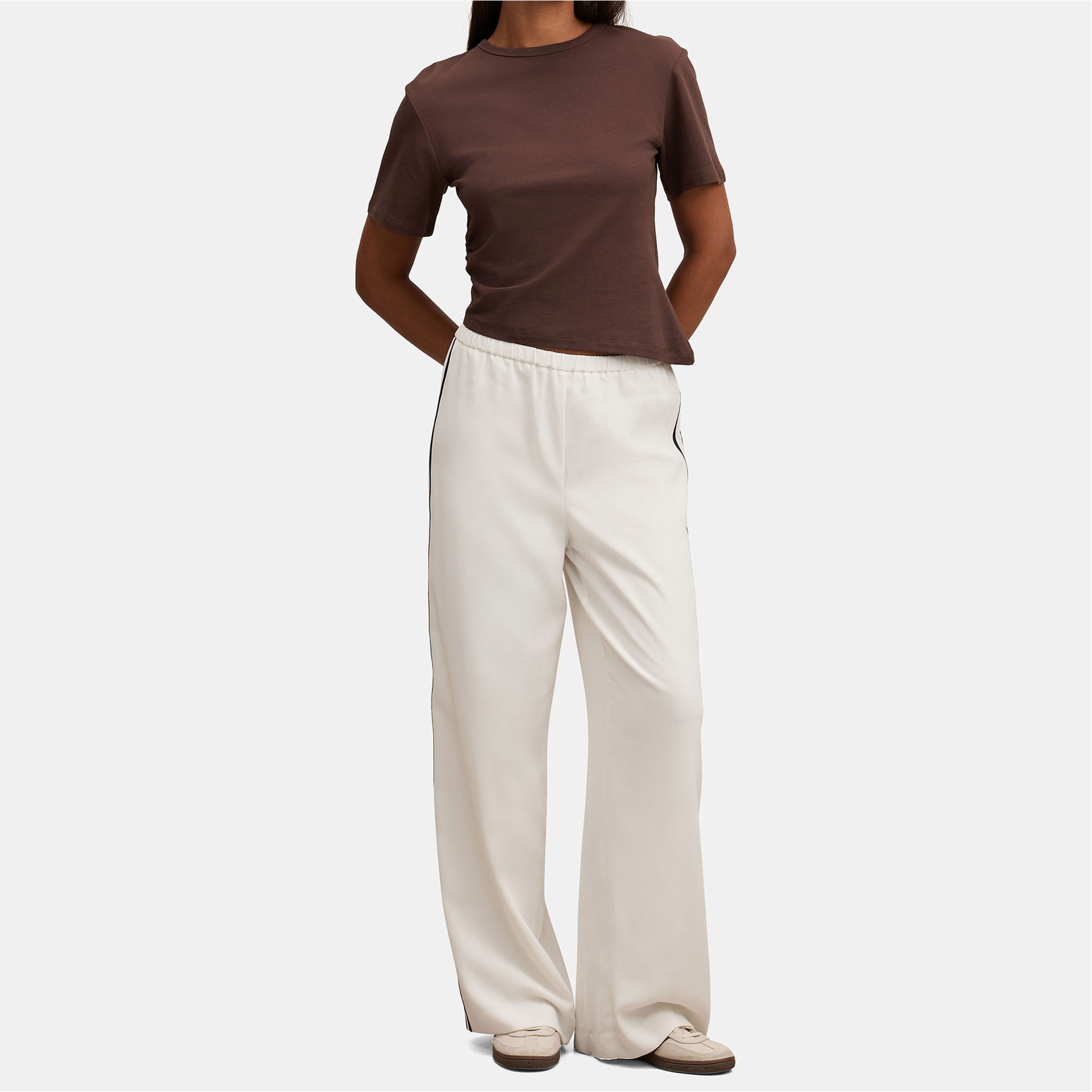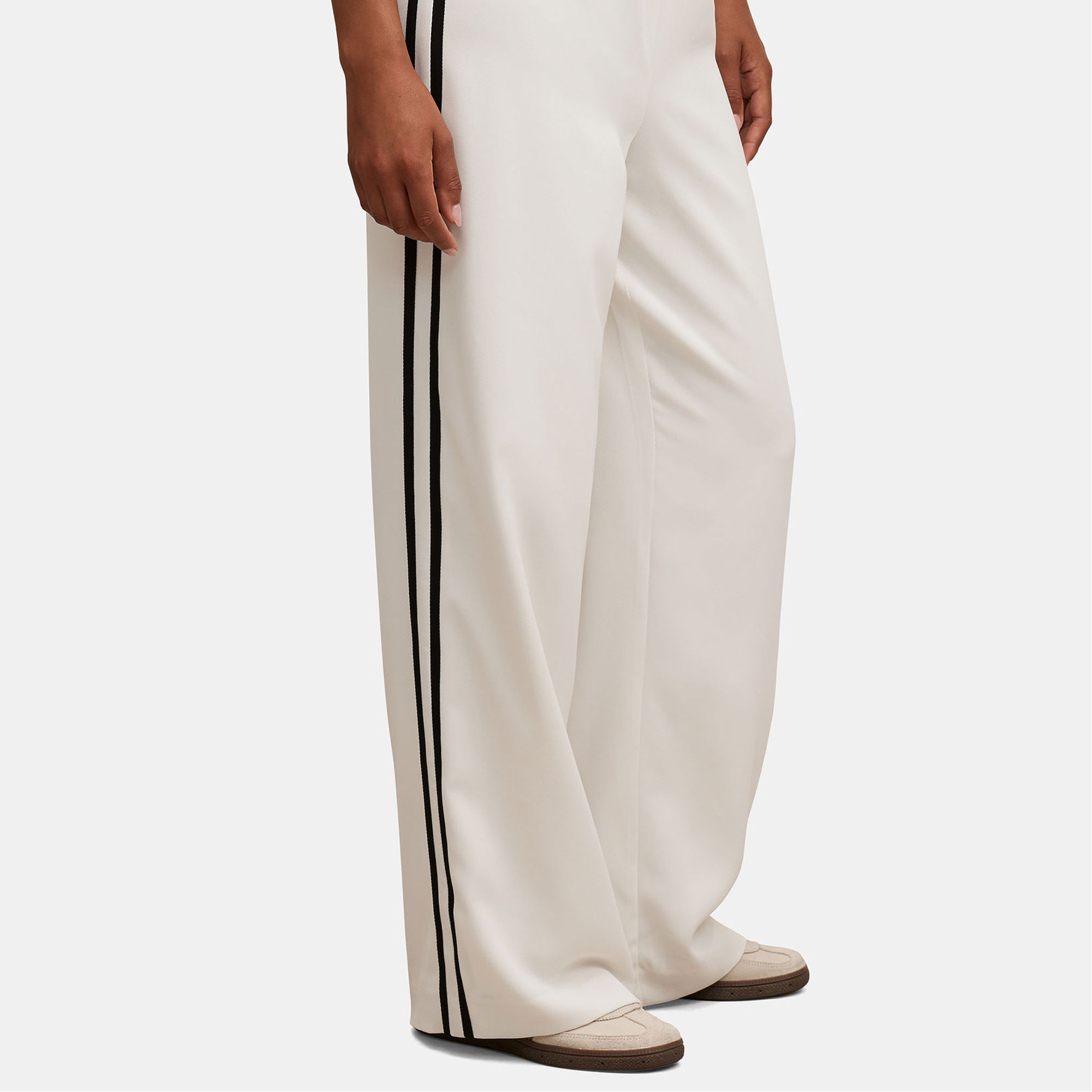 - Elasticated waistband, smooth woven fabrication, straight-leg silhouette, rear welt pockets, side stripe detail, slip-on style