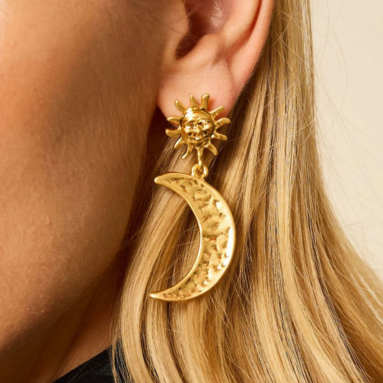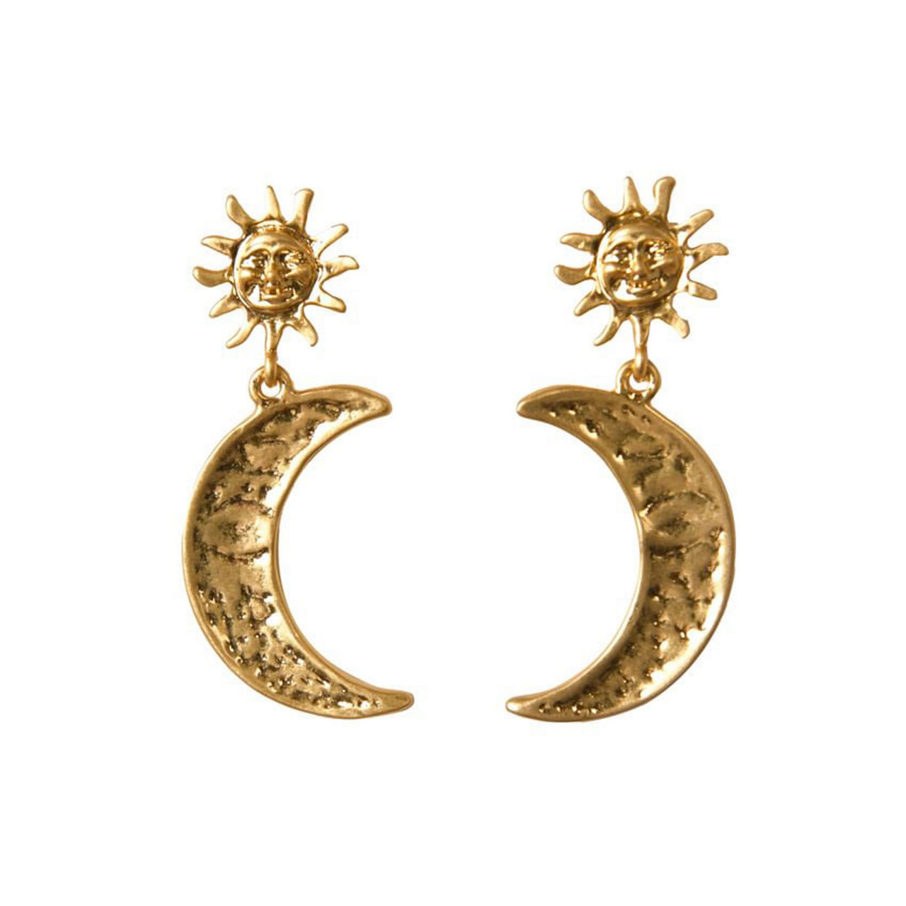 - 18-karat gold-plated brass, hammered design, sun and moon charms, drop style, butterfly fastening