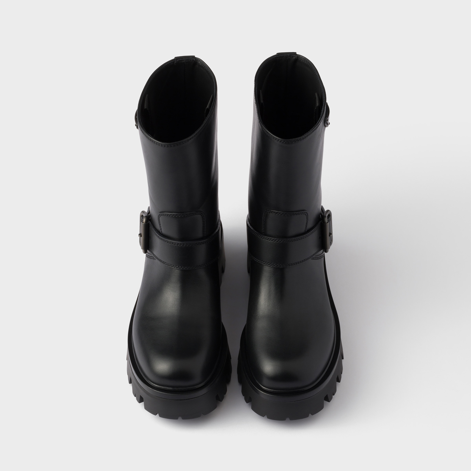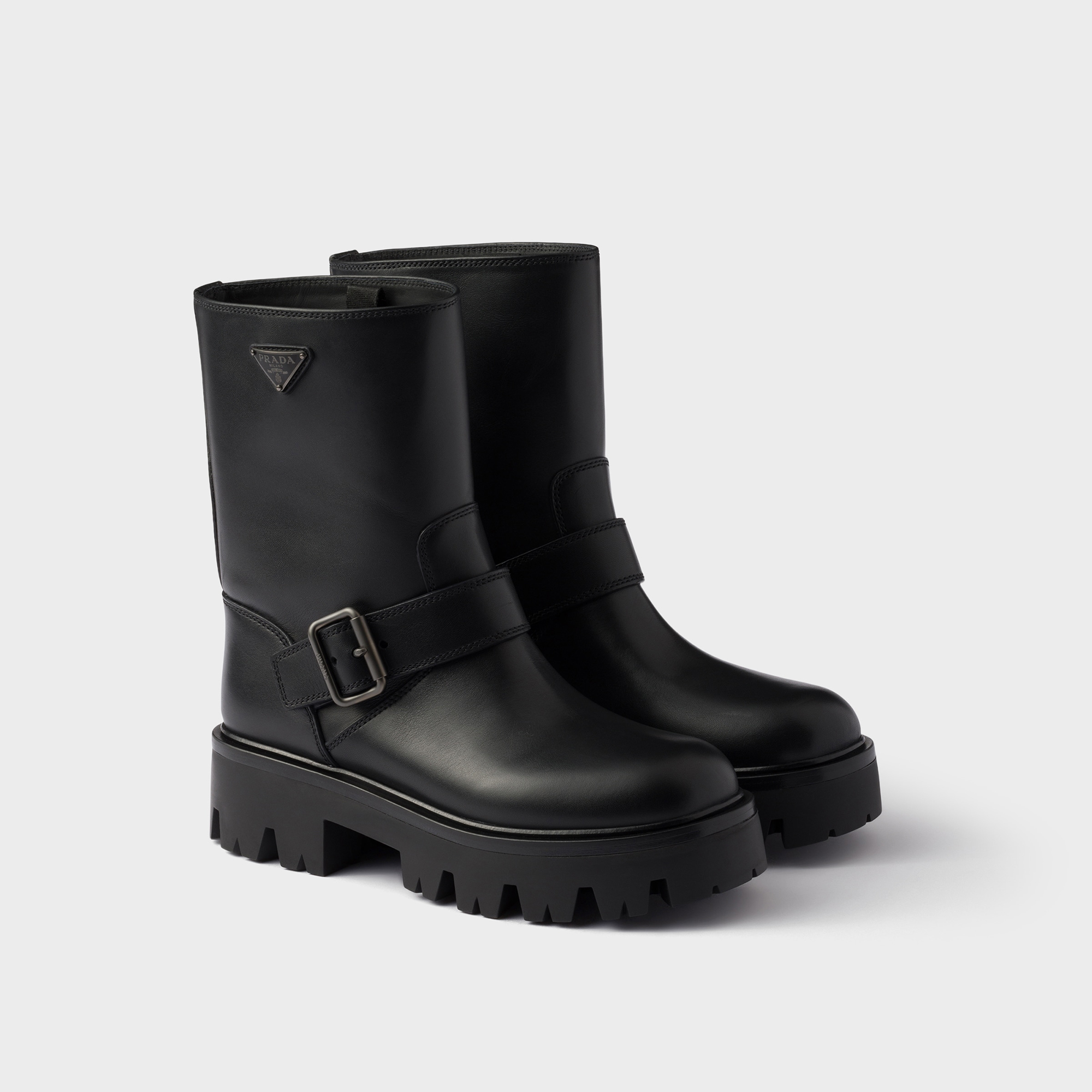 - Logo-engraved metal buckle, leather lining, enamelled metal triangle logo detail, monoblock rubber sole, hot stamped logo lug tread