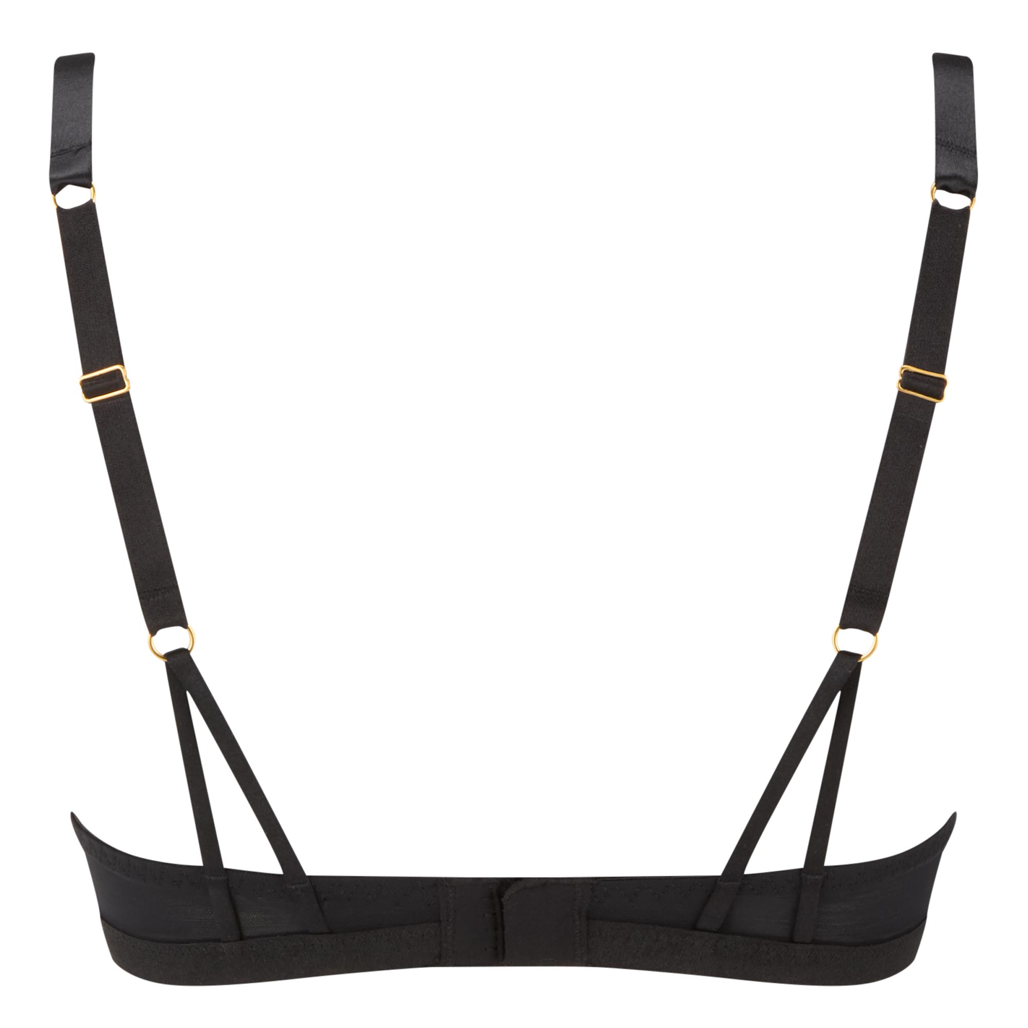 - Under wired design, adjustable straps, French embroidered detailing, gold-tone hardware, lined sides, elastic tulle back, sheer finish