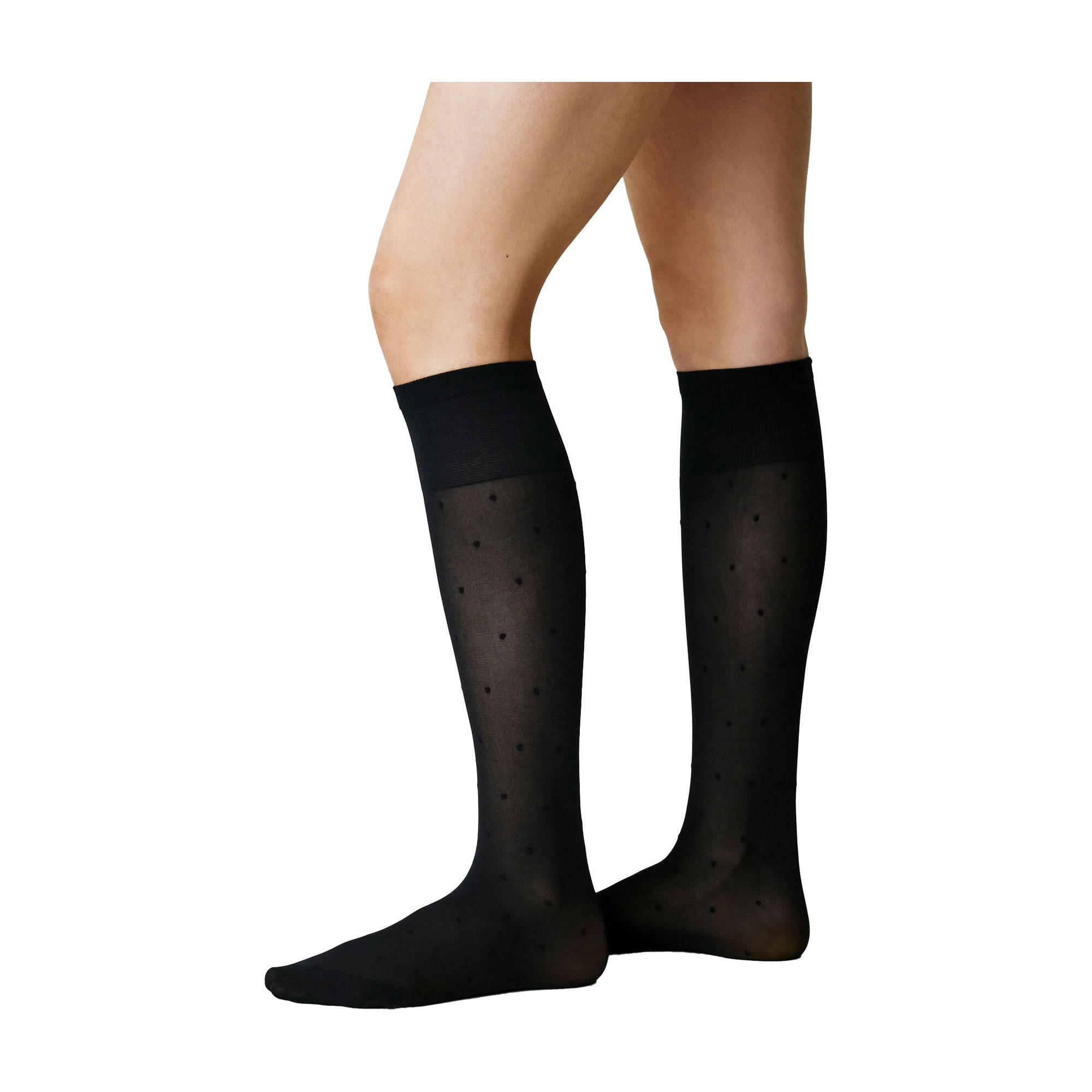 - 40 denier, polka dot print, knee-high style, semi-sheer, soft feel, broad cuff, toe reinforcement