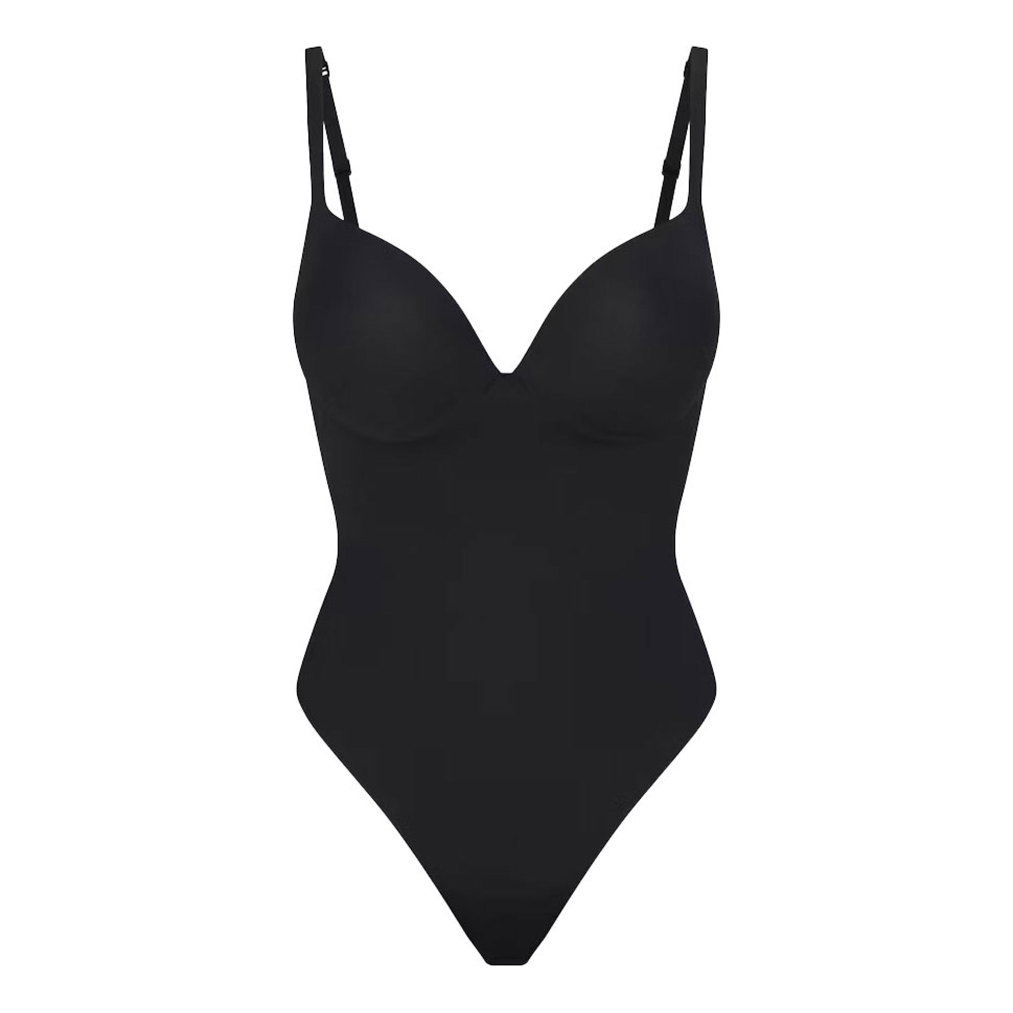 Achieve the iconic SKIMS silhouette in one step. This thong bodysuit with a plunge neckline combines the brand’s signature Body contouring fabric with Ultimate Bra. Premium teardrop-shaped foam pads create flawless lift, shape, and fullness while power mesh lining at the core and waist sculpts and defines your figure. Features a soft, concealed underwire and adjustable straps for support. Finished with snaps at the gusset and a silicone logo detail.