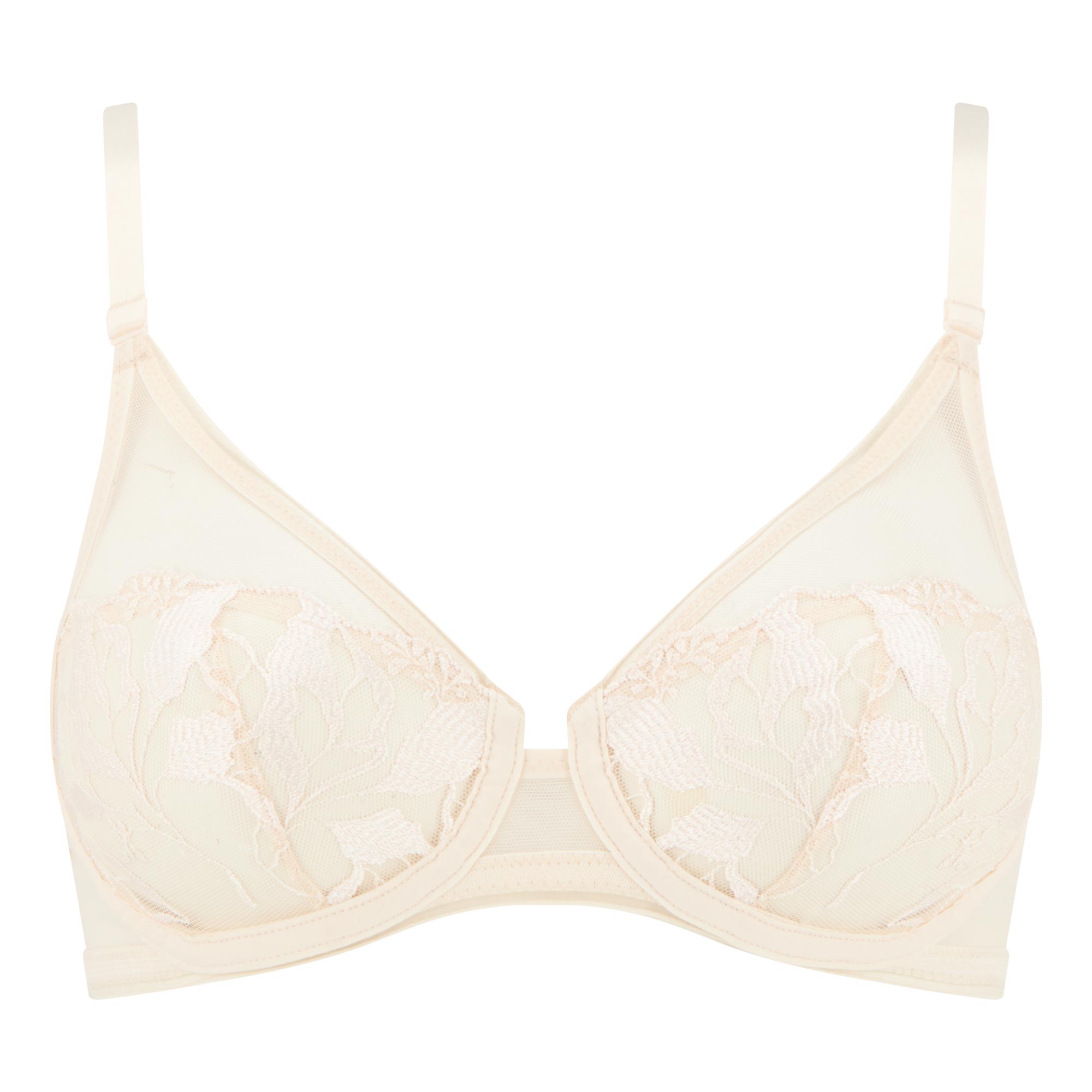 - Adjustable straps, underwired support, sheer lace cups, hook-and-eye fastening, double clasp